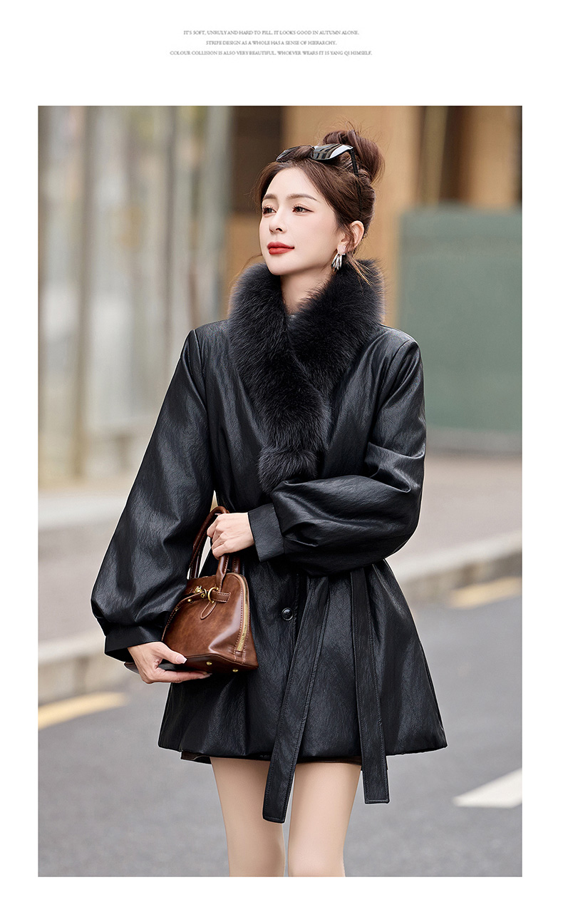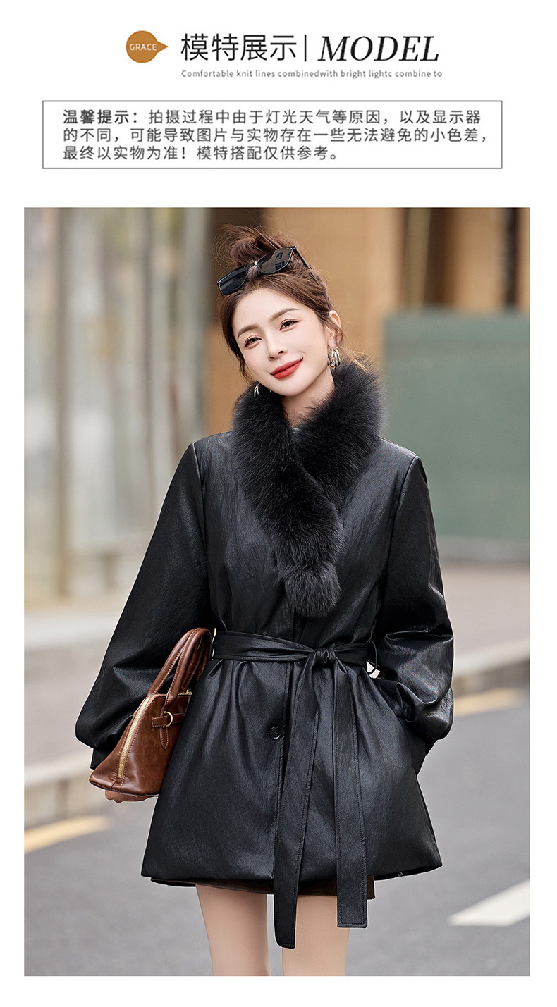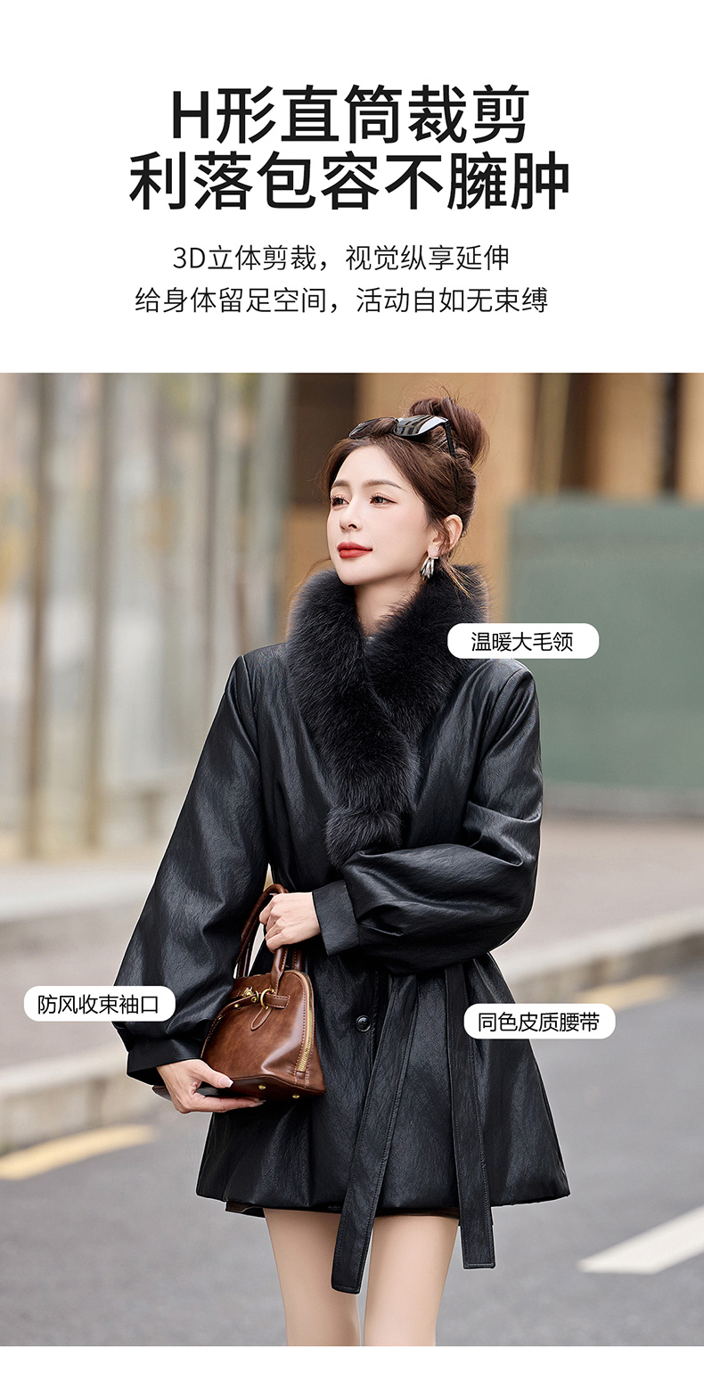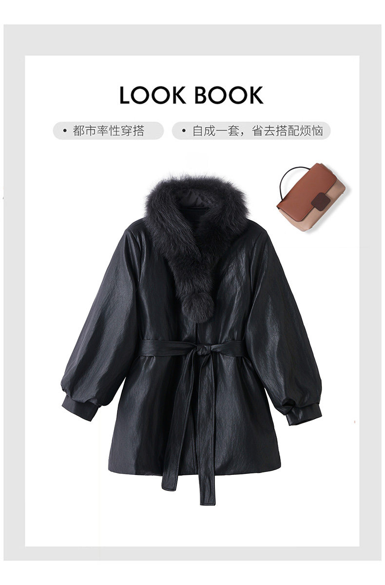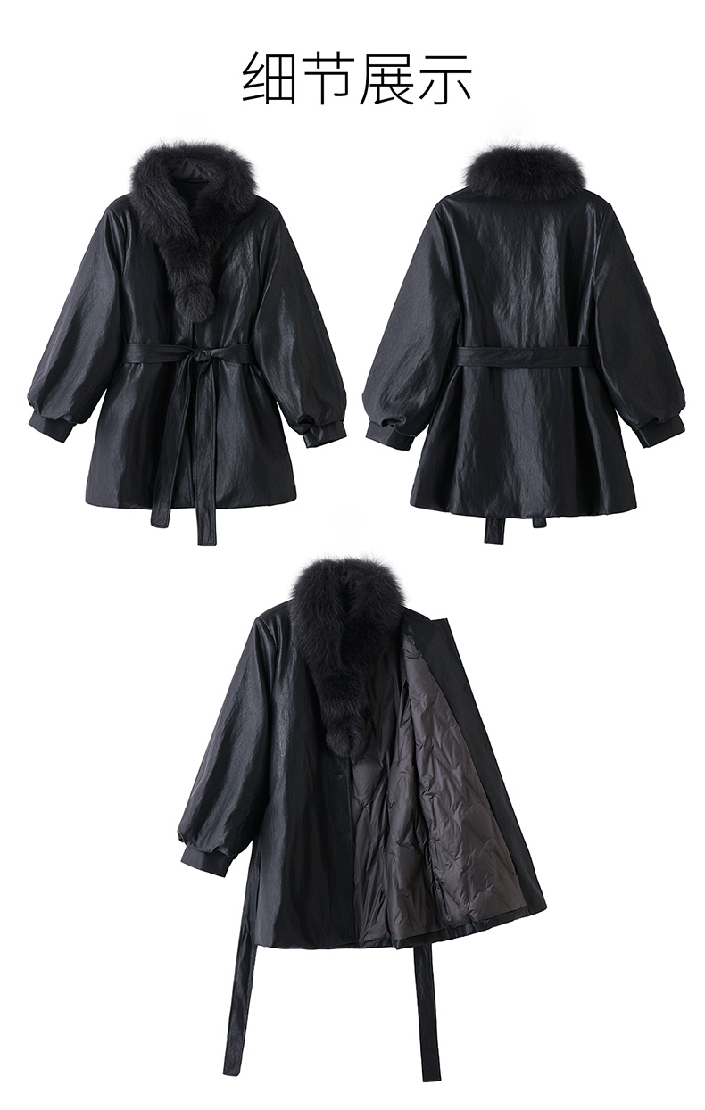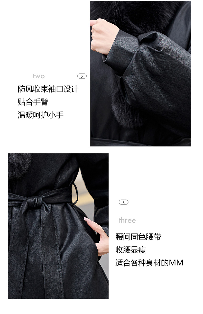 黑色中长款狐狸毛领皮衣,收腰系带气质厚外套羽绒服HR-LNS9789