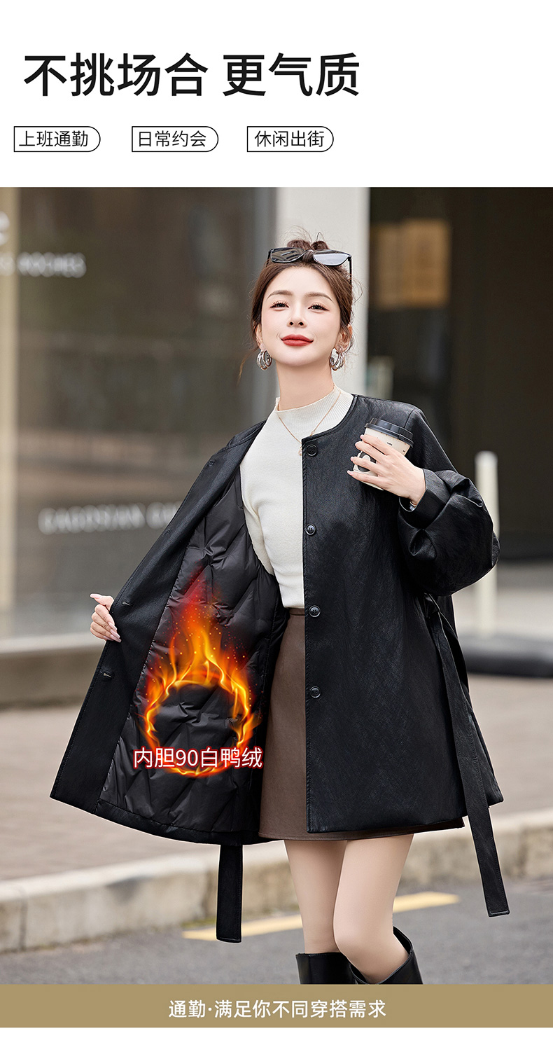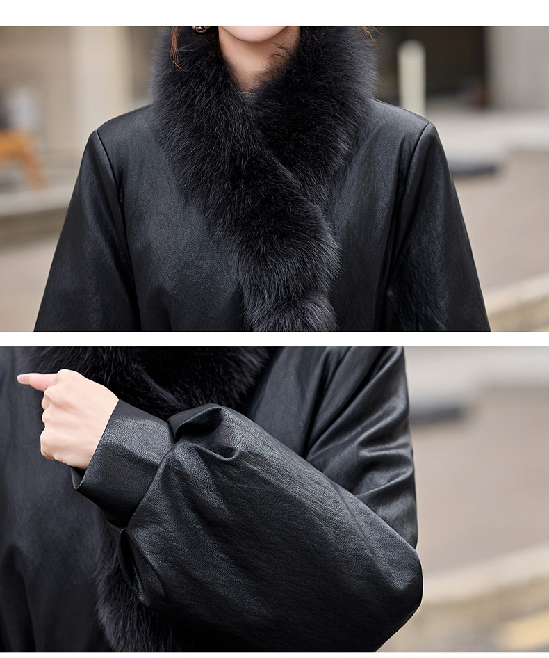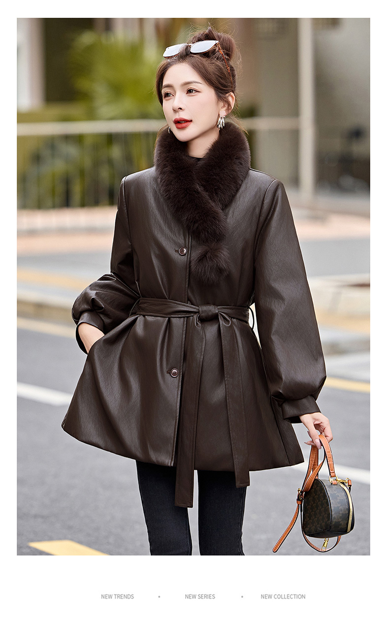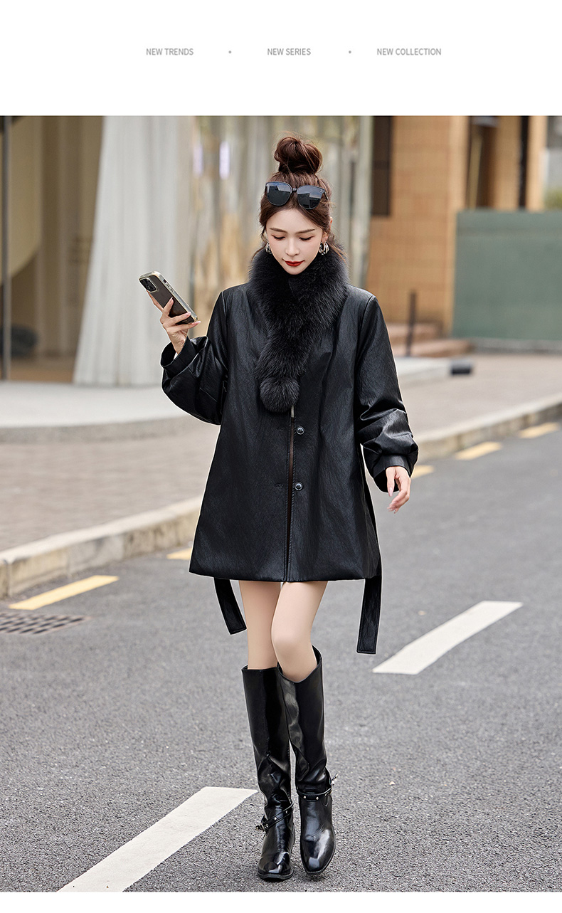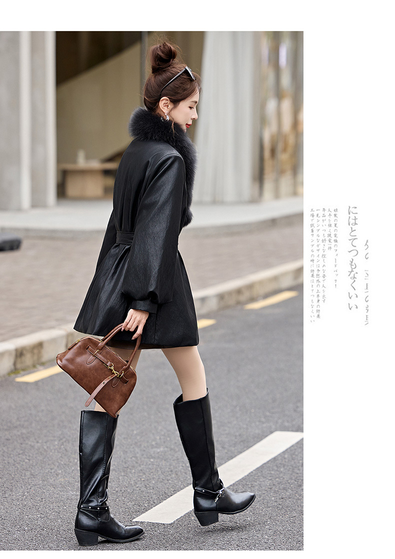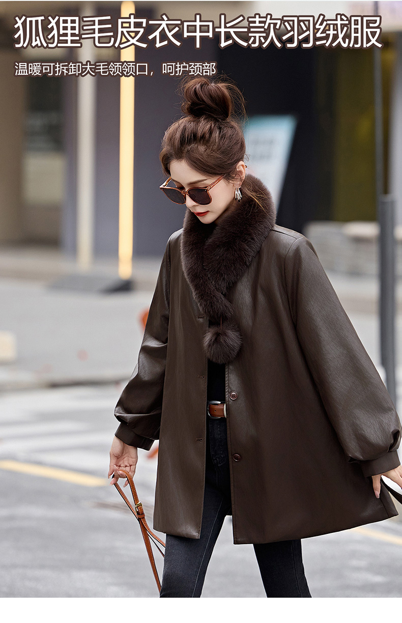 黑色中长款狐狸毛领皮衣,收腰系带气质厚外套羽绒服HR-LNS9789