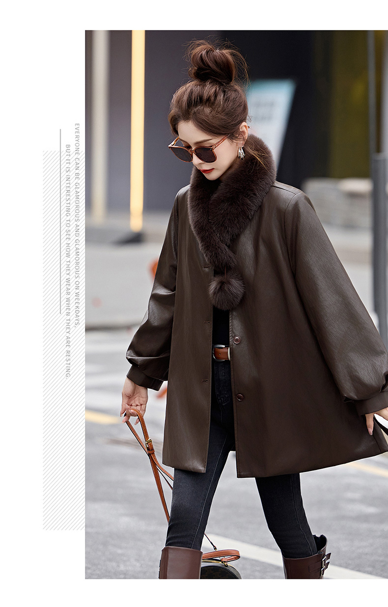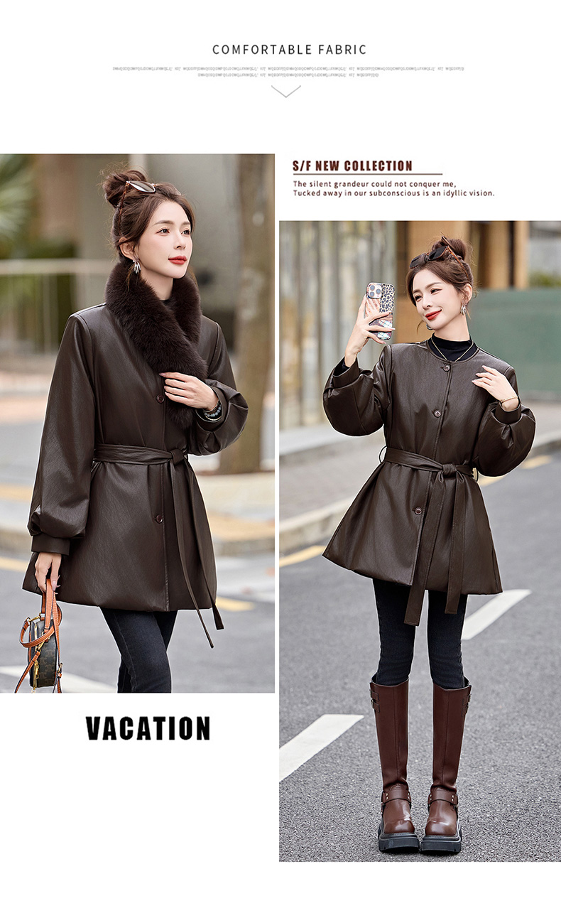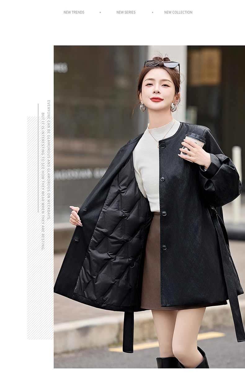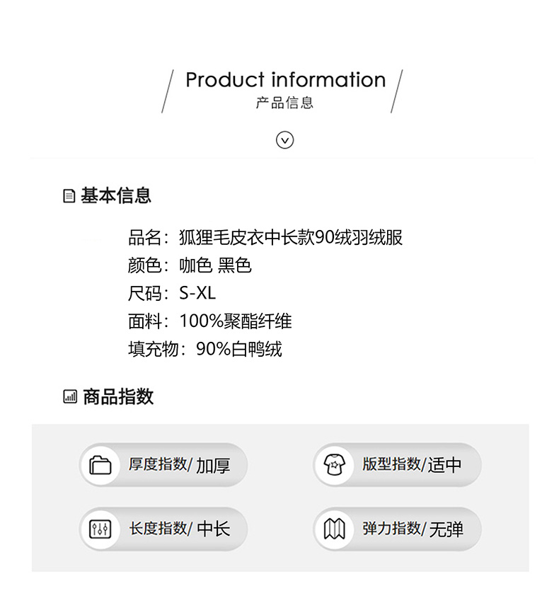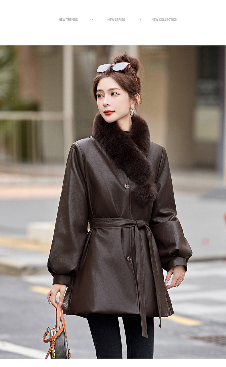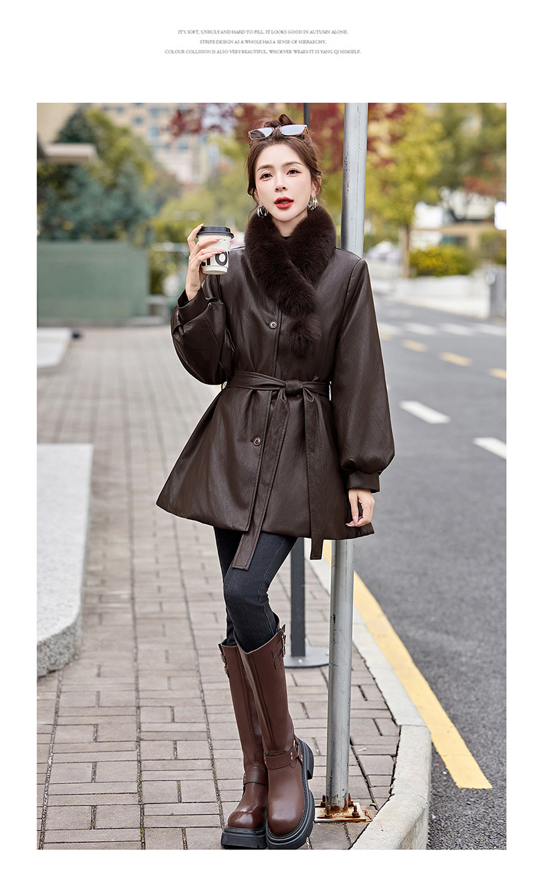 黑色中长款狐狸毛领皮衣,收腰系带气质厚外套羽绒服HR-LNS9789