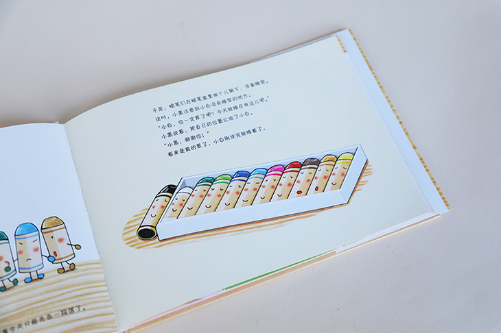 我在育儿的过程中,经常看到小孩子照顾比他更小的孩子的场景。3岁的孩子会教1岁的孩子玩耍、给他穿袜子,小家伙也会依赖大一点的孩子,从他那里学到很多。这些都是让人会心微笑的成长场景。想起来这些,我就觉得可以把有年龄差的孩子之间的交流放在《蜡笔小黑》的绘本中描绘。蜡笔小黑和伙伴们照顾小小的白蜡笔“蜡笔小白”的故事就这样诞生了。——中屋美和谈创作缘起