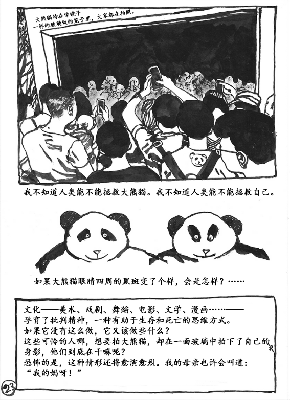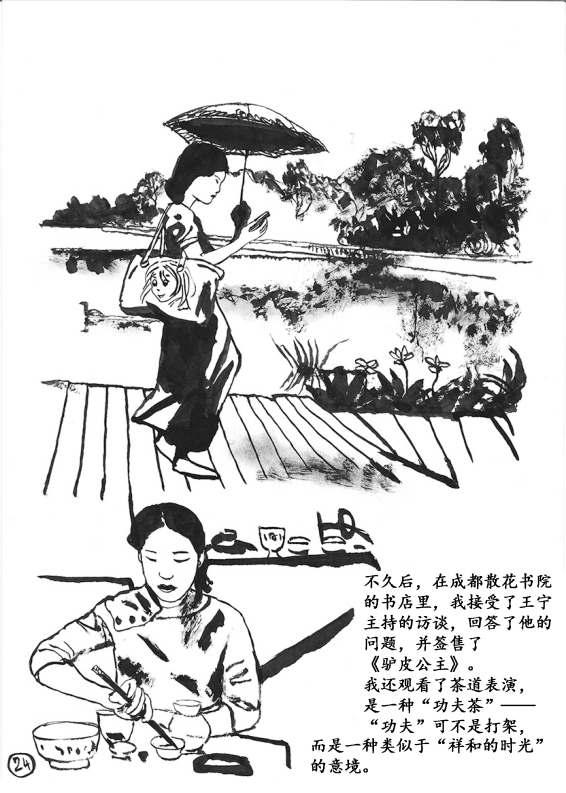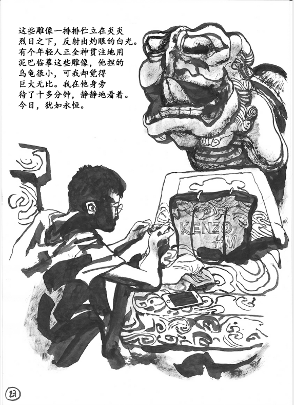 品很少使用文字对话,绝大部分使用毛笔和墨绘画创作。流畅的笔锋,熟练的技