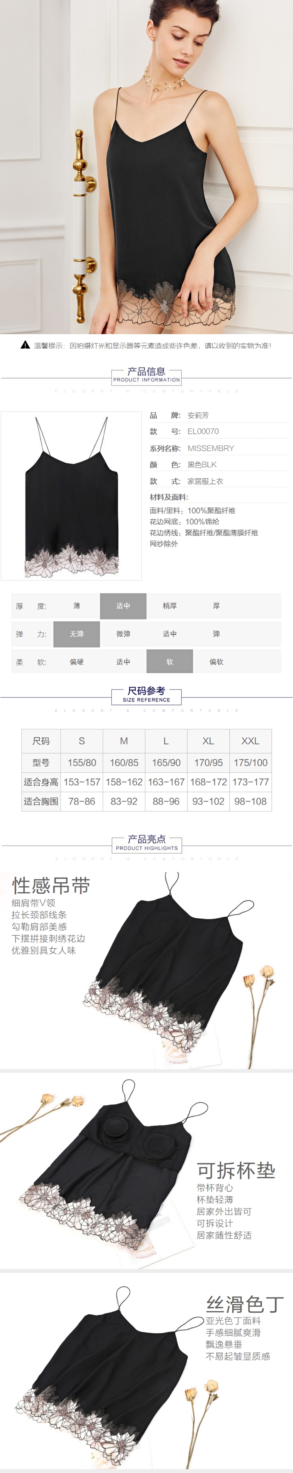 安莉芳女蕾丝刺绣带杯垫吊带背心免穿文胸家居睡衣EL00070
