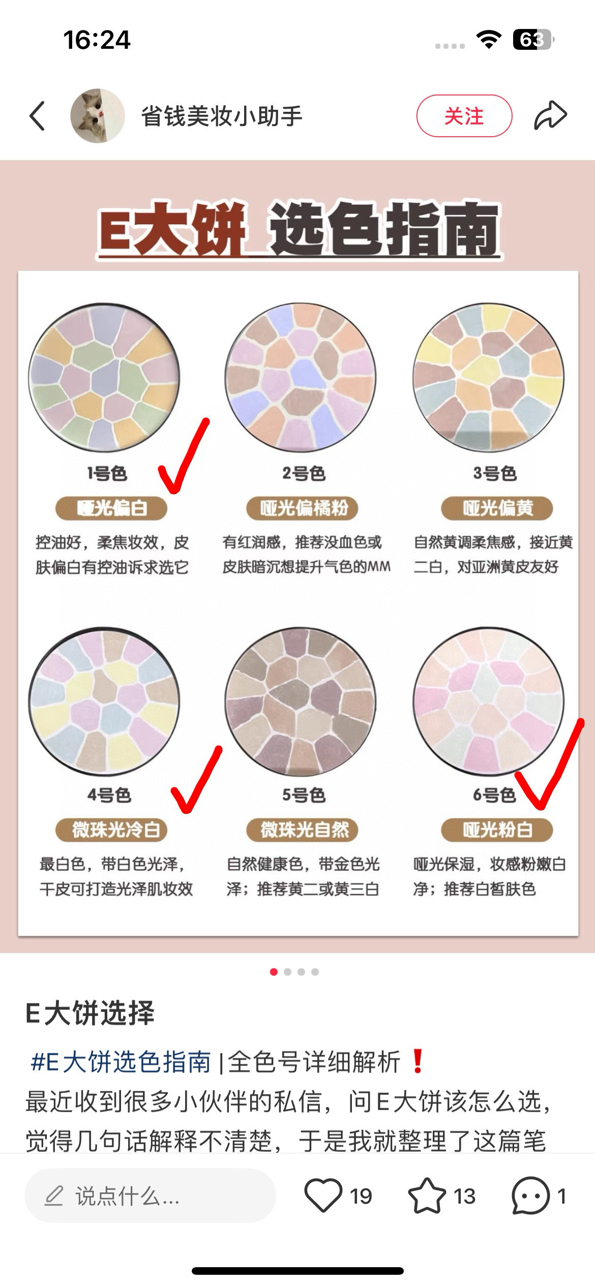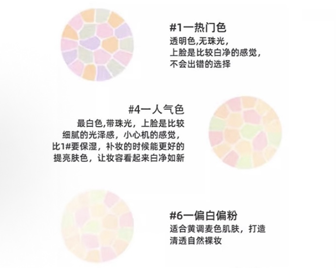 两种规格都是个色号:▪️号色是E大饼最热门的色号 颜色不会偏粉或者偏黄,所以适用面很大。1号粉感最重也最控油,颜色比较白。如果你本身的底妆稍暗,用这个能帮你补救。哑光的妆效,粉感很好,所以控油也相当不错,颜色偏白。对色号困难纠结的姐妹,只要皮肤相对白皙,有控油的需求,选一号色不会出错,适合中性或油性的皮肤。▪️号色是透明珠光感,偏白,粉感比以上1236都要弱,带有细闪却不会夸张,如果你想要有一点自然光泽感的妆效,可以选择4号,4号也很适合干皮来局部定妆打造立体妆效 ▪️号色也是比较白的色号,颜色相对1号更自然透亮一点儿,粉感比1号弱,透明度好一些。如果你更想要自然妆效,或者肤色没有那么白想要增加一丢丢透白妆效的妹子,可以选择6号。‼️油皮和混合肤质:E大饼的1号色适合油皮和混合肤质,其哑光控油效果显著,能够提供持久的哑光妆效。使用时应使用刷子轻轻转一圈取粉,再上脸,这样可以达到最佳的控油和磨皮效果。干皮:对于干皮,E大饼的4号和6号色是较好的选择。4号色带有透明珠光感,适合喜欢自然光泽感的妆效;6号色则更加自然透亮,适合希望增加透白妆效的干皮用户。使用时建议用粉扑在粉饼上转三圈取粉,然后对折粉扑按压上脸,这样可以达到更服帖的效果。