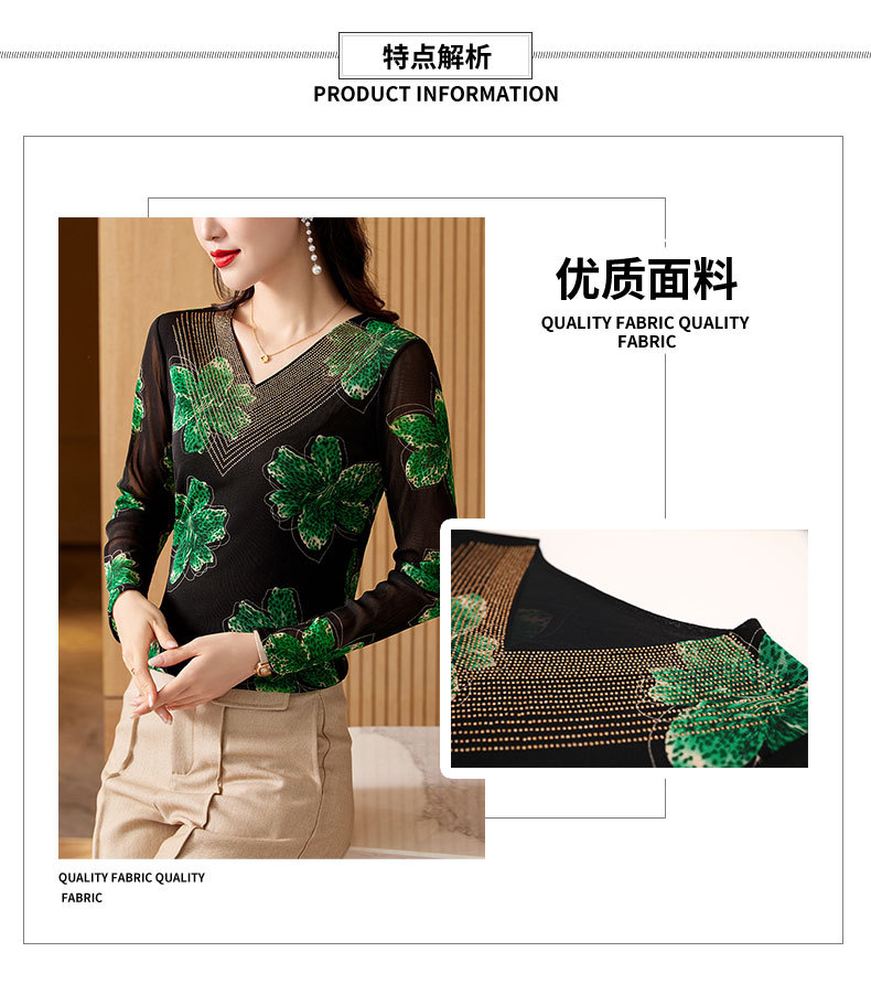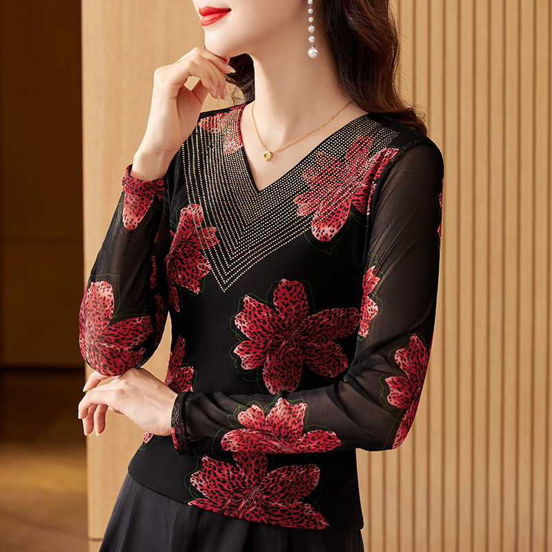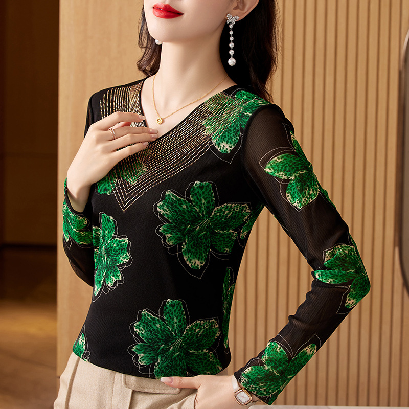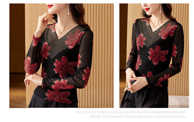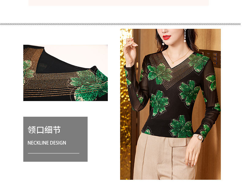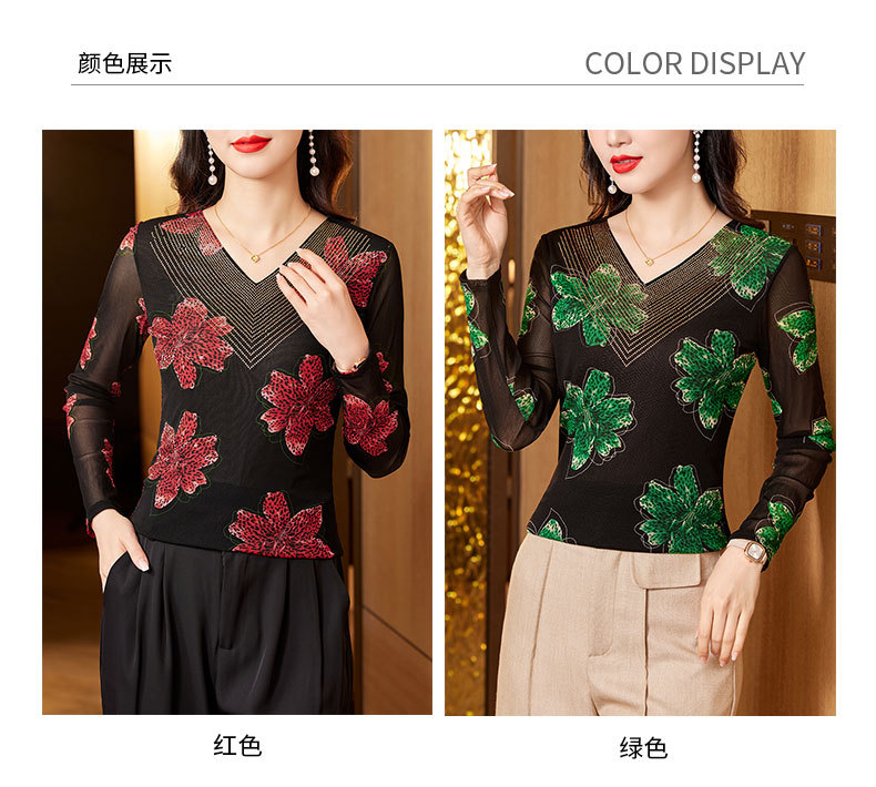 KQL402H3252 2023秋季新款时尚洋气V领烫钻网纱气质显瘦长袖百搭小衫打底衫女