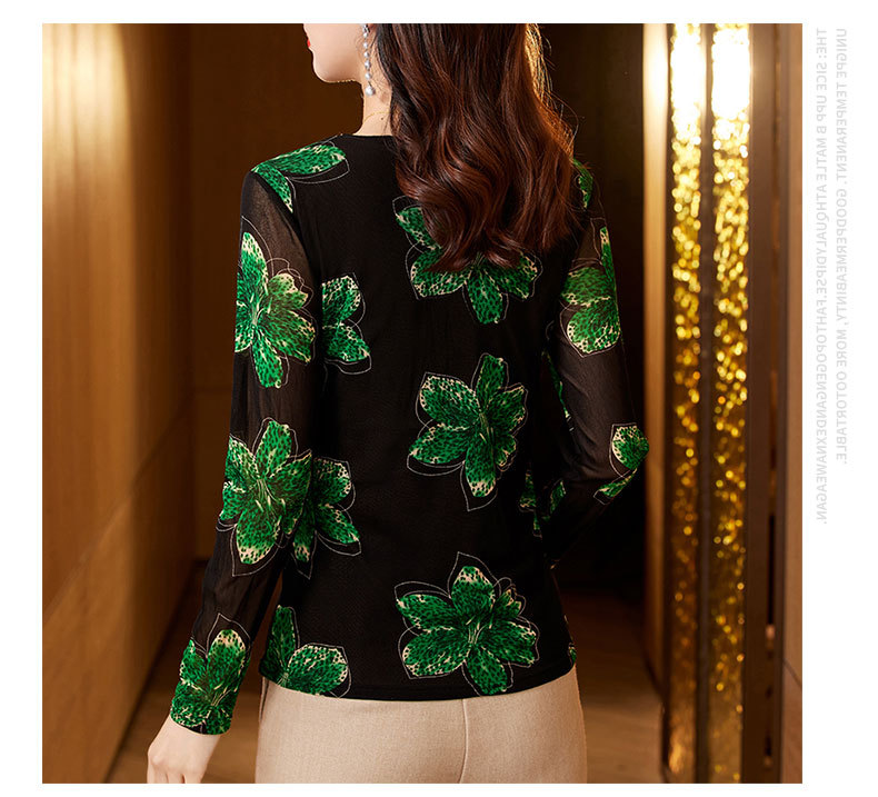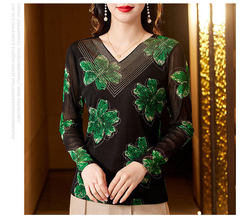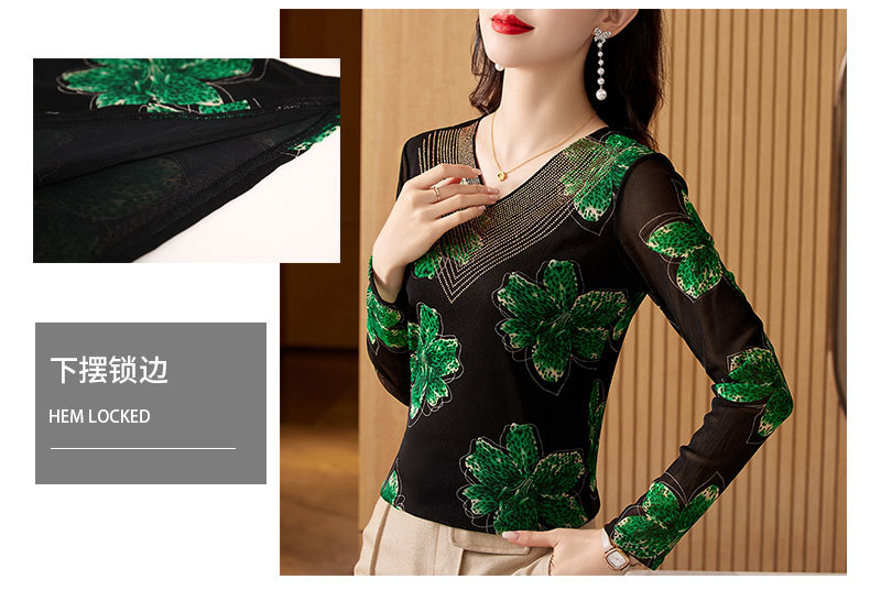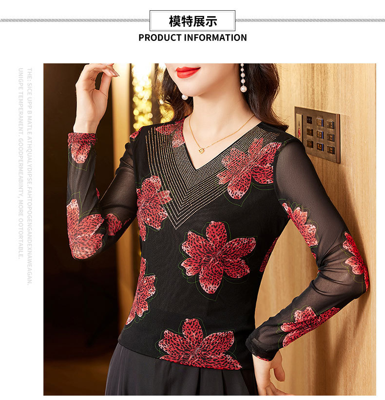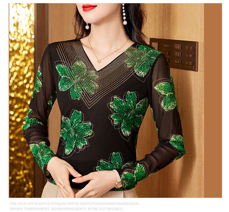 KQL402H3252 2023秋季新款时尚洋气V领烫钻网纱气质显瘦长袖百搭小衫打底衫女