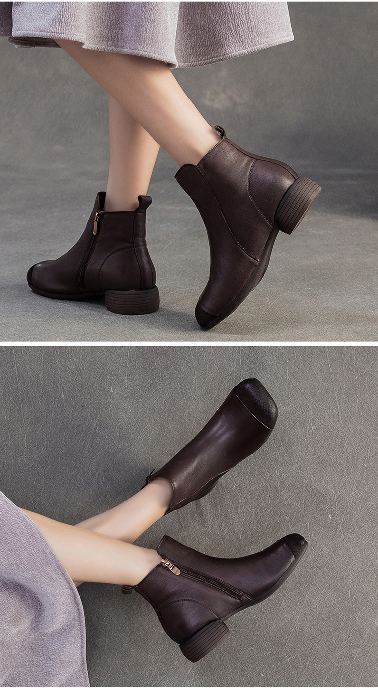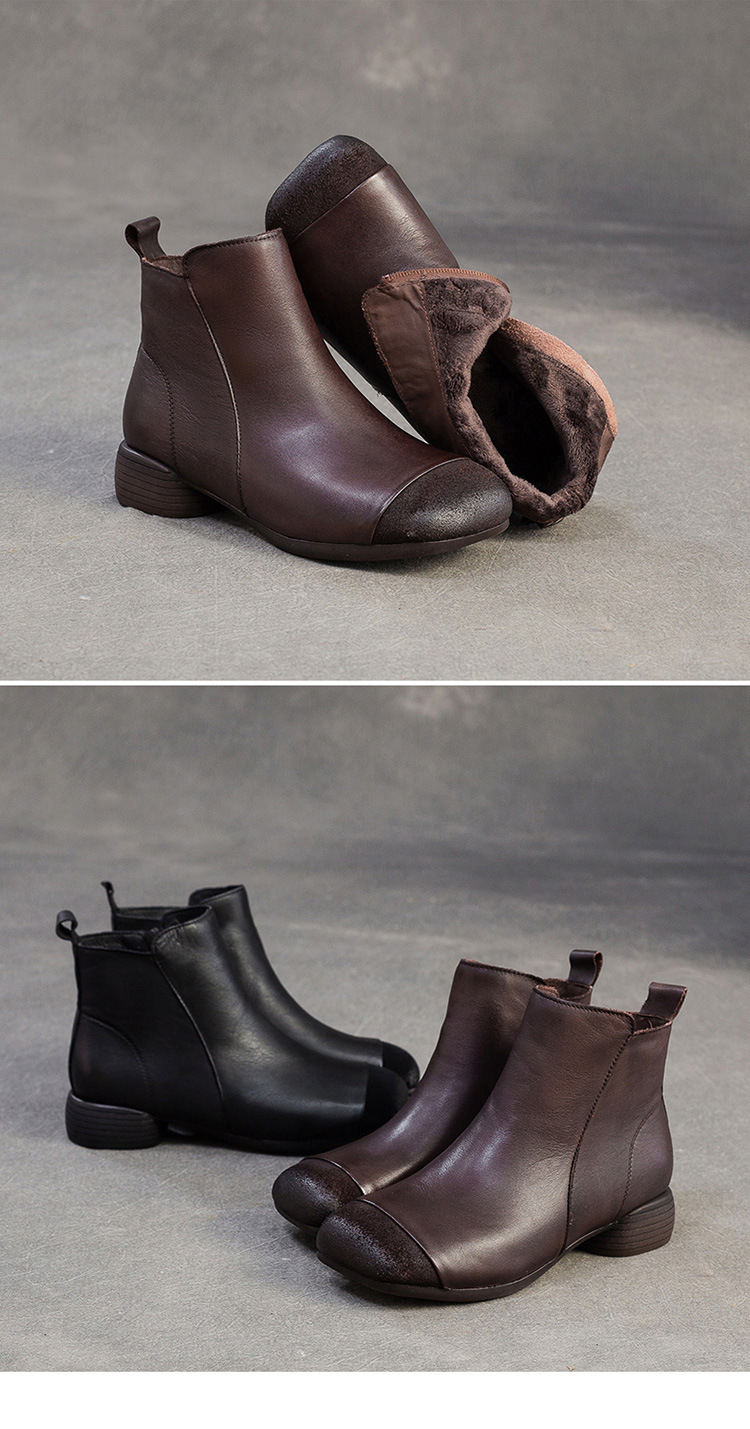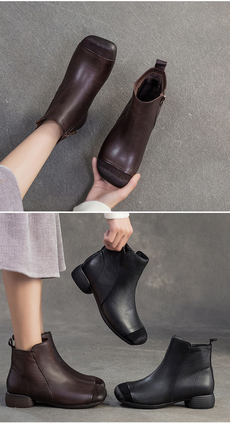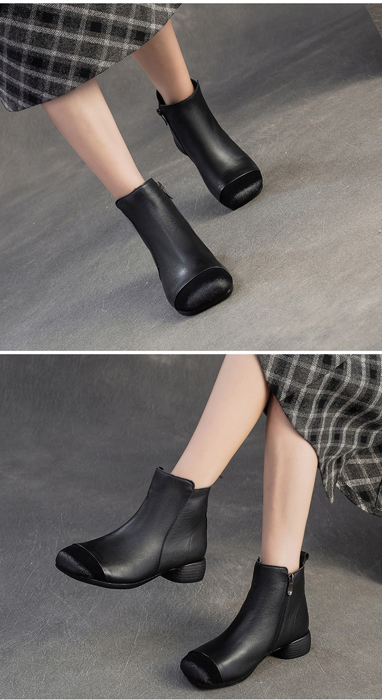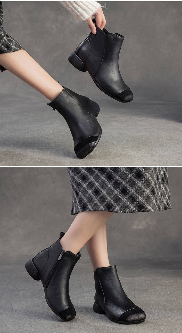 JZ65735-6 2025冬季新款加绒保暖头层牛皮复古粗跟短靴通勤棉鞋百搭女鞋