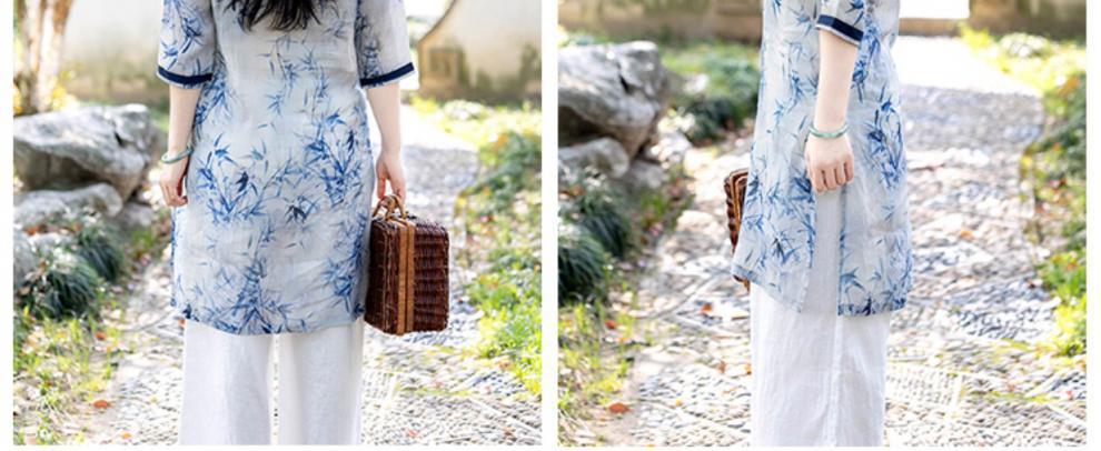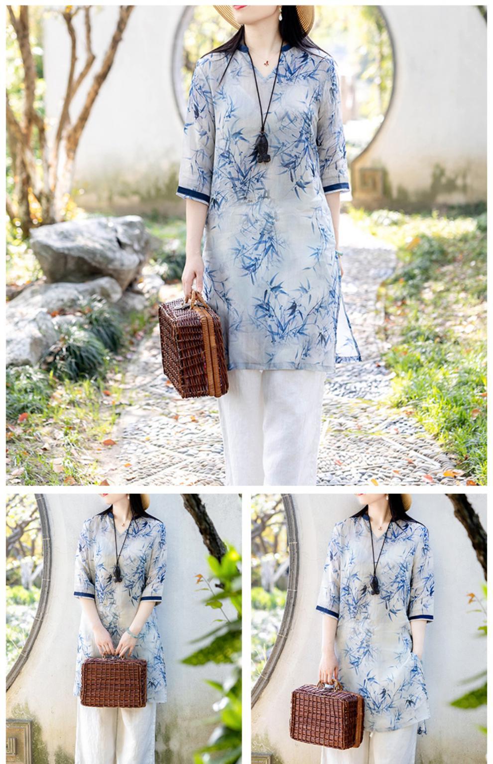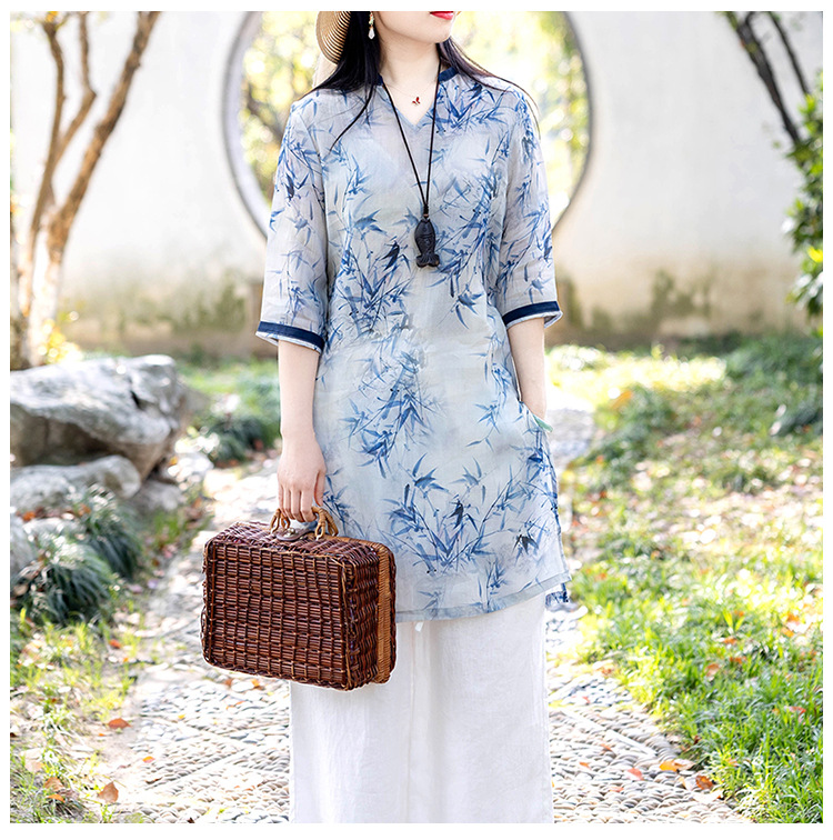 XJM4FD021-459361中国风复古中长款宽松上衣女棉麻印花显瘦禅意茶服连衣裙