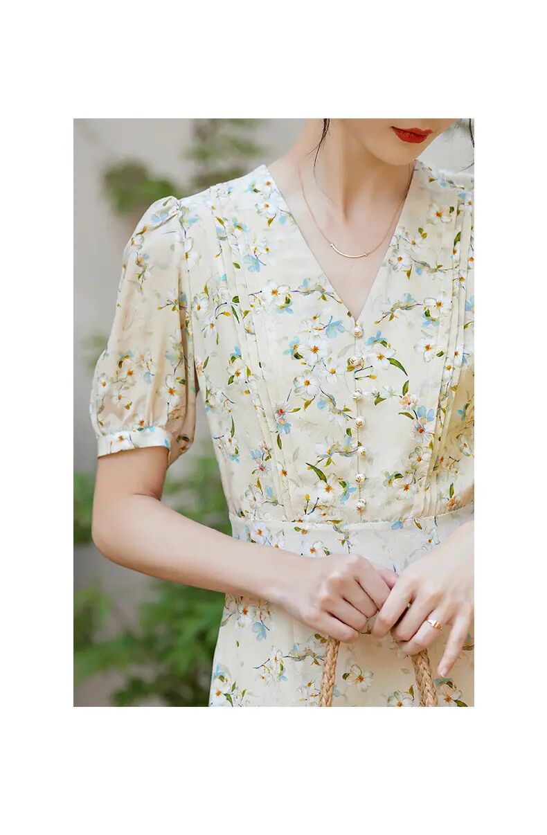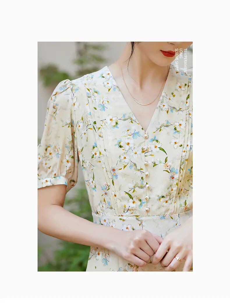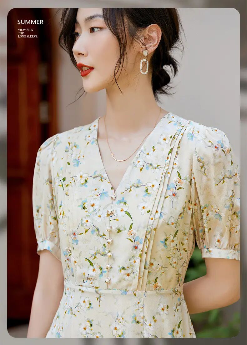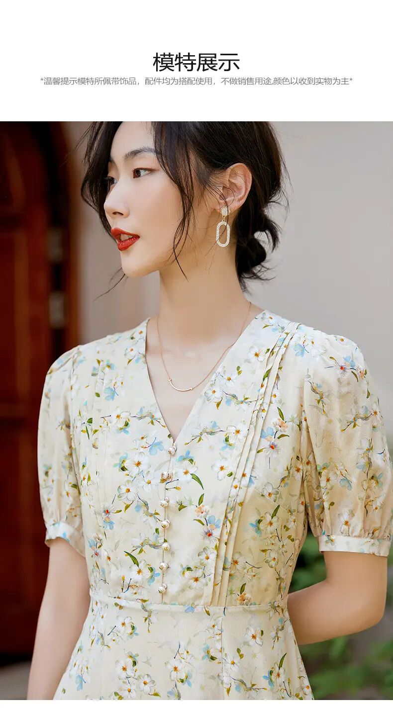 【自】全新升级【铂金会员468/天猫629/差价161】(05845) 洛诗琳100%桑蚕丝真丝双绉短袖连衣裙2025新款法式碎花长裙