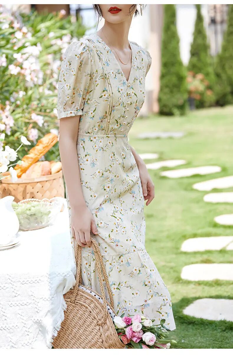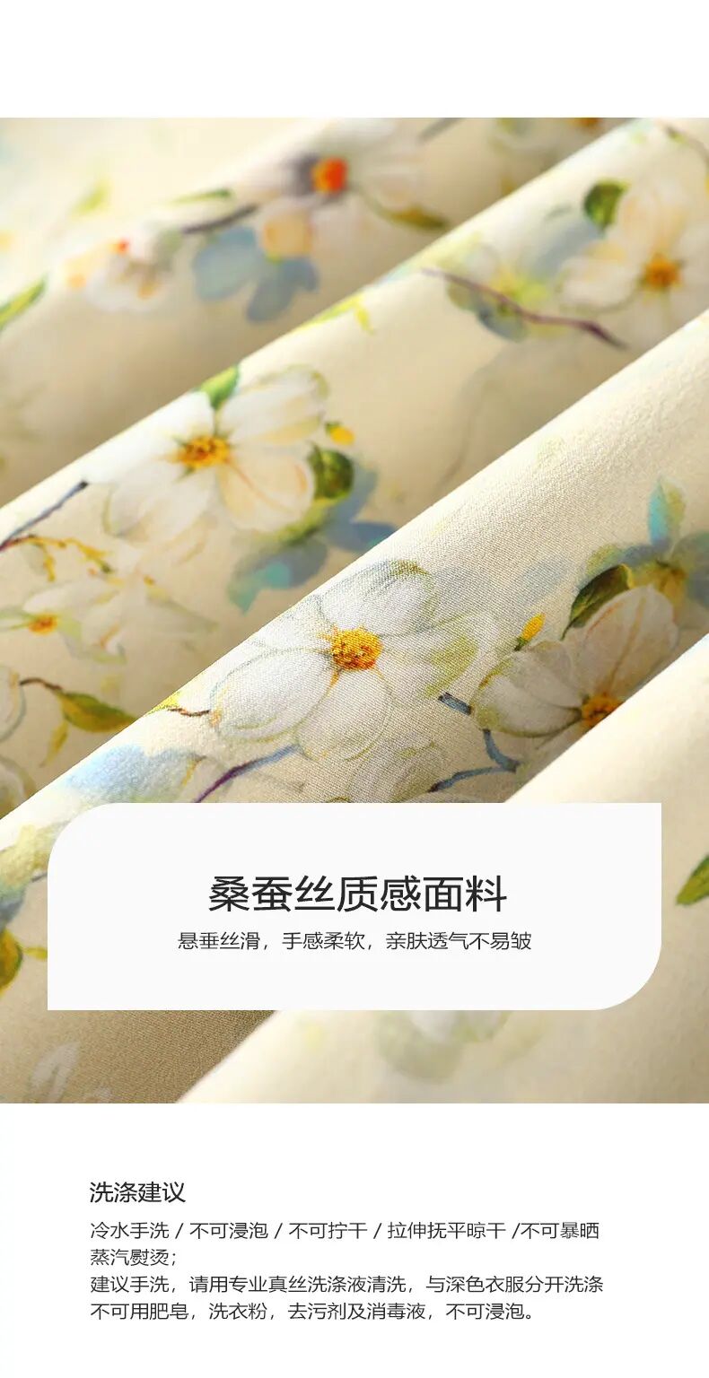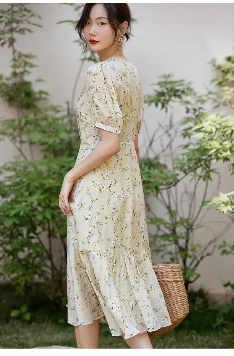 【自】全新升级【铂金会员468/天猫629/差价161】(05845) 洛诗琳100%桑蚕丝真丝双绉短袖连衣裙2025新款法式碎花长裙