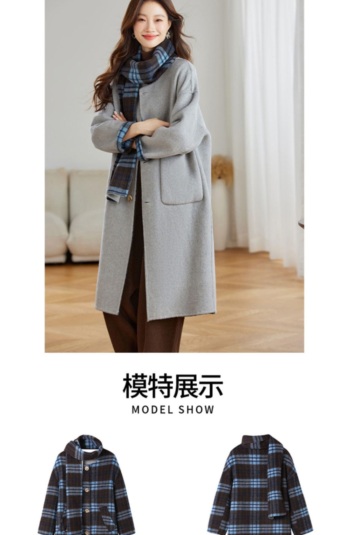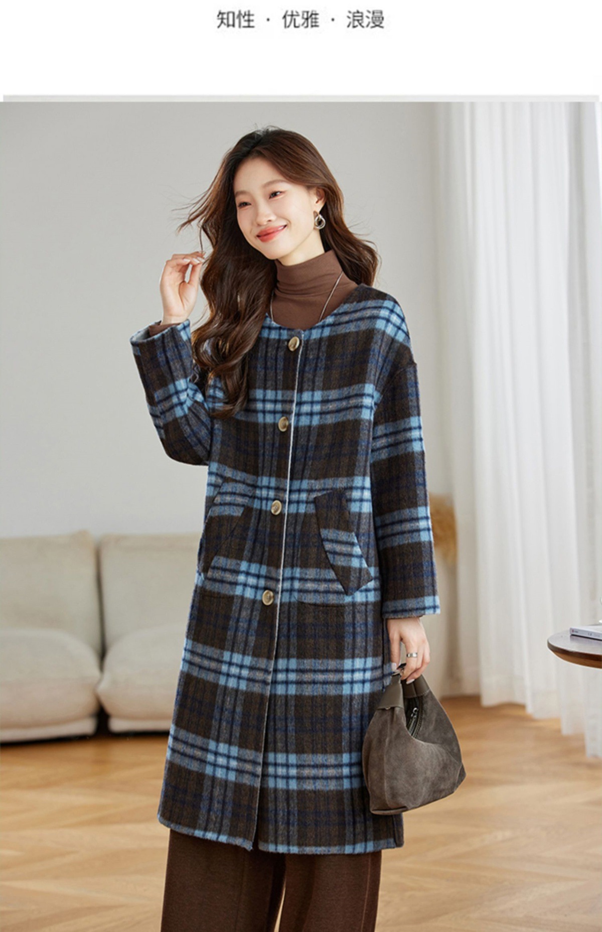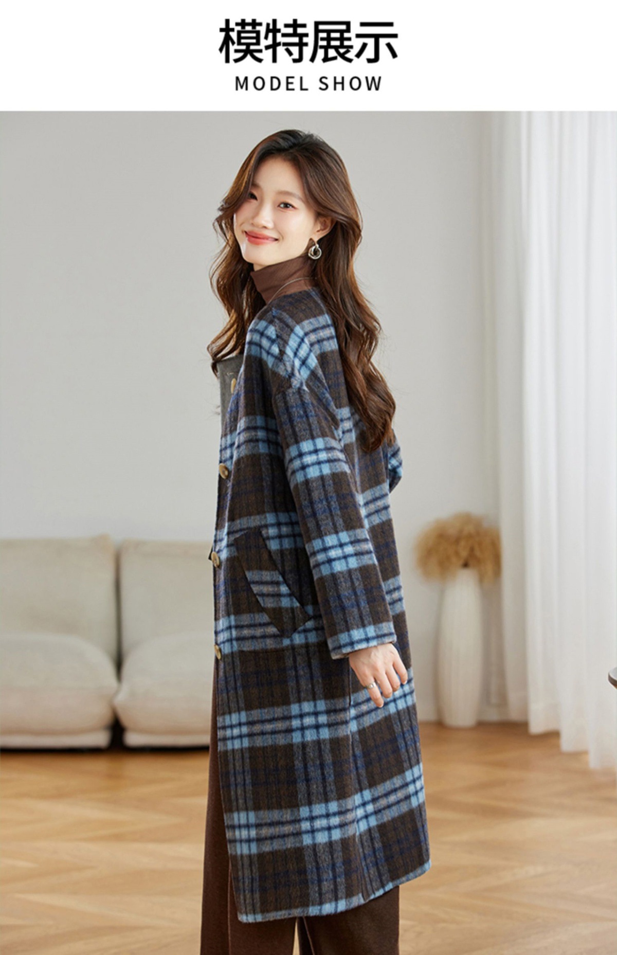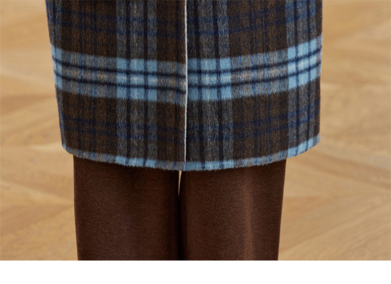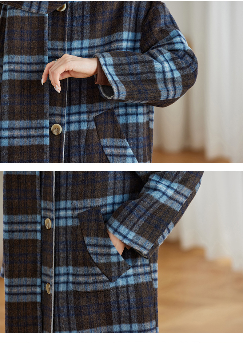 两面穿蓝色格纹羊毛大衣,设计感休闲中长款毛呢外套QIXFS248826-1