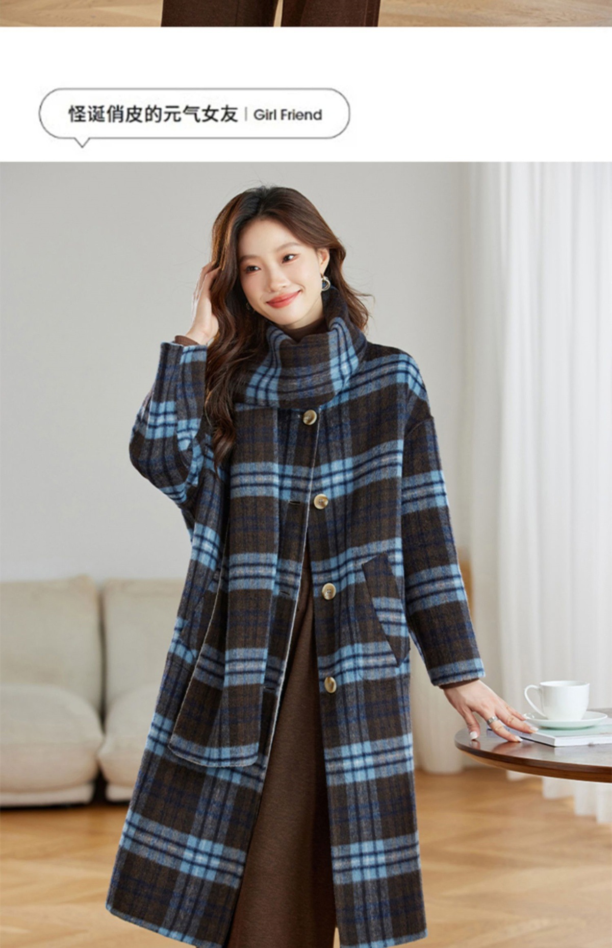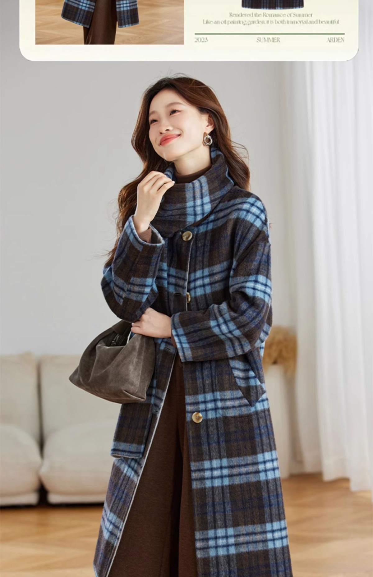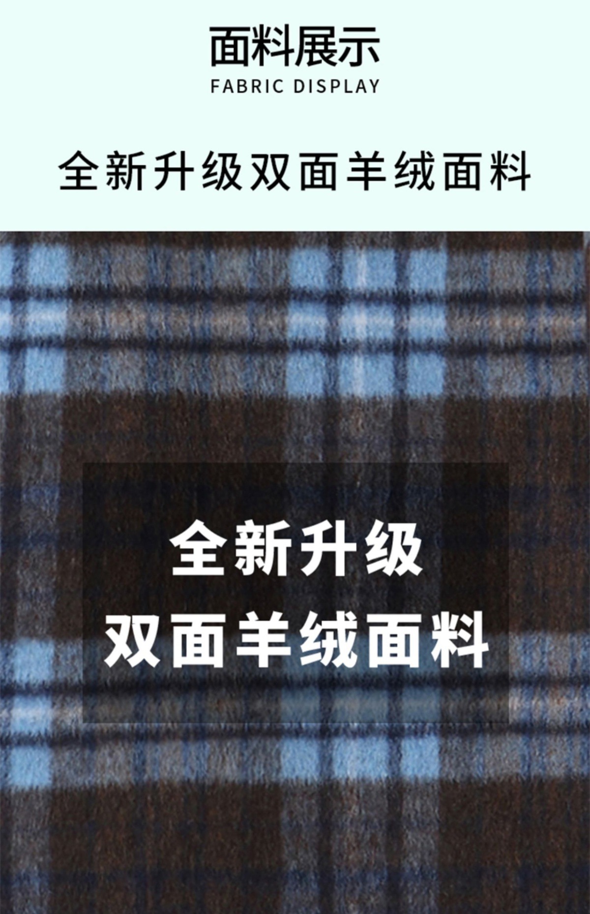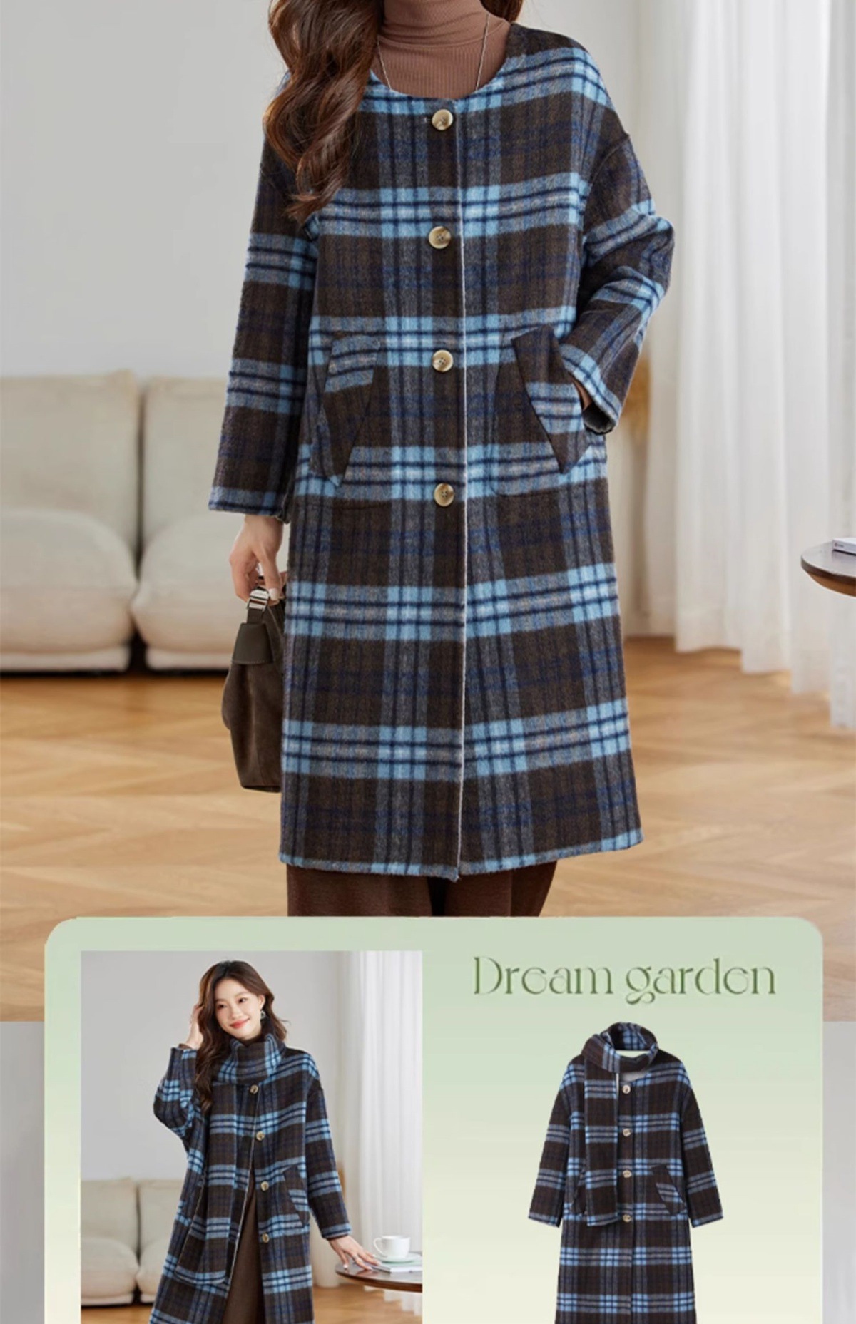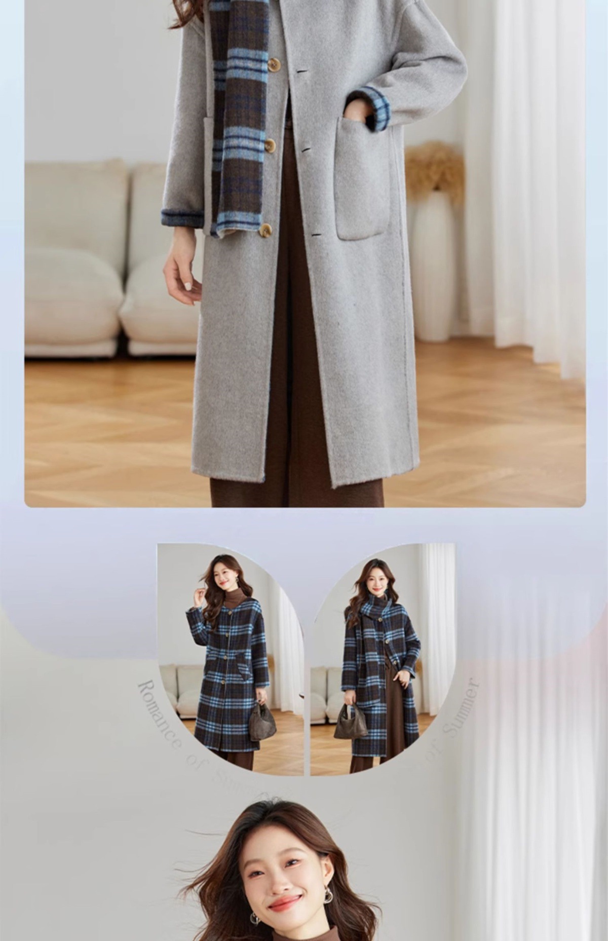 两面穿蓝色格纹羊毛大衣,设计感休闲中长款毛呢外套QIXFS248826-1