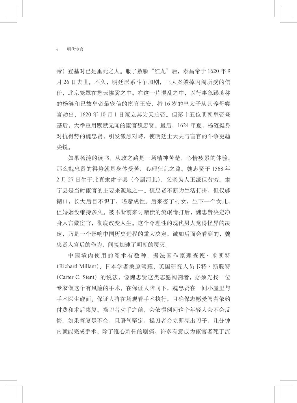 体、生理变化远不容易察觉。但根据可取得的文献和史料(包括宦官刘若愚的回忆录),魏忠贤等被阉割后的男人往往心存自卑,也就是说对自己的“身体缺陷”和自己走捷径得势之事极端敏感。这类人常有妄想症,他们心胸狭窄,把琐碎小事看得很认真,且变得乖戾,心怀报复,会迅即做出残酷的决定;但对朋友温和、忠心,对亲戚宽厚、大方。因此,阉割过的人必须支持有权势的宦官,必须与宫中有影响力的女人合作。最重要的是,必须时时像条忠狗般站在独裁主子身旁,皇帝残民以逞、无视百姓心愿时,宦官会捍卫他的主子。有关宦官和宫女、皇族成员有不伦关系的说法极多,后面几章会提出一些典型例子。