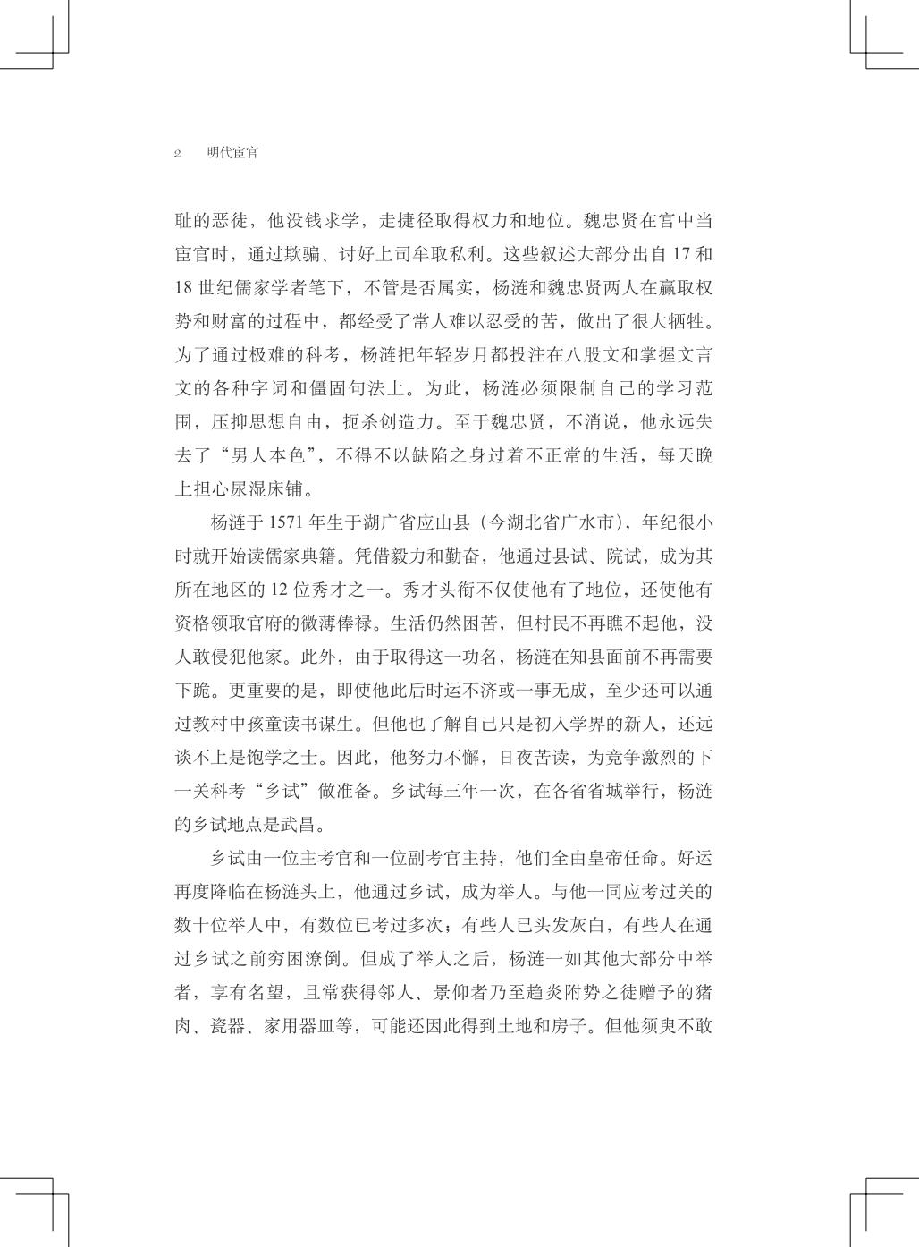 附近干燥的河北来到人间。一人是杨涟,另一人是魏忠贤(又名李进忠)。一如当时许多人,两人都拼命想通过曲折且狭窄的谋取功名利禄之路出人头地。杨涟选择走上以八股取士的科举之路,如愿成了士大夫,政绩卓著,在1625年去世之前,升到左副都御史之位;另一边,魏忠贤选择宦官之路,靠着狡诈手法一路往上爬,成为权倾一时的司礼监秉笔太监。据传统论述,杨涟有功于社稷,坚守儒家理想和信念,保住了士大夫风骨。相对而言,魏忠贤是个狡猾、无耻的恶徒,他没钱求学,走捷径取得权力和地位。魏忠贤在宫中当宦官时,通过欺骗、讨好上司牟取私利。这些叙述大部分出自17和18世纪儒家学者笔下,不管是否属实,杨涟和魏忠贤两人在赢取权势和财富的过程中,都经受了常人难以忍受的苦,做出了很大牺牲。为了通过极难的科考,杨涟把年轻岁月都投注在八股文和掌握文言文的各种字词和僵固句法上。为此,杨涟必须限制自己的学习范围,压抑思想自由,扼杀创造力。至于魏忠贤,不消说,他永远失去了“男人本色”,不得不以缺陷之身过着不正常的生活,每天晚上担心尿湿床铺。