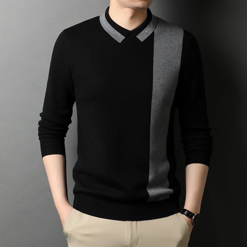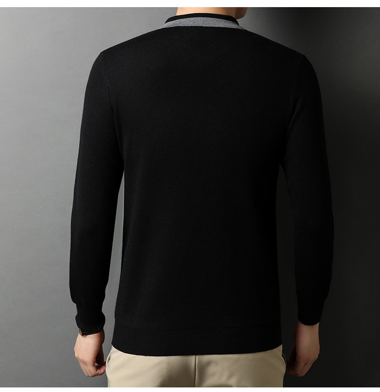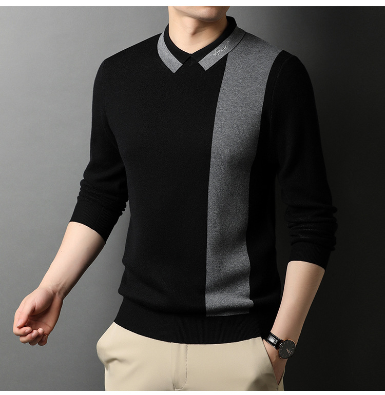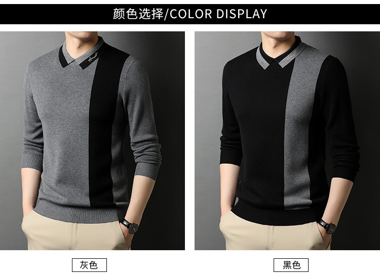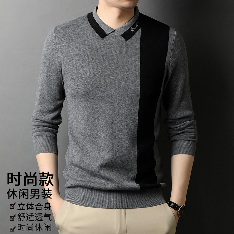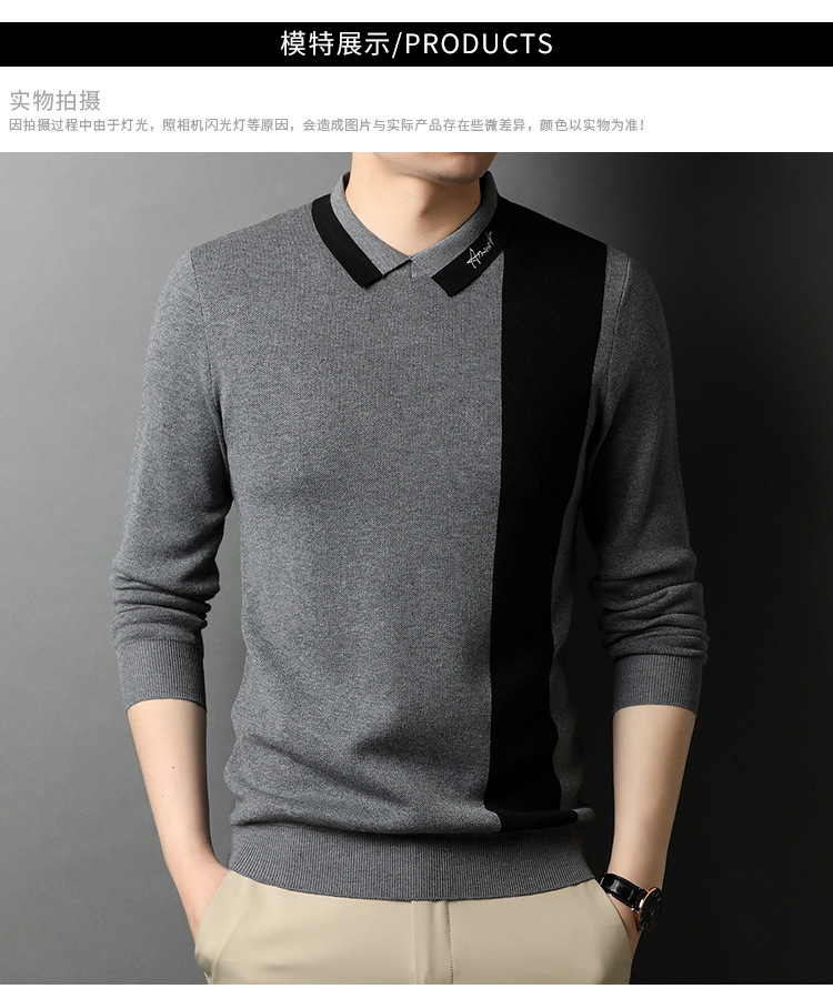 BP-1970 羊毛衫男假两件秋季新款时尚撞色长袖翻领毛衣中年上衣打底衫男装