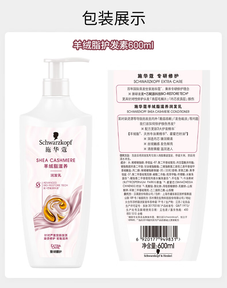 施华蔻(Schwarzkopf)羊绒脂滋养护发乳600ml{专柜渠道}
