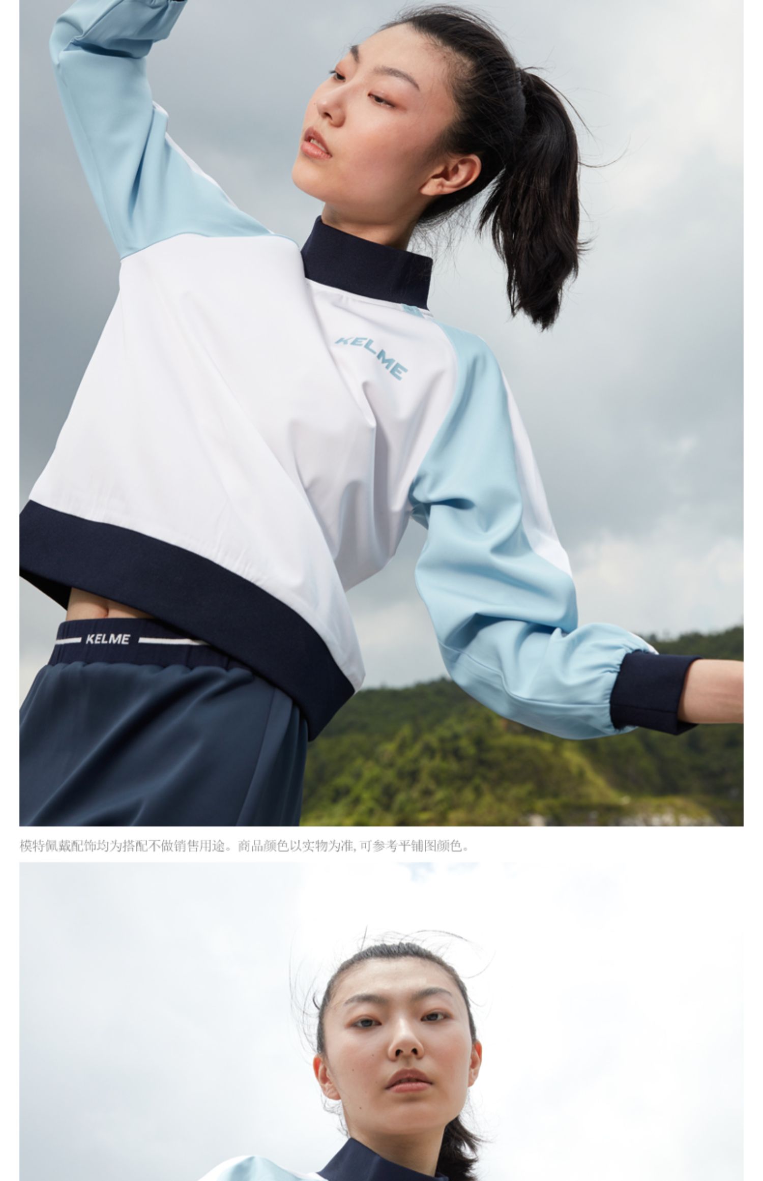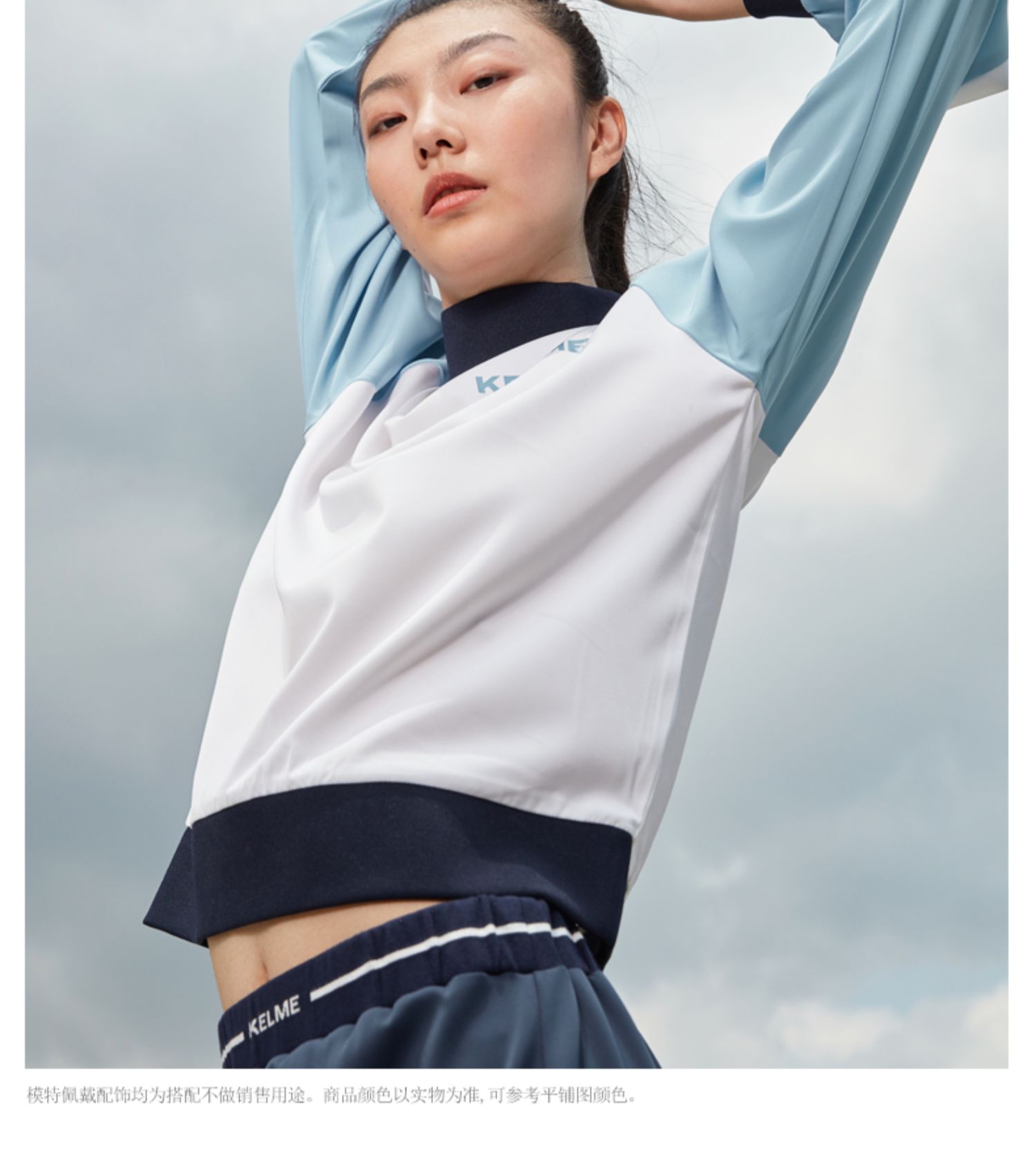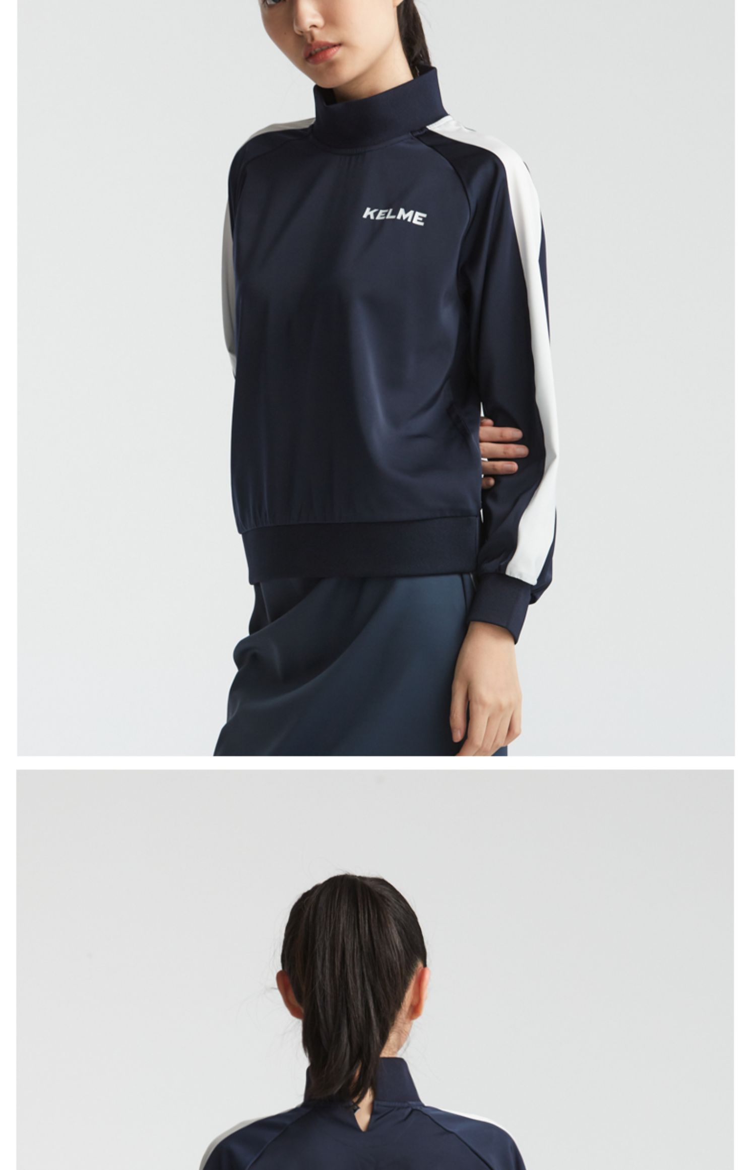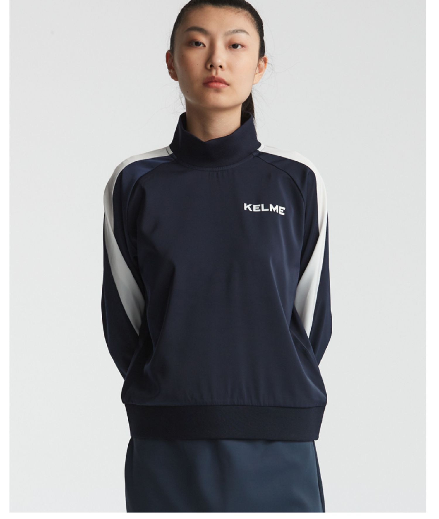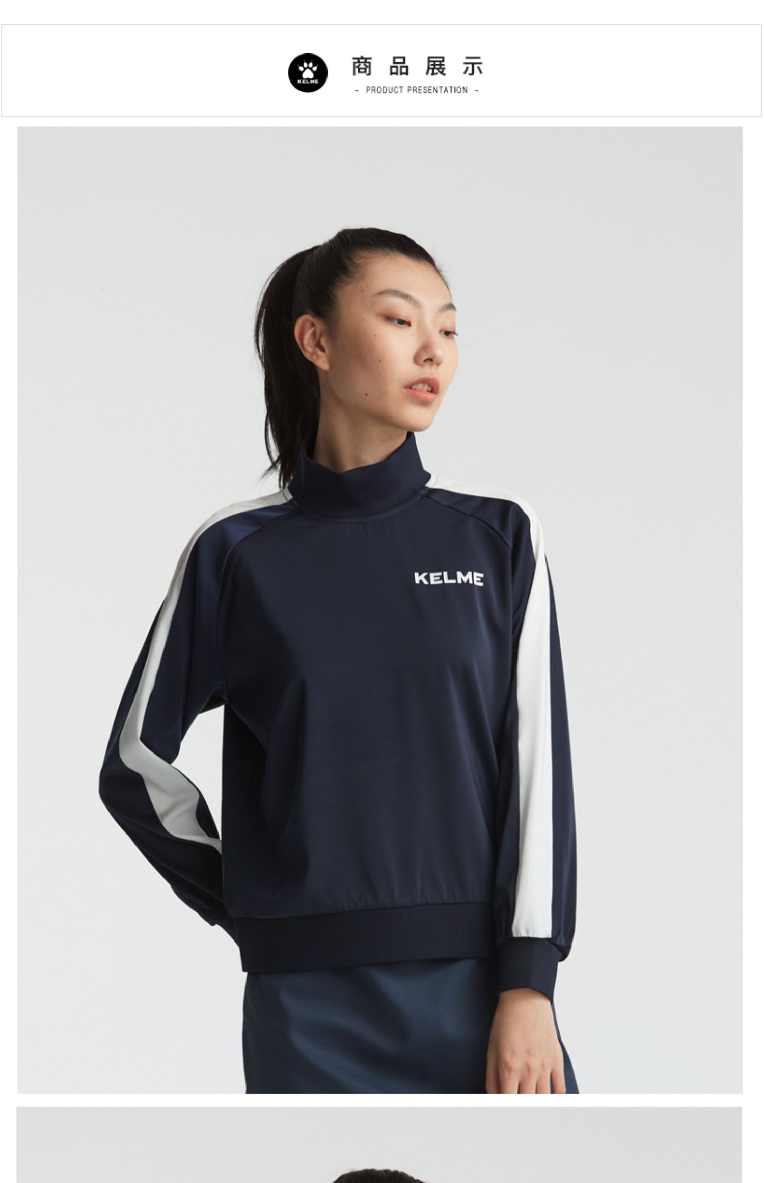 卡尔美新款插肩袖撞色条纹卫衣女清爽梭织高领休闲上衣