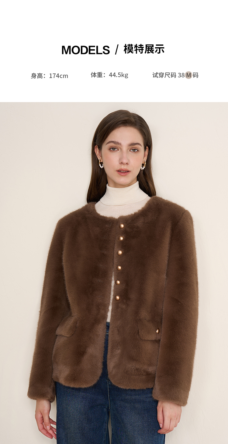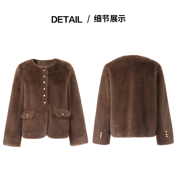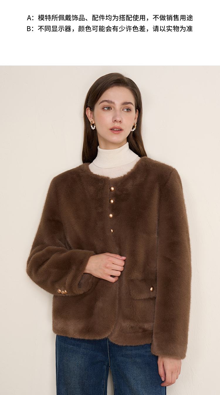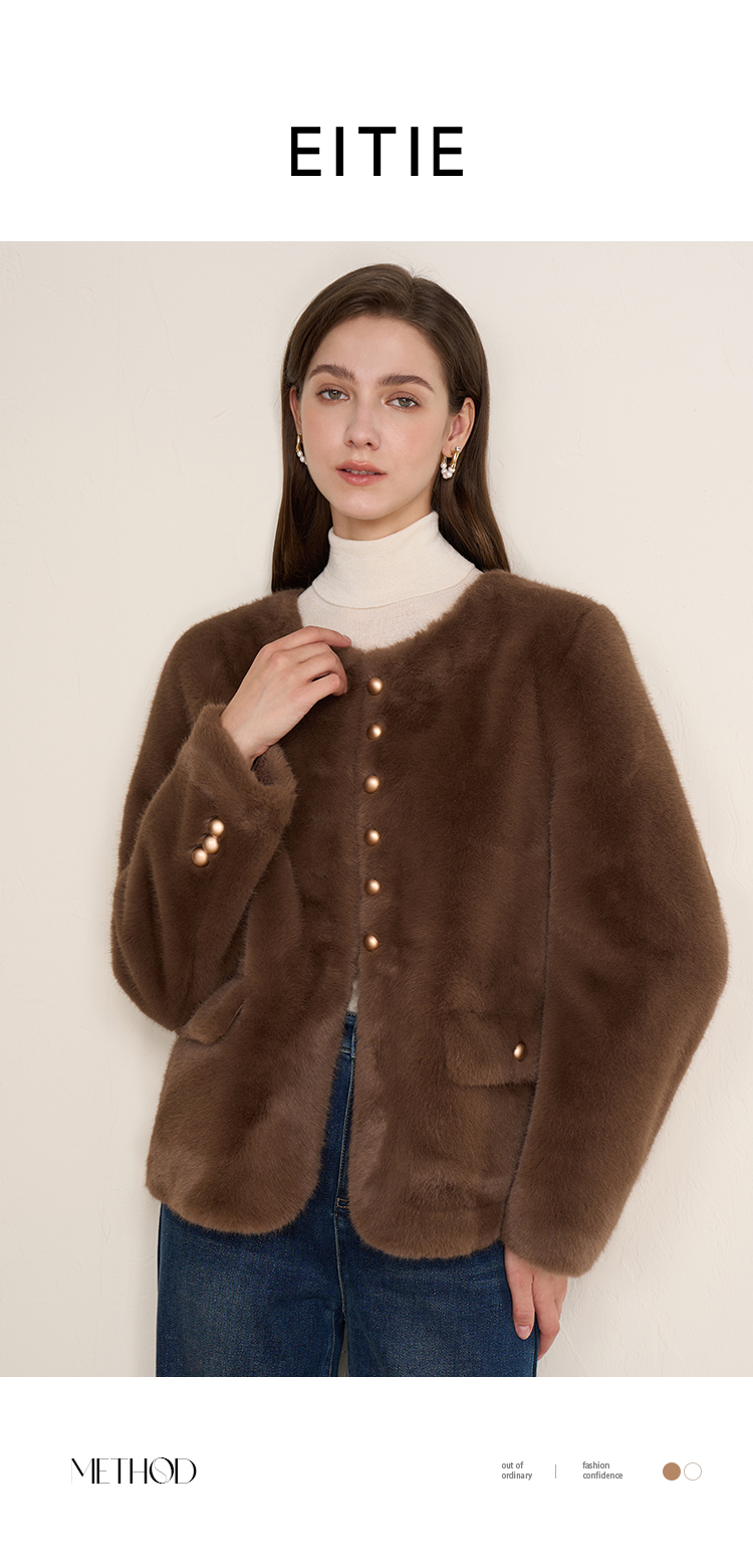EITIE爱特爱巧克力色秋冬氛围感圆领短款环保皮草外套D2503923