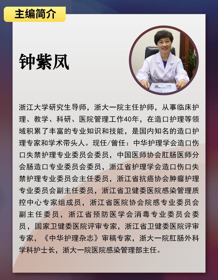 浙江大学研究生导师,浙大一院主任护师,从事临床护理、教学、科研、医院管理工作40年,在造口护理等领域积累了丰富的专业知识和技能,是国内知名的造口护理专家和学术带头人。现任/曾任:中华护理学会造口伤口失禁护理专业委员会委员,中国医师协会肛肠医师分会肠造口专业委员会委员,浙江省护理学会造口伤口失禁护理专业委员会主任委员,浙江省抗癌协会肿瘤护理专业委员会副主任委员,浙江省卫健委医院感染管理质控中心专家组成员,浙江省医院协会院感专业委员会副主任委员,浙江省预防医学会消毒专业委员会委员,国家卫健委医院评审专家,浙江省卫健委医院评审专家,《中华护理杂志》审稿专家,浙大一院肛肠外科学科护士长,浙大一院医院感染管理部主任。