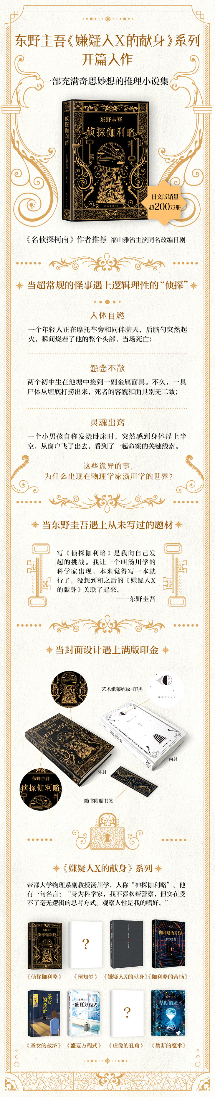 《侦探伽利略》是东野圭吾《嫌疑人X的献身》系列开篇大作,短篇悬疑小说集,《名侦探柯南》作者青山刚昌推荐,日文版销量超200万册。东野圭吾说:“写《侦探伽利略》是我向自己发起的挑战。我让一个叫汤川学的科学家出现,没想到和之后的《嫌疑人X的献身》关联了起来。”