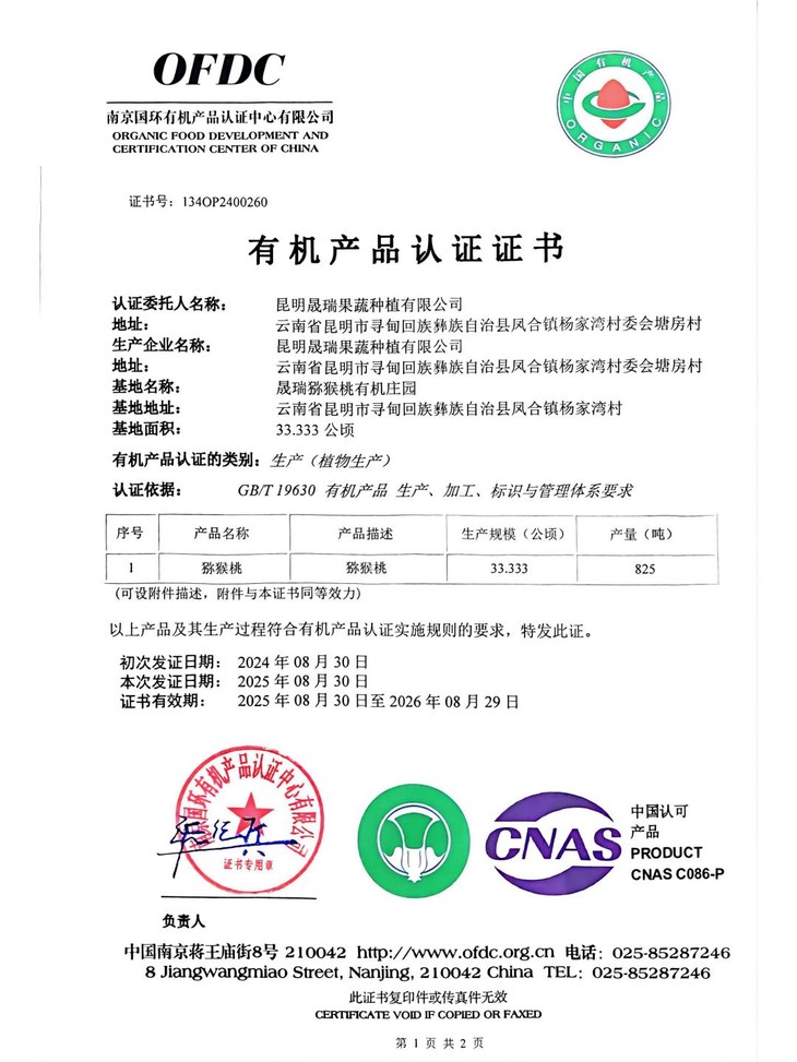 生产方式:猕猴桃园有机种植至今第6年,种植全程不使用化学农药、化肥、催熟剂、膨大剂和除草剂。