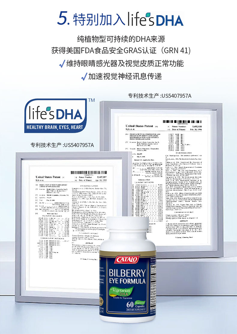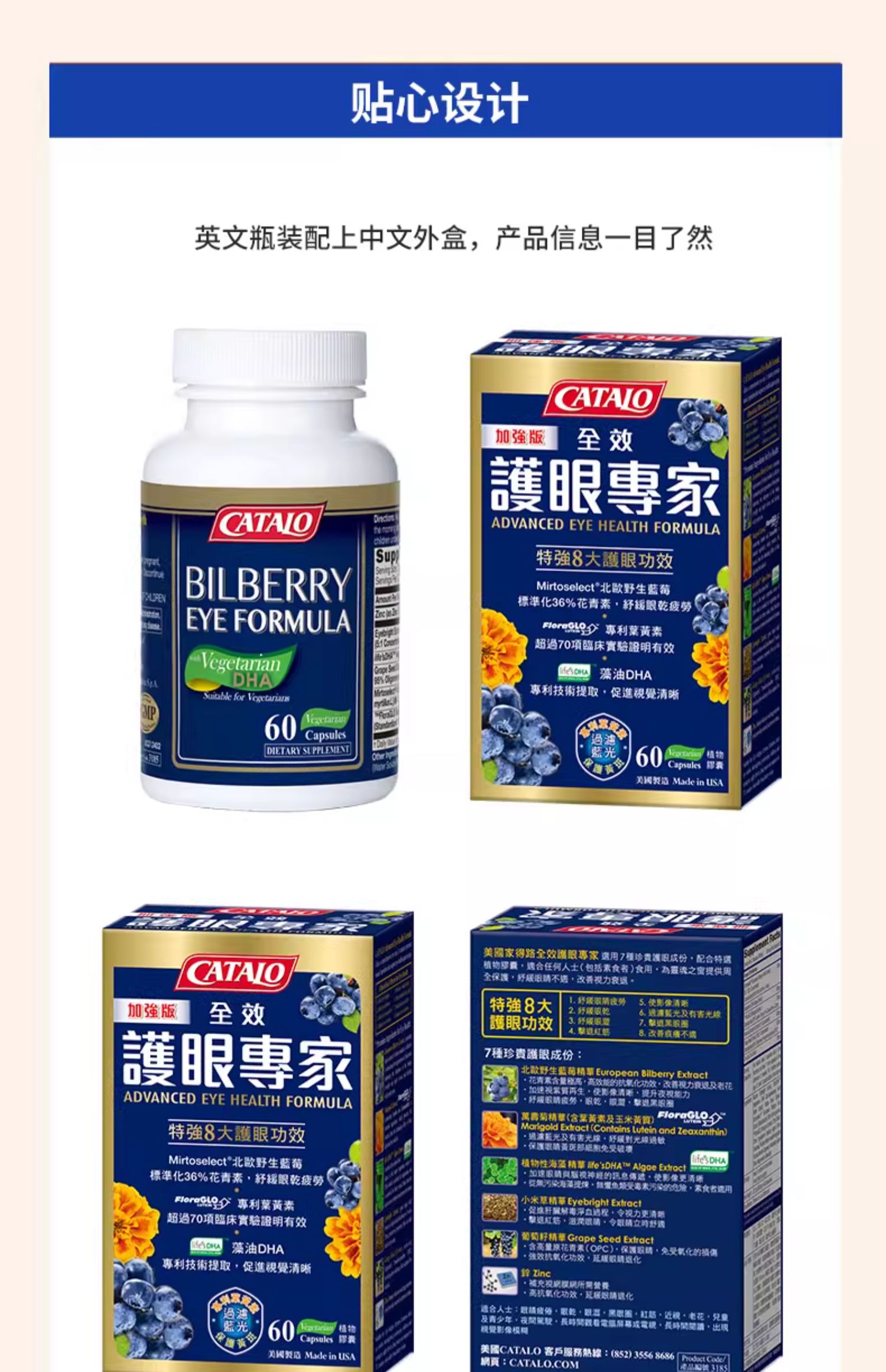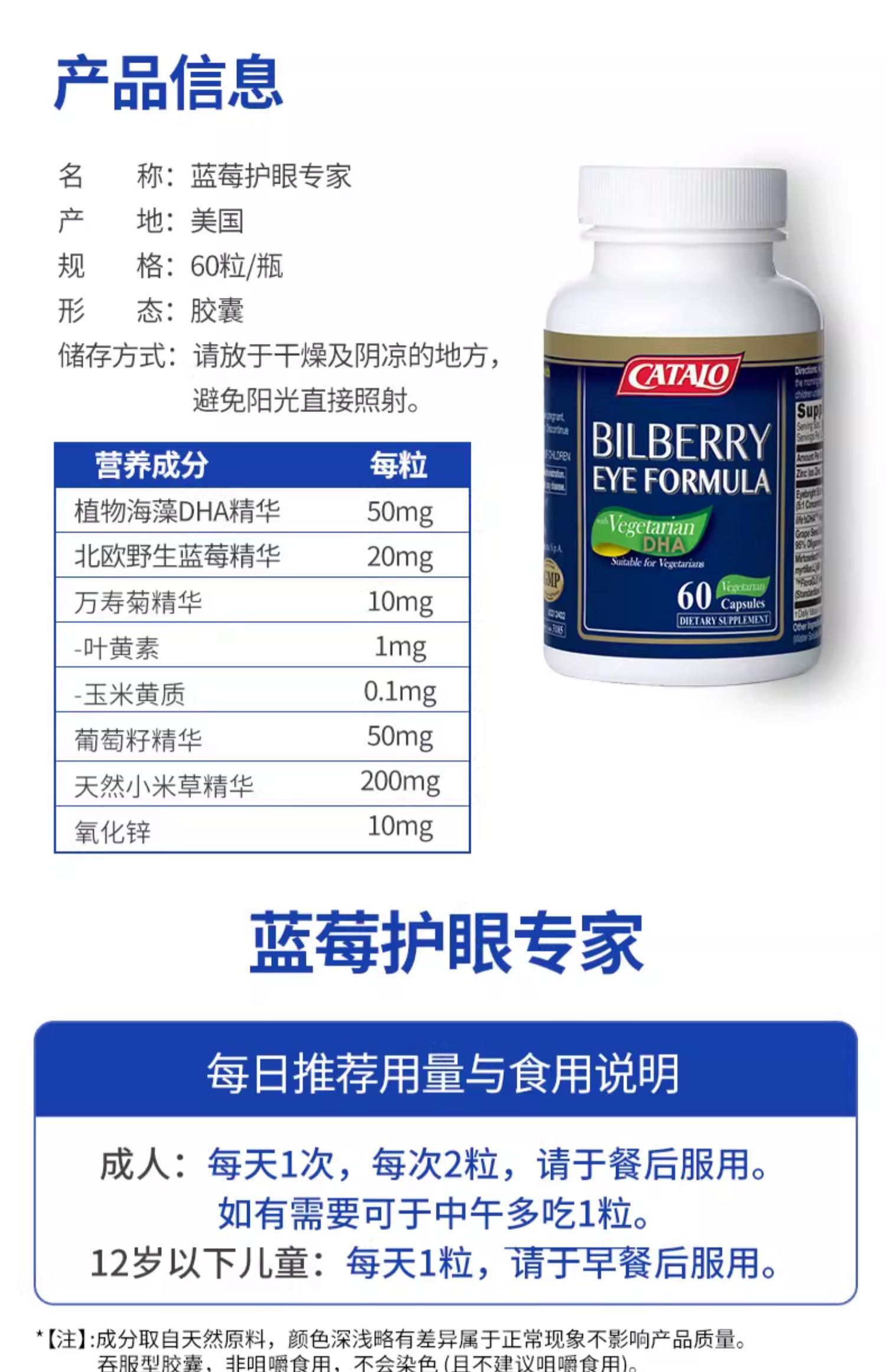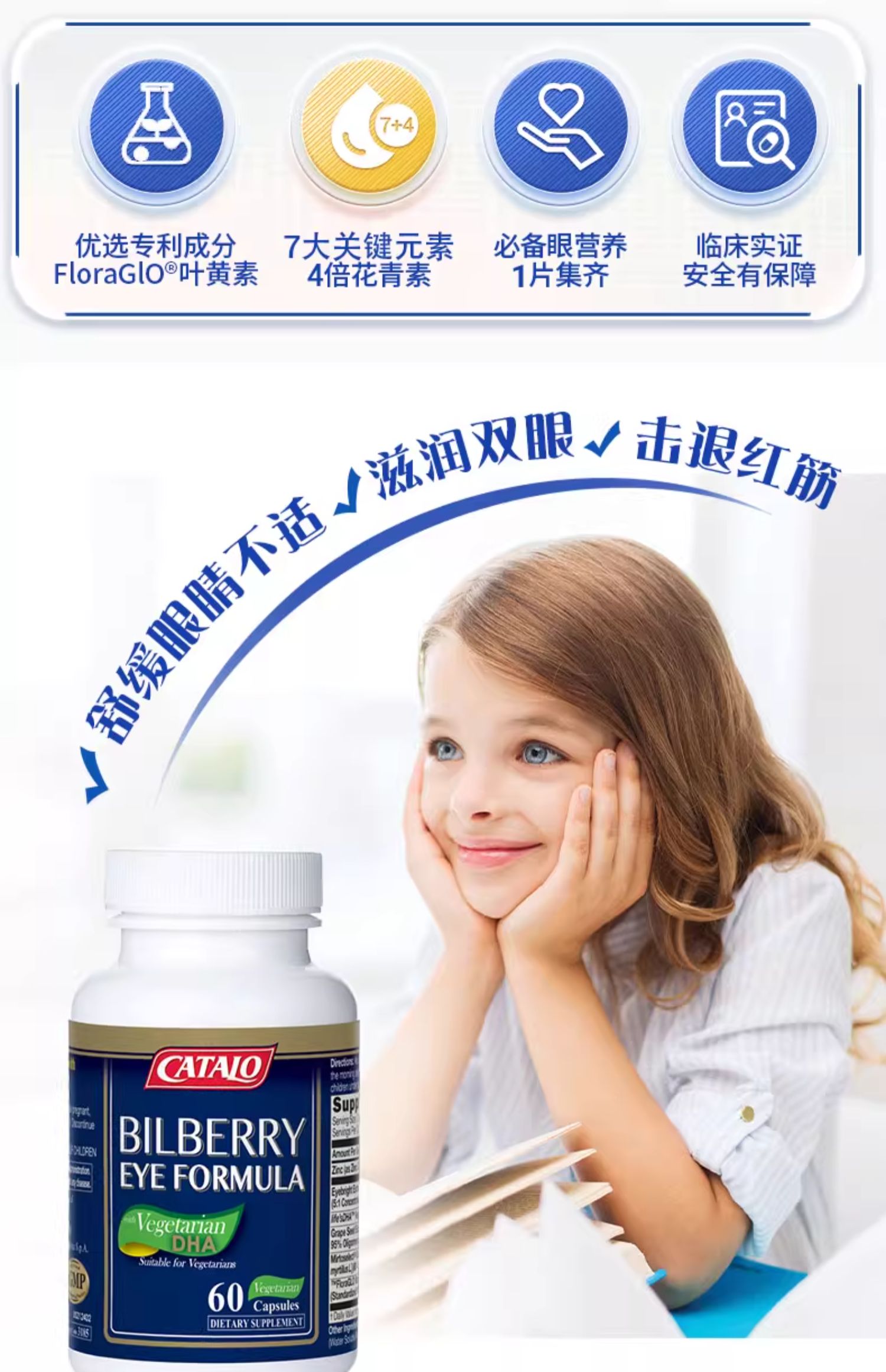 CATALO全效护眼专家蓝莓叶黄素藻油DHA花青素7效胶囊成人儿童视力护眼 60粒 (2026.11)福州发货