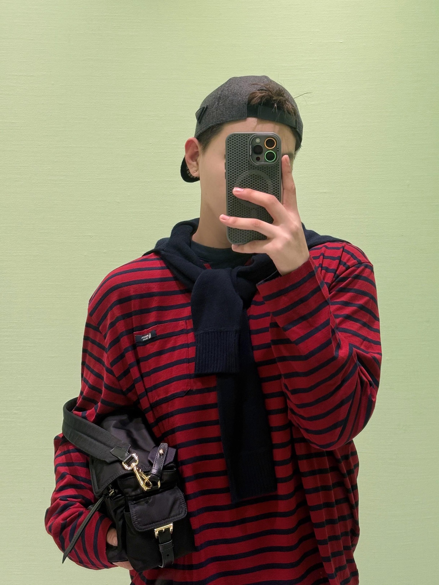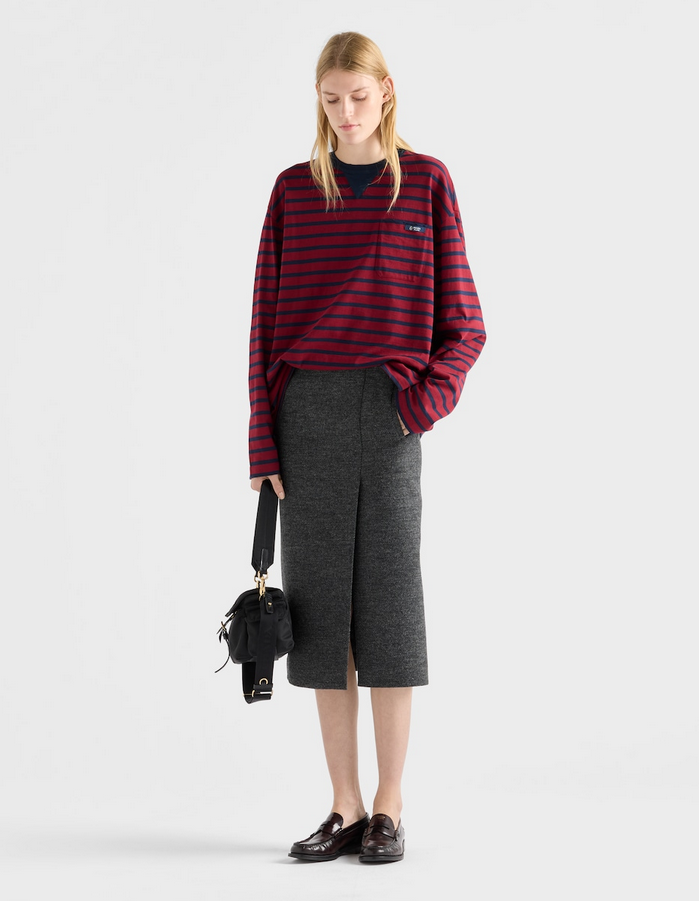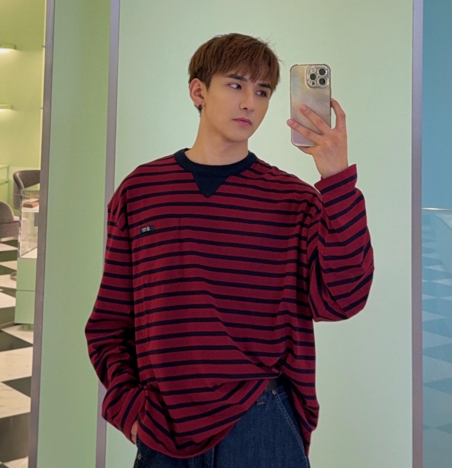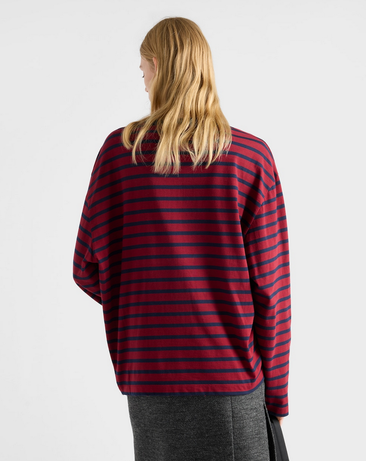 这件衣服就是休闲T恤,条纹和胸口口袋的设计很有复古的感觉