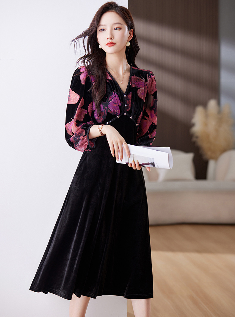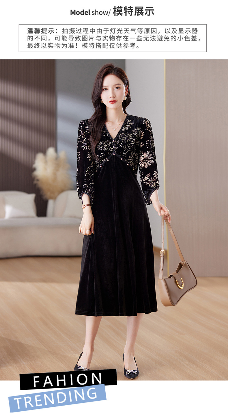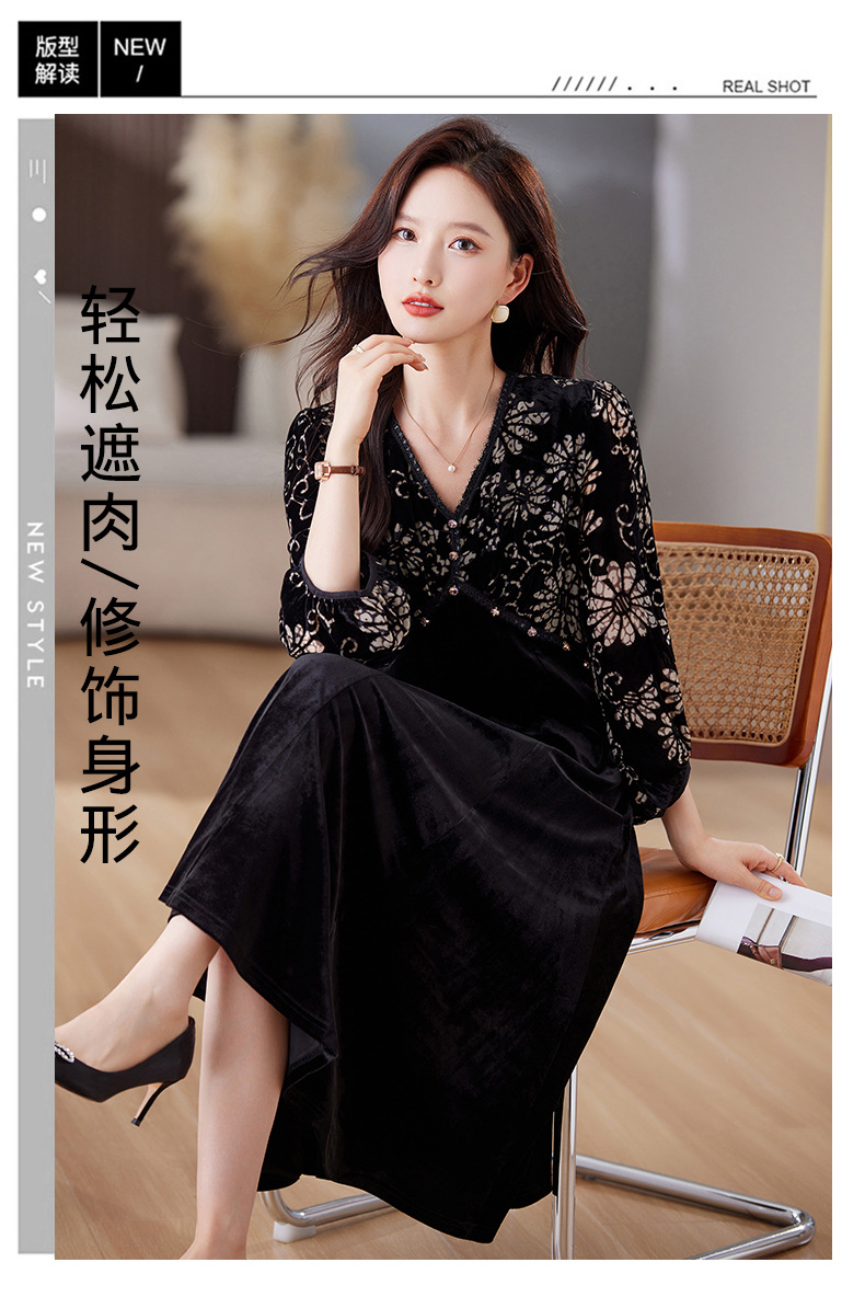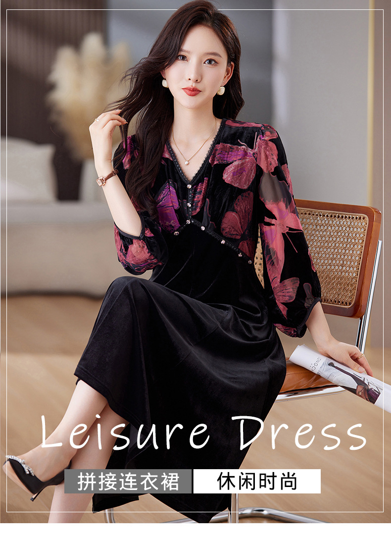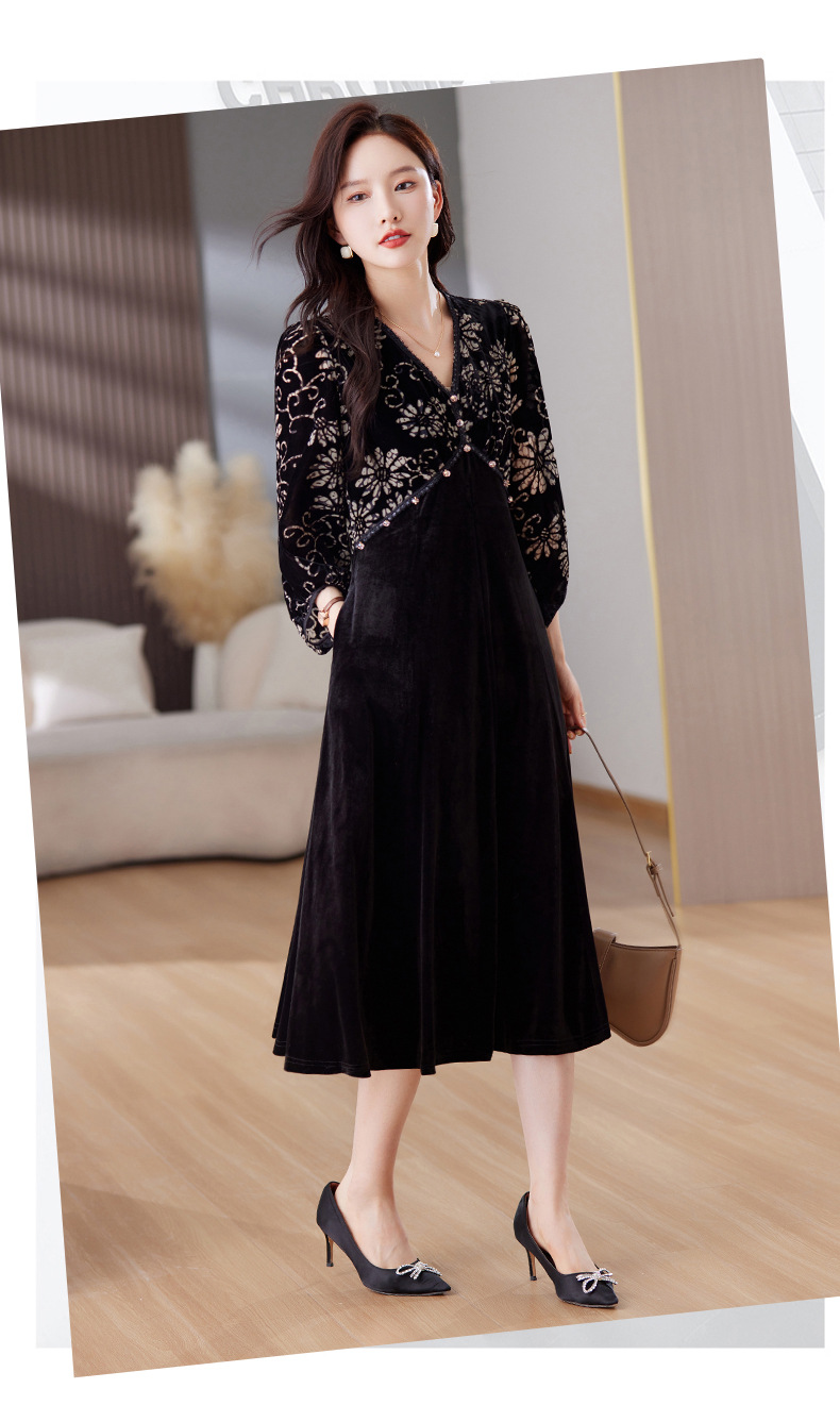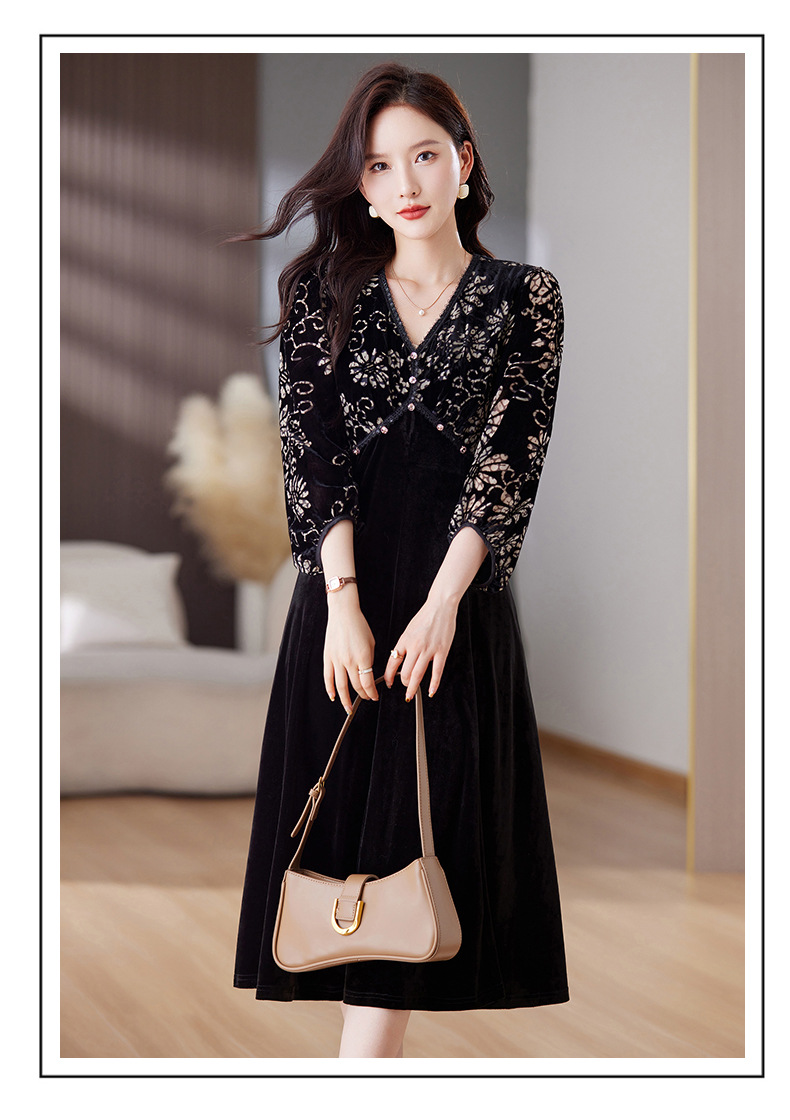 百媚生 钻石绒V领真口袋蕾丝边丝绒连衣裙6023 商品图1