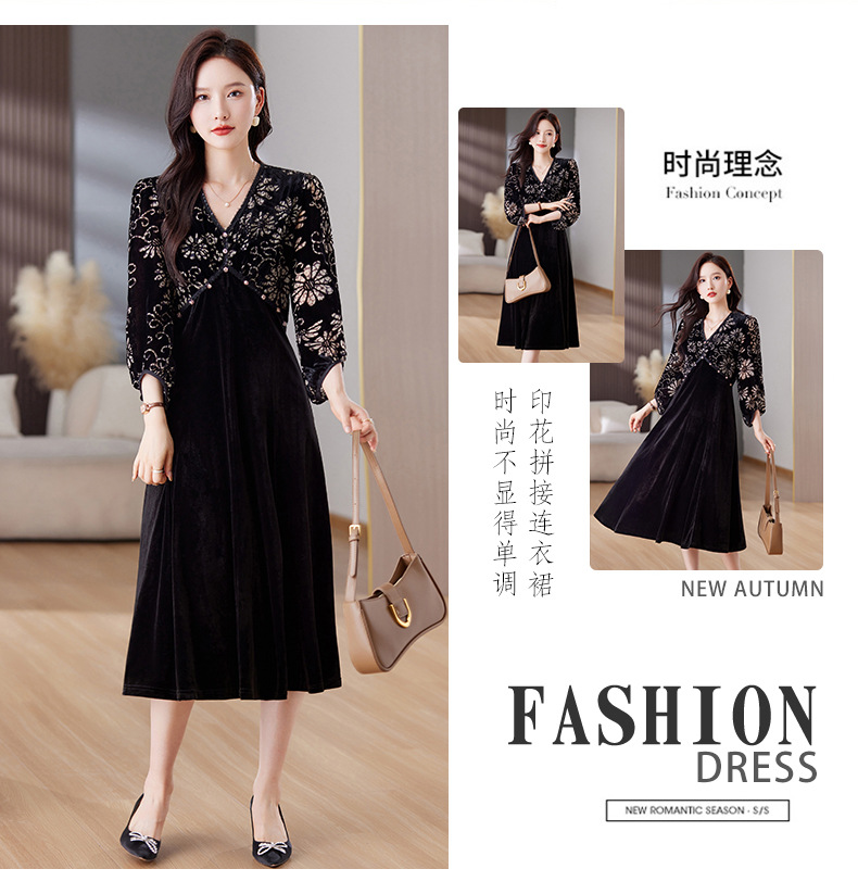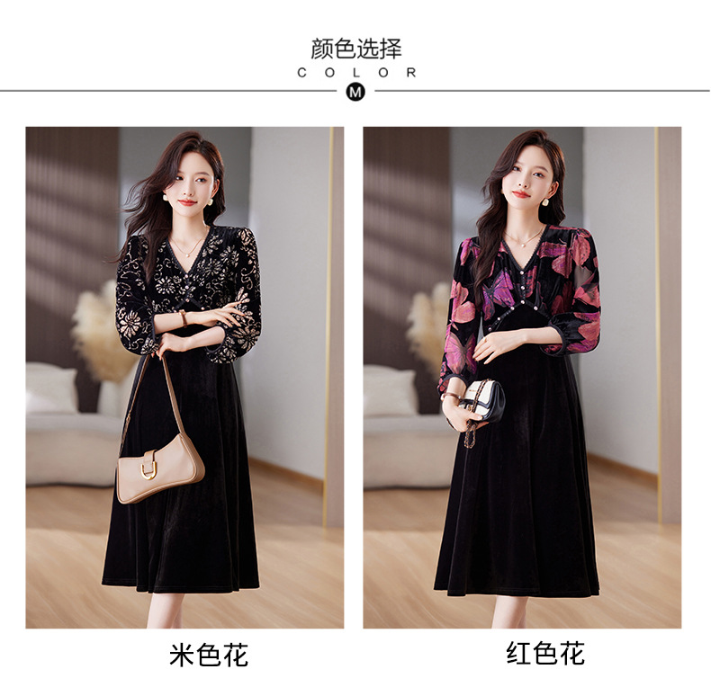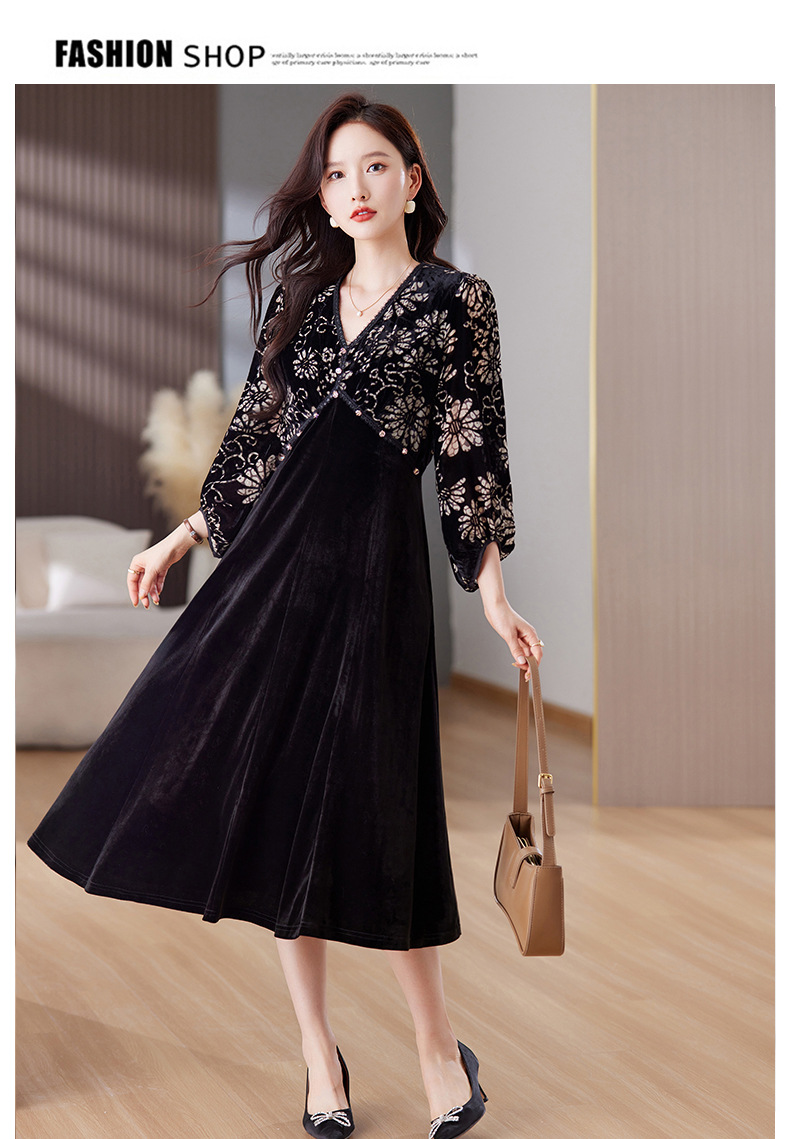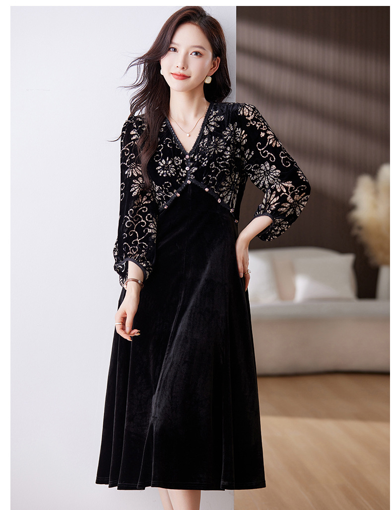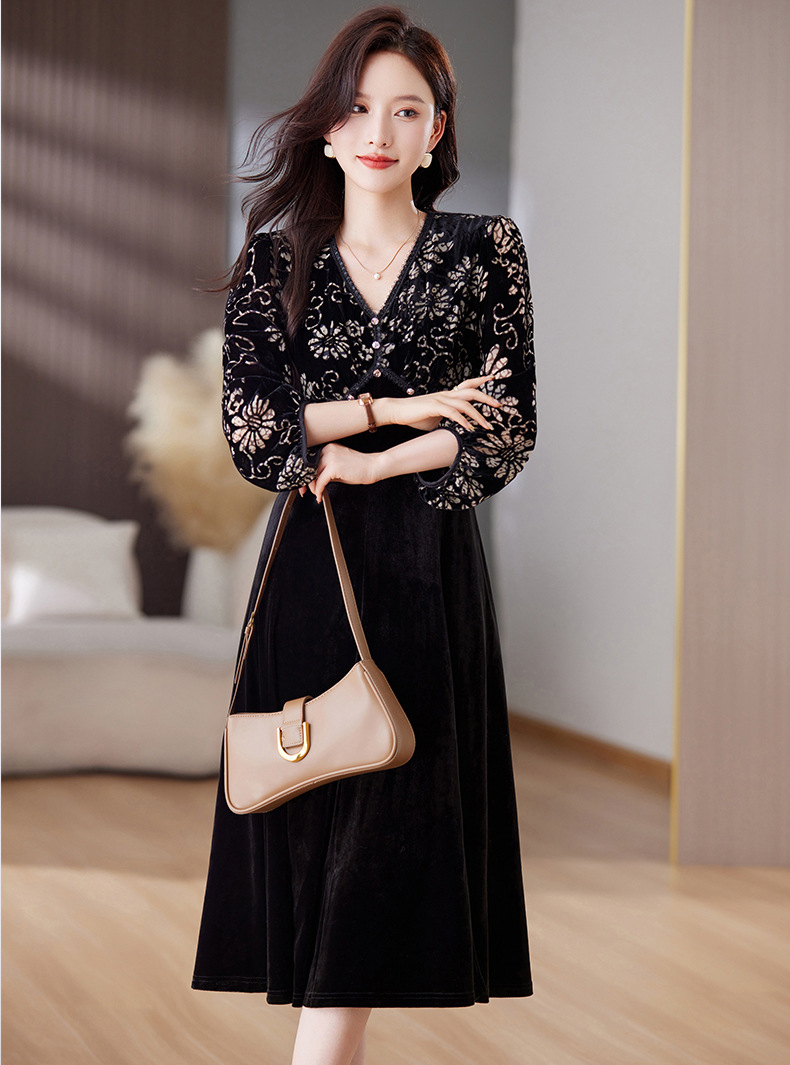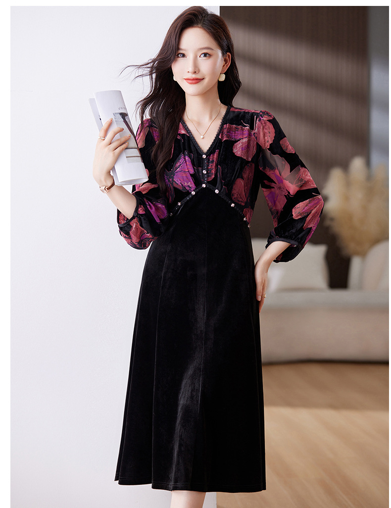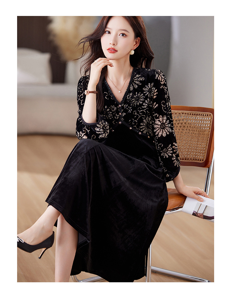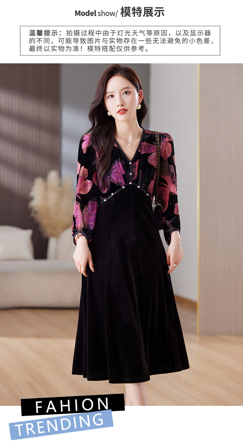 百媚生 钻石绒V领真口袋蕾丝边丝绒连衣裙6023 商品图1