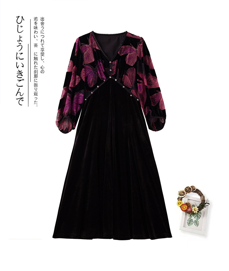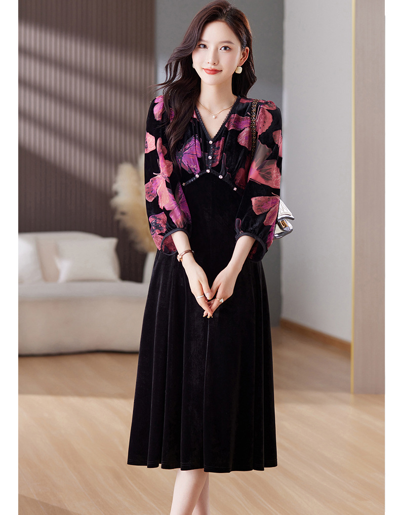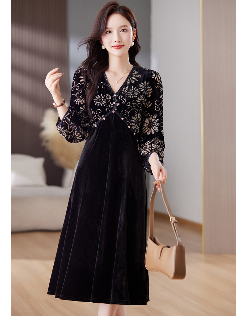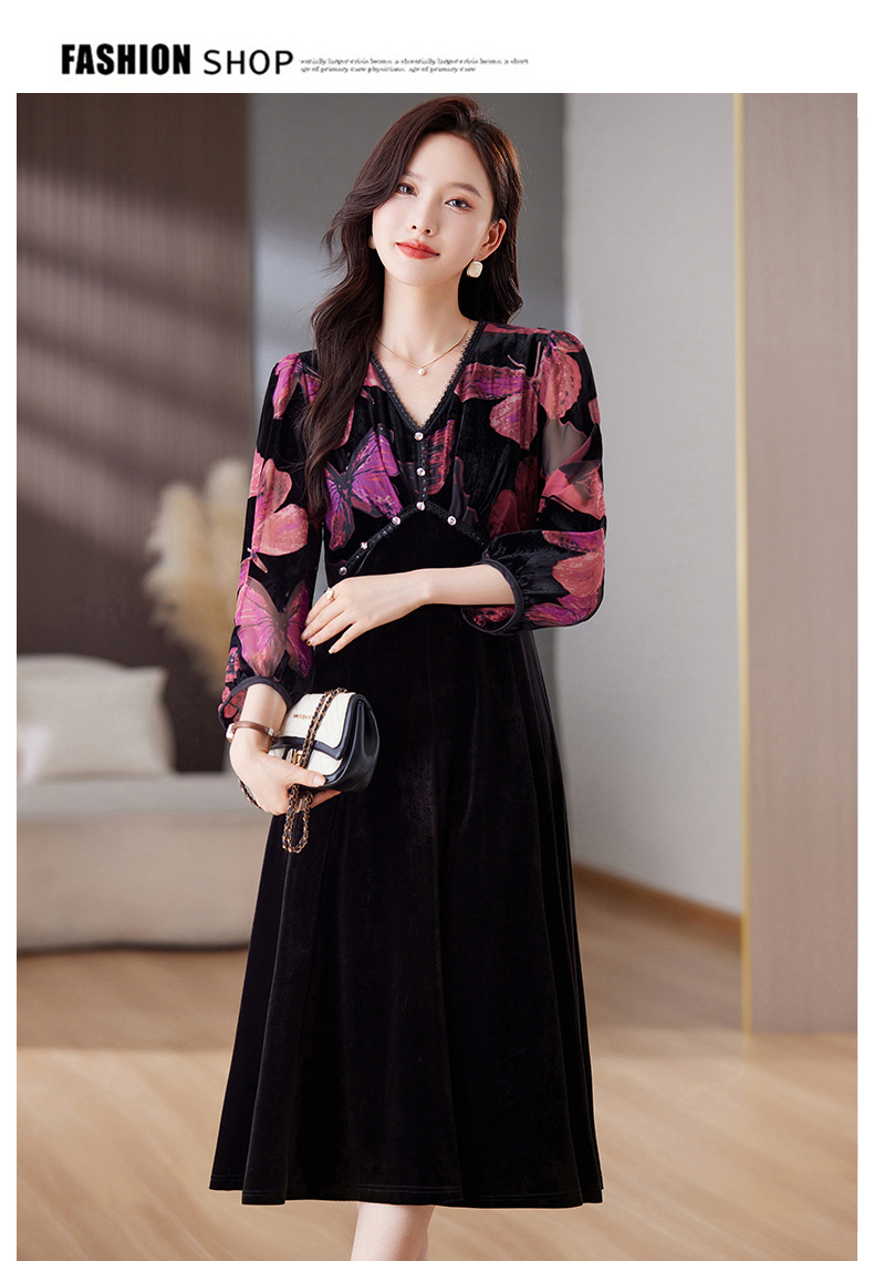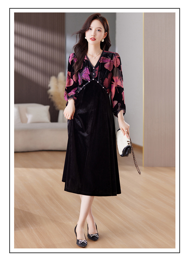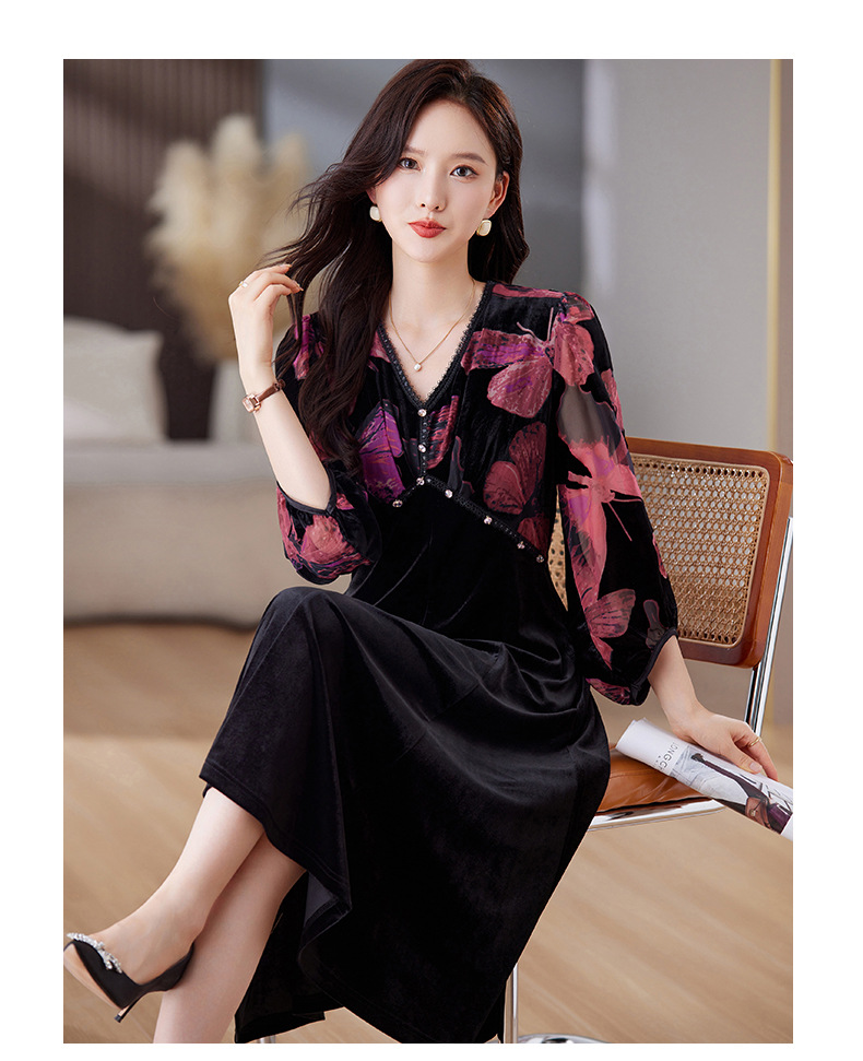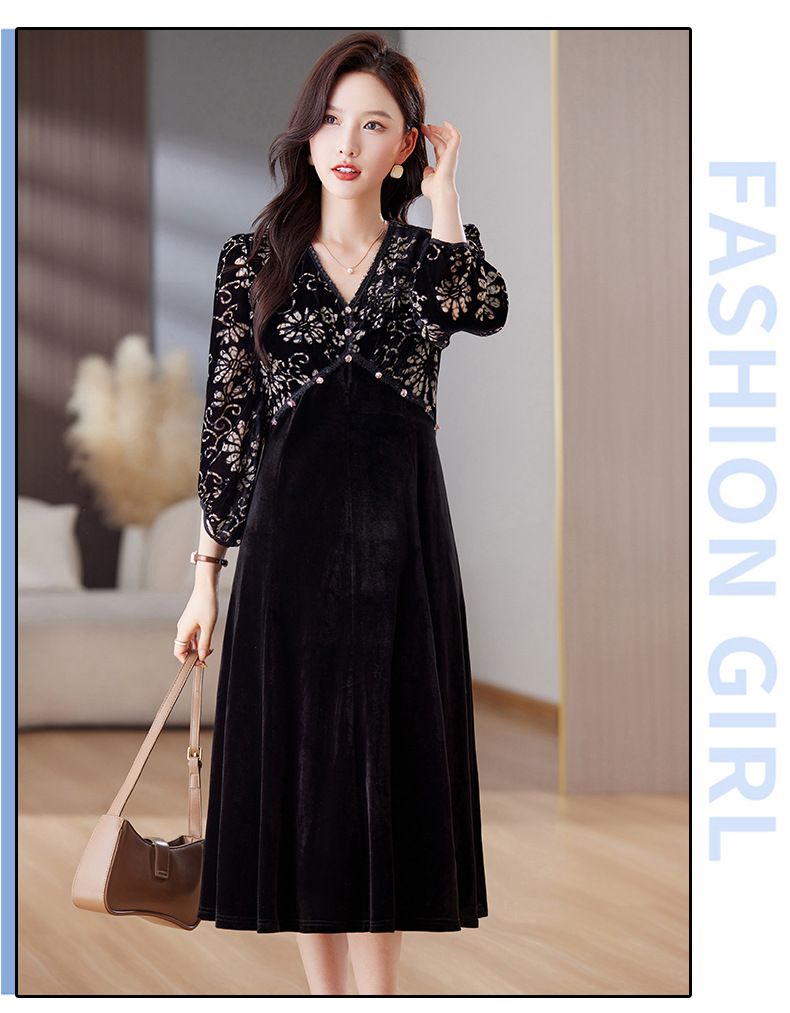百媚生 钻石绒V领真口袋蕾丝边丝绒连衣裙6023 商品图1