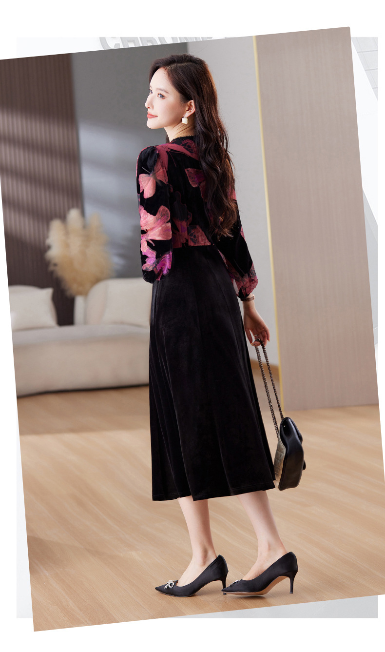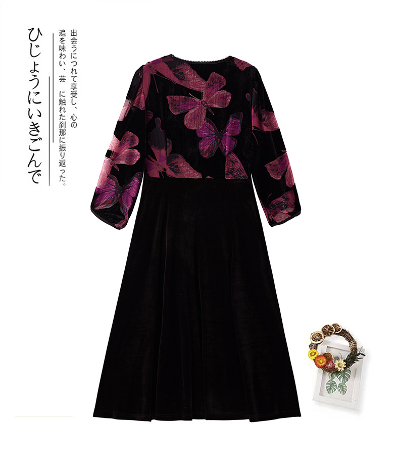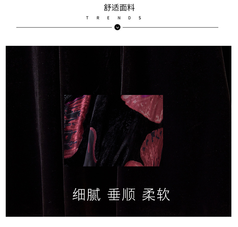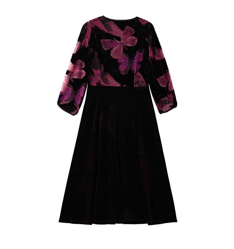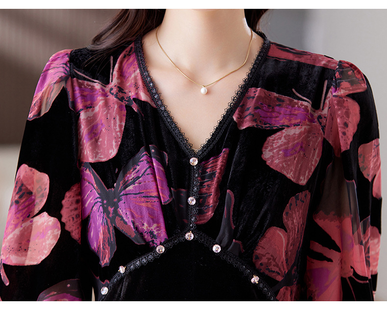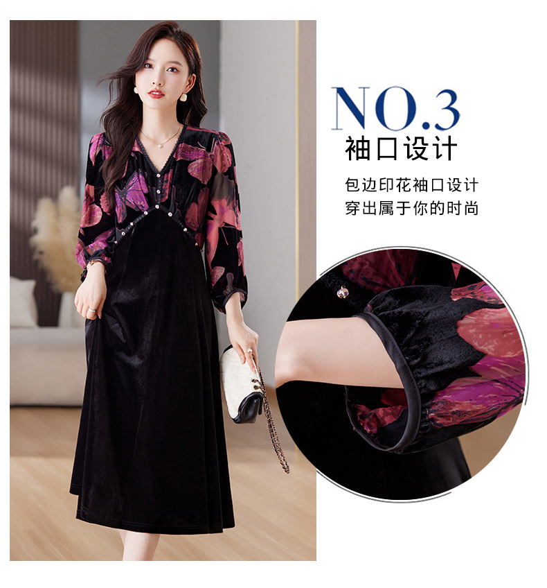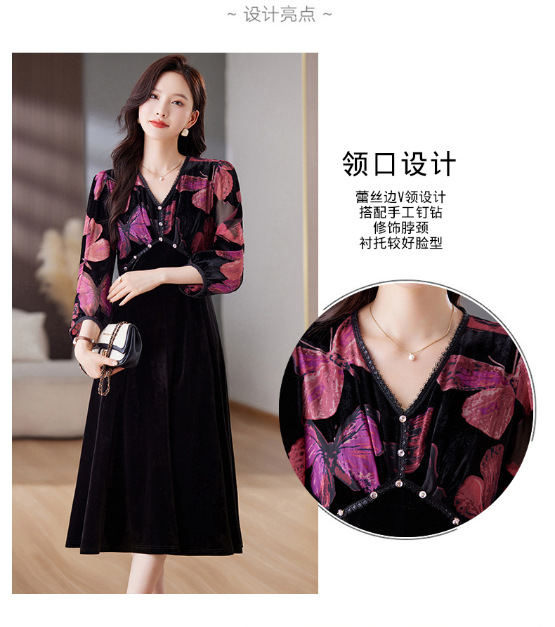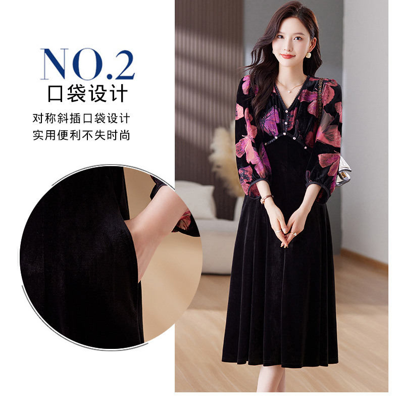 百媚生 钻石绒V领真口袋蕾丝边丝绒连衣裙6023 商品图2