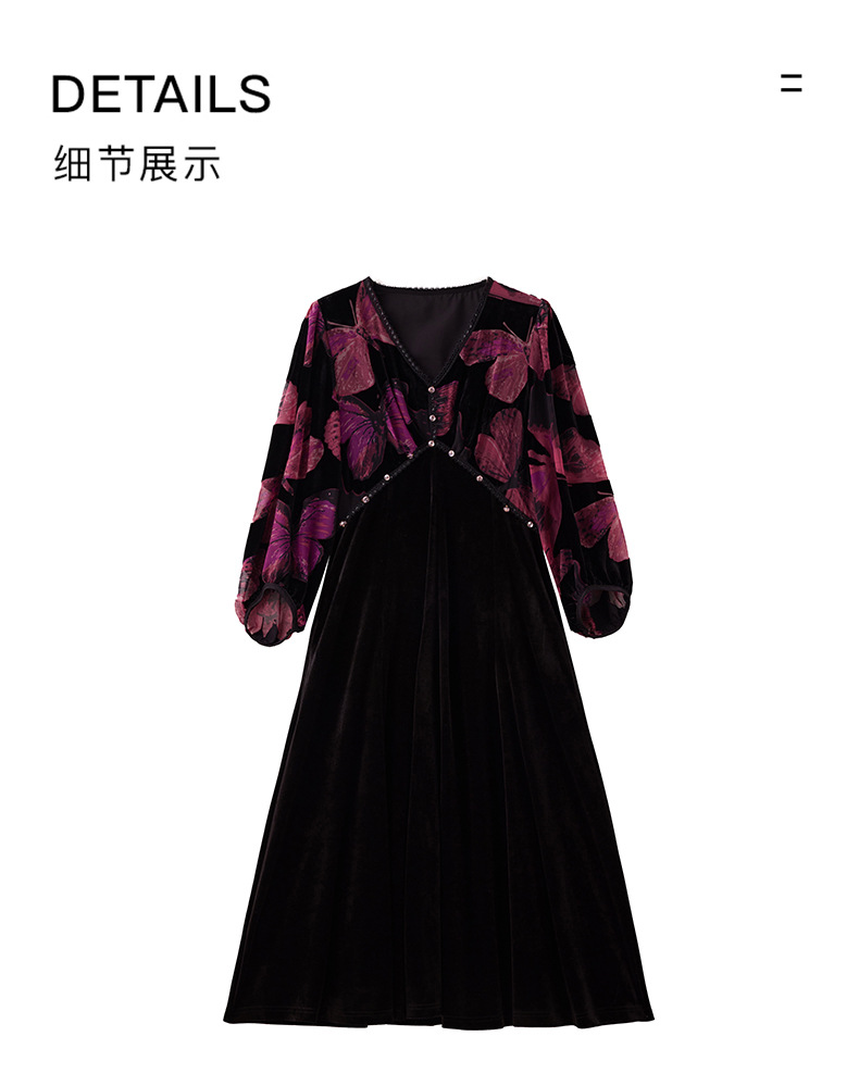 百媚生 钻石绒V领真口袋蕾丝边丝绒连衣裙6023