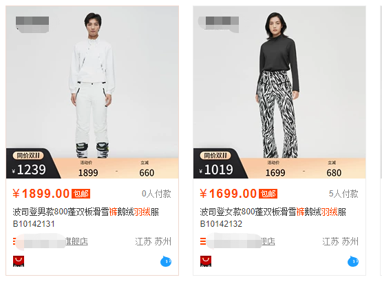 市面上以90%白鸭绒同类型羽绒裤,随手在某宝上一搜,1600+