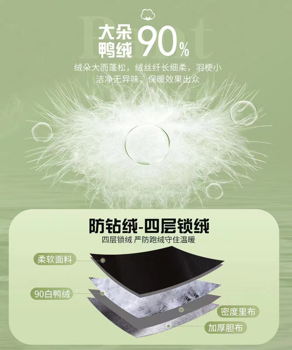采用成熟的鸭绒,绒丝长,绒朵大,舒适度高,优雅纤长,保暖性优秀。