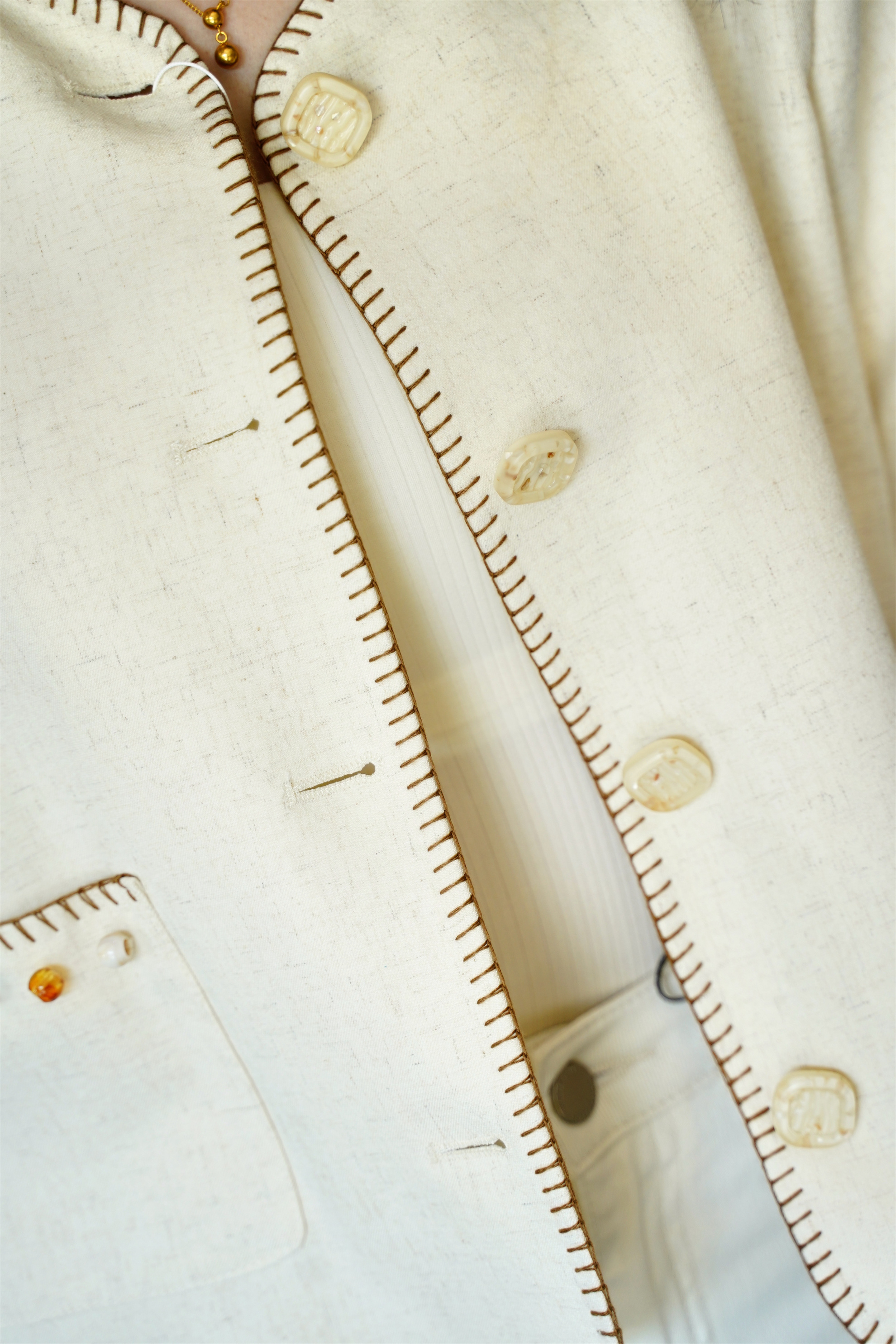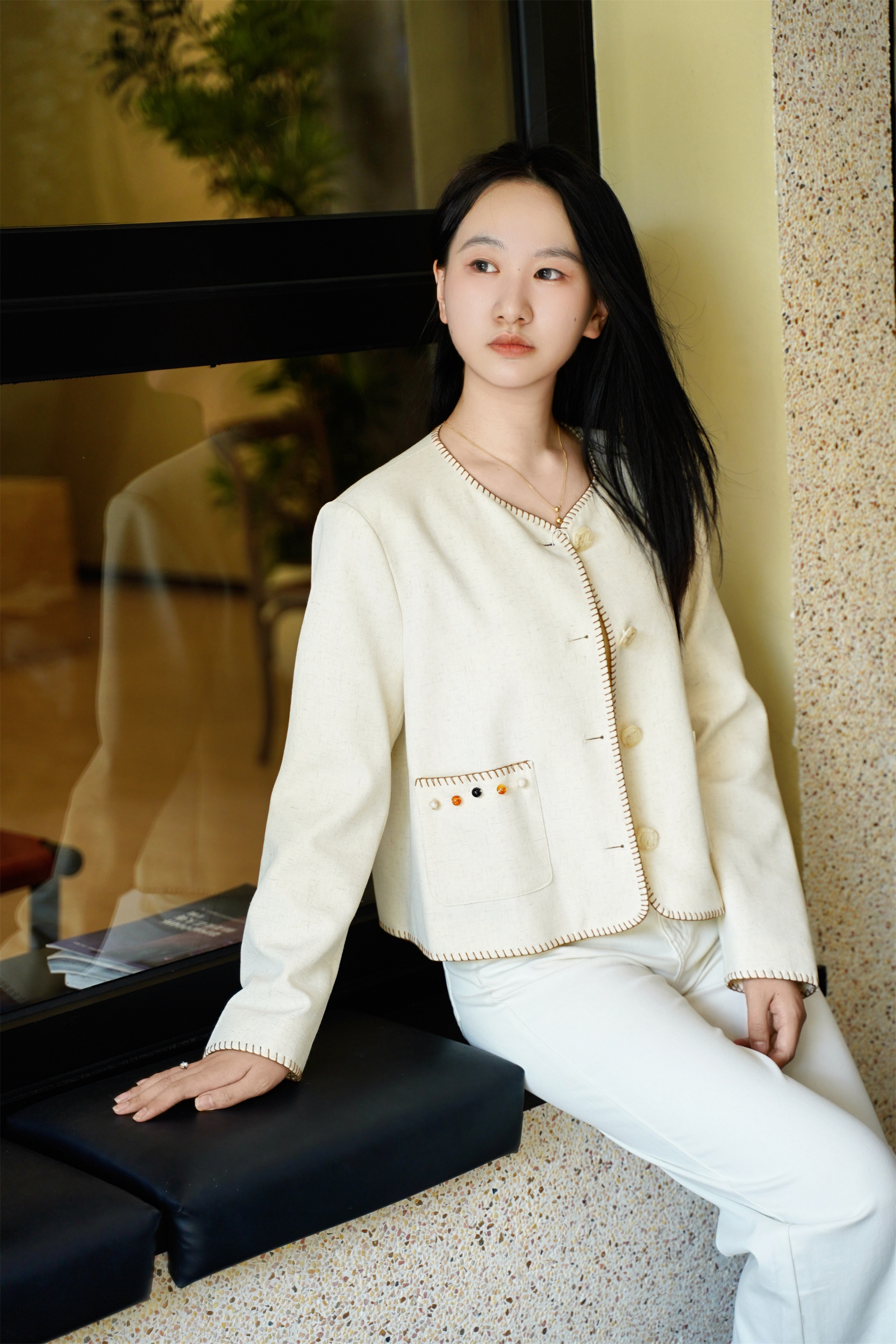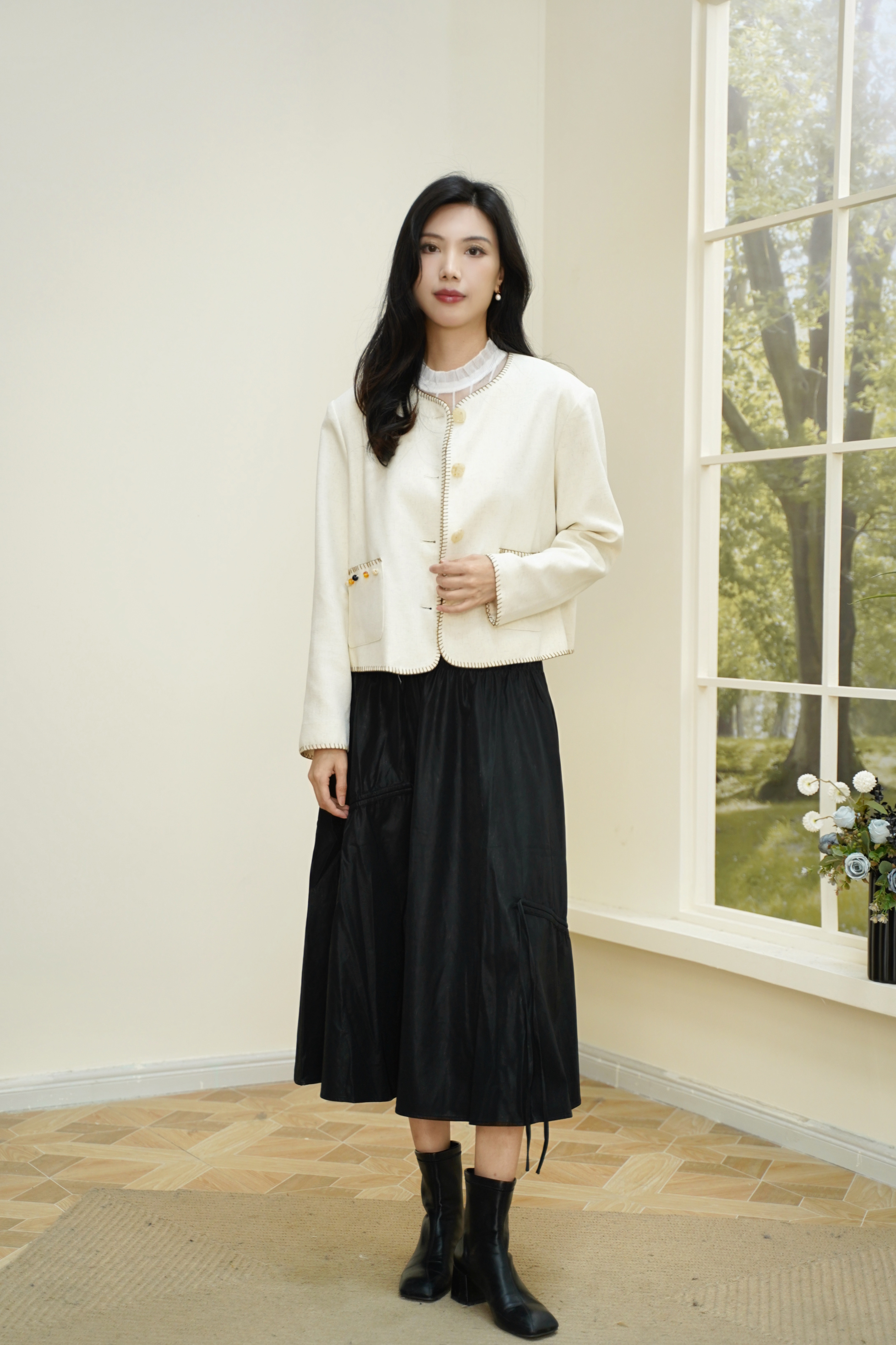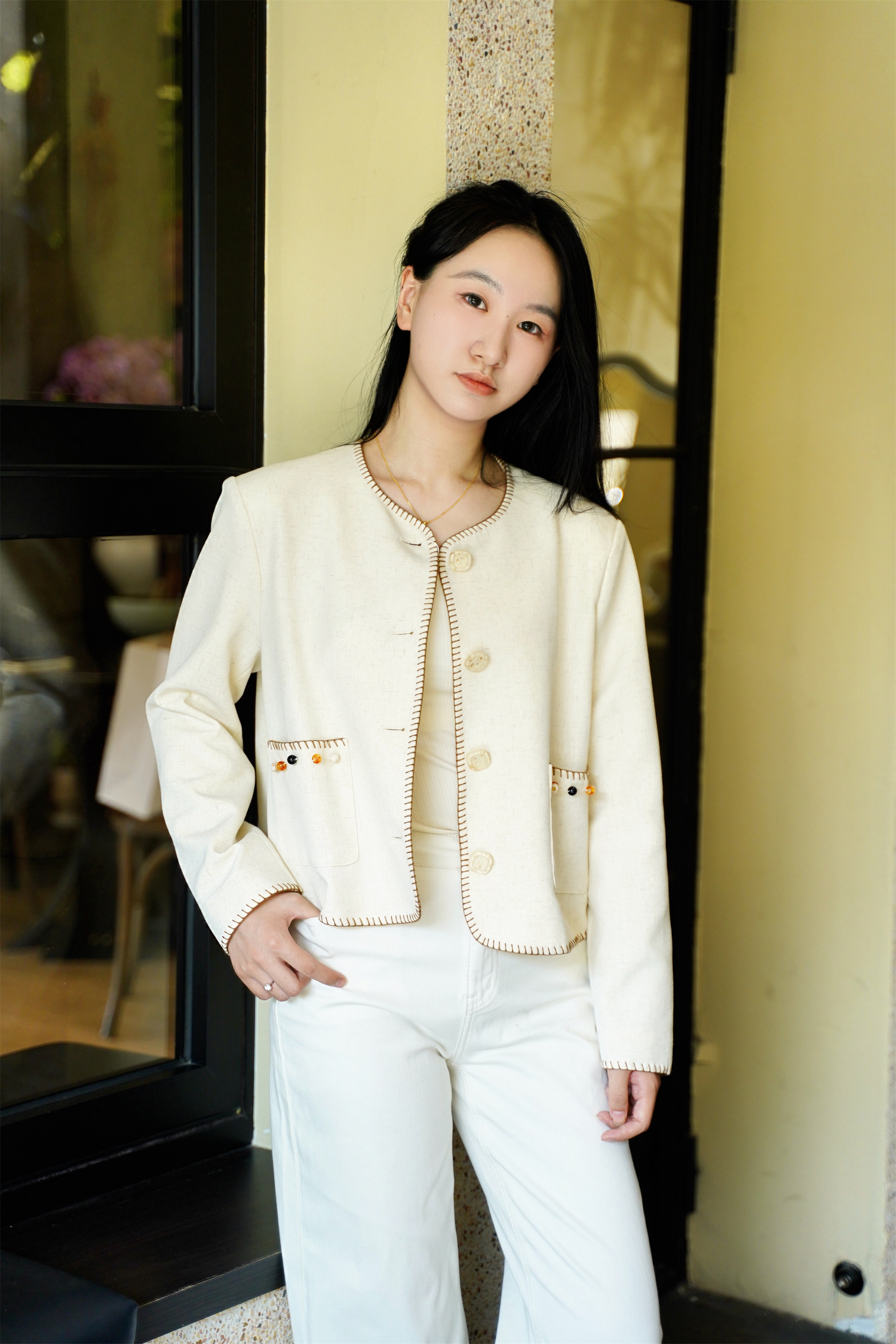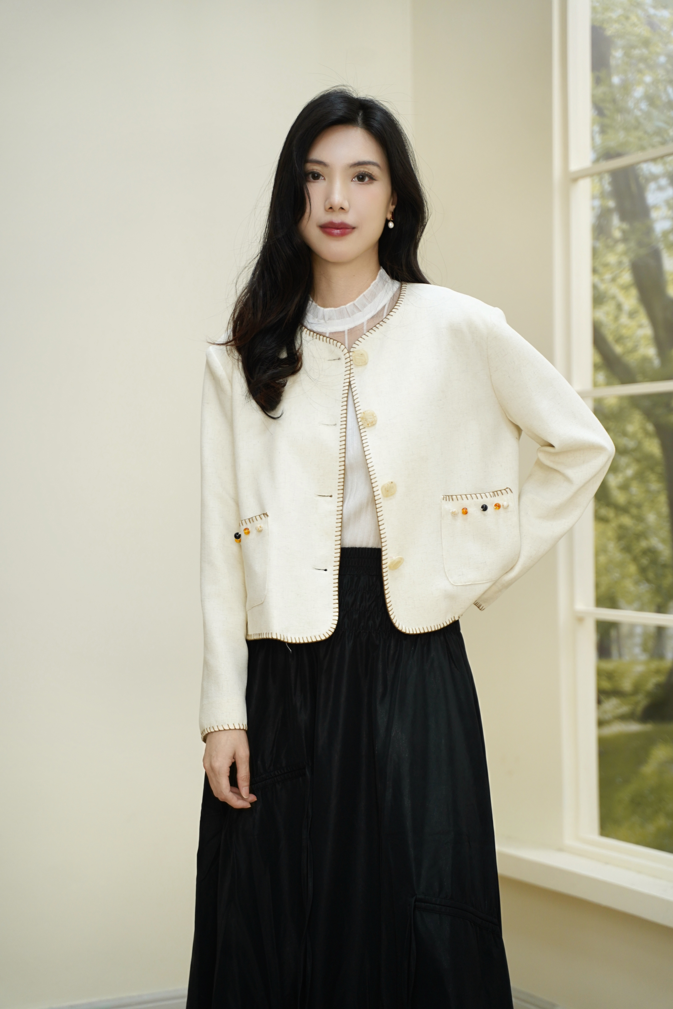 短款箱型+正肩设计,轻松穿出直角肩和薄背~米白色温柔显气质,手工钩边与钉珠装饰处处精致,搭配半裙或牛仔裤,毫不费力打造千金大小姐氛围。