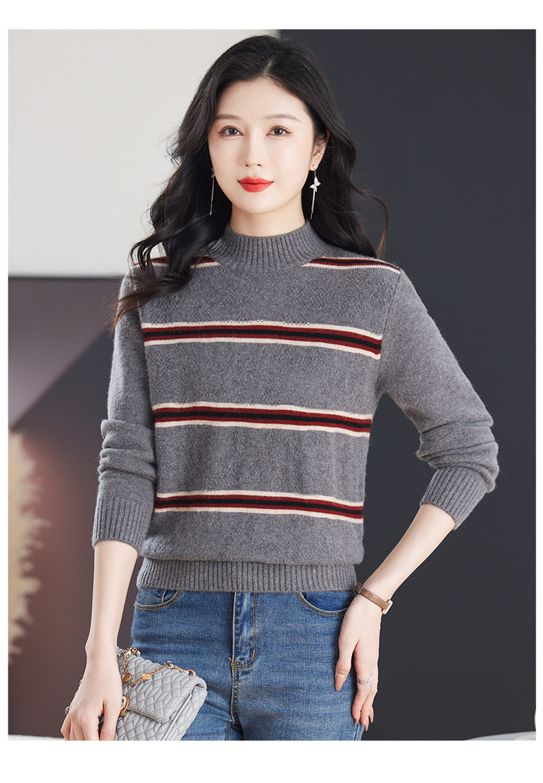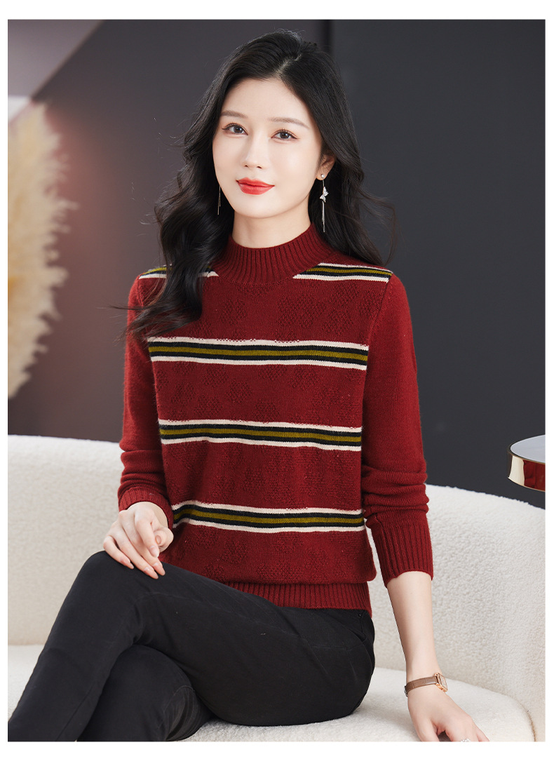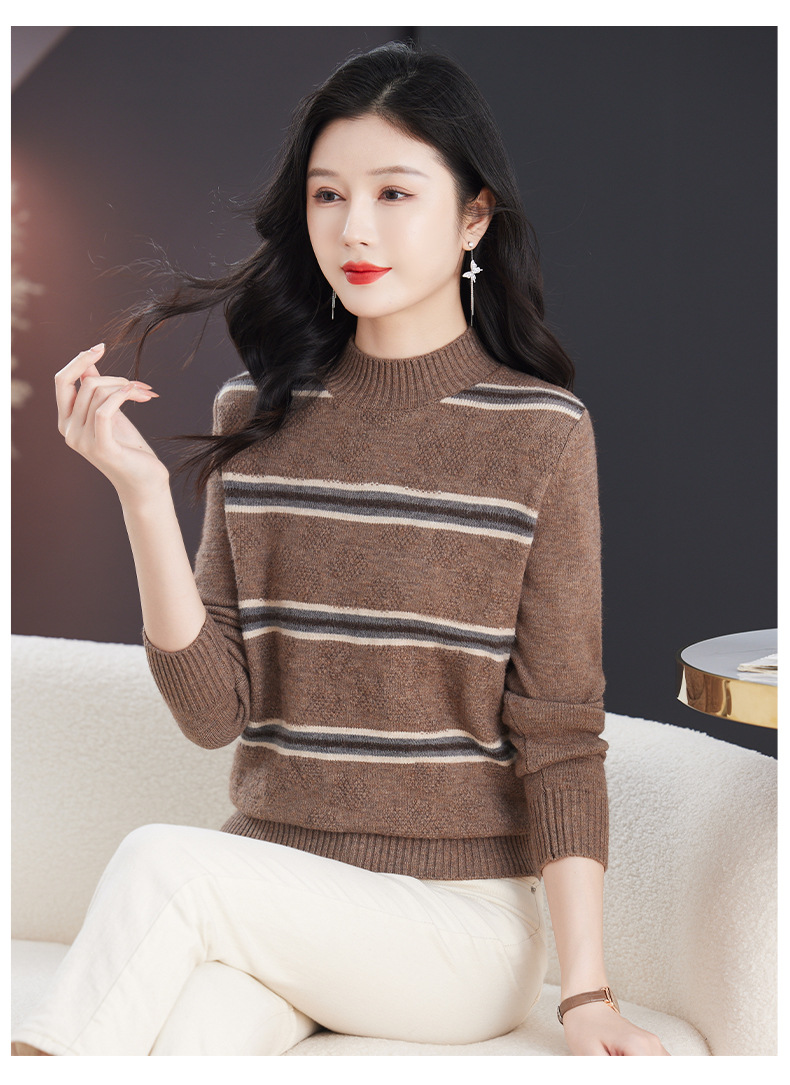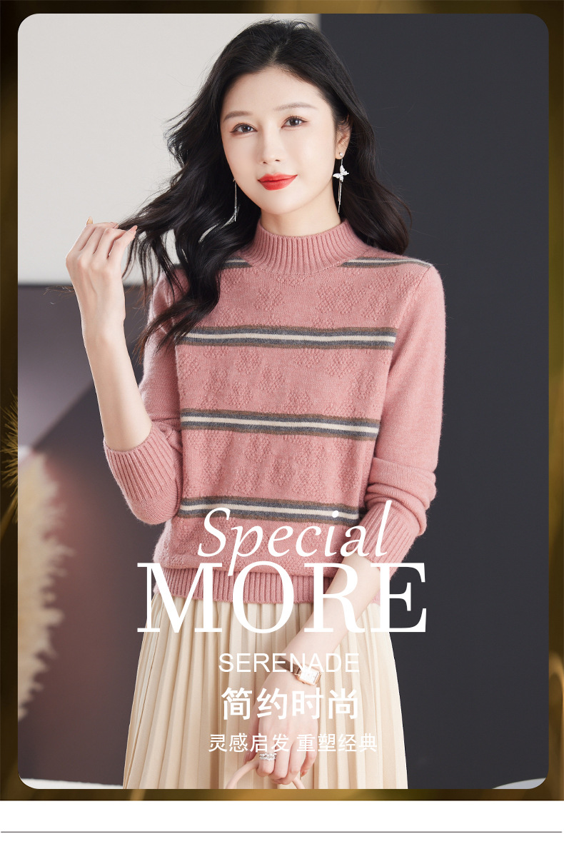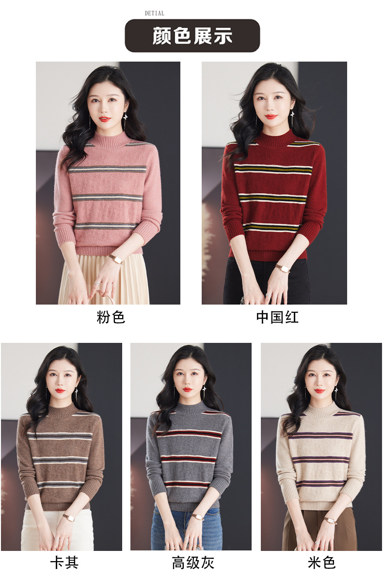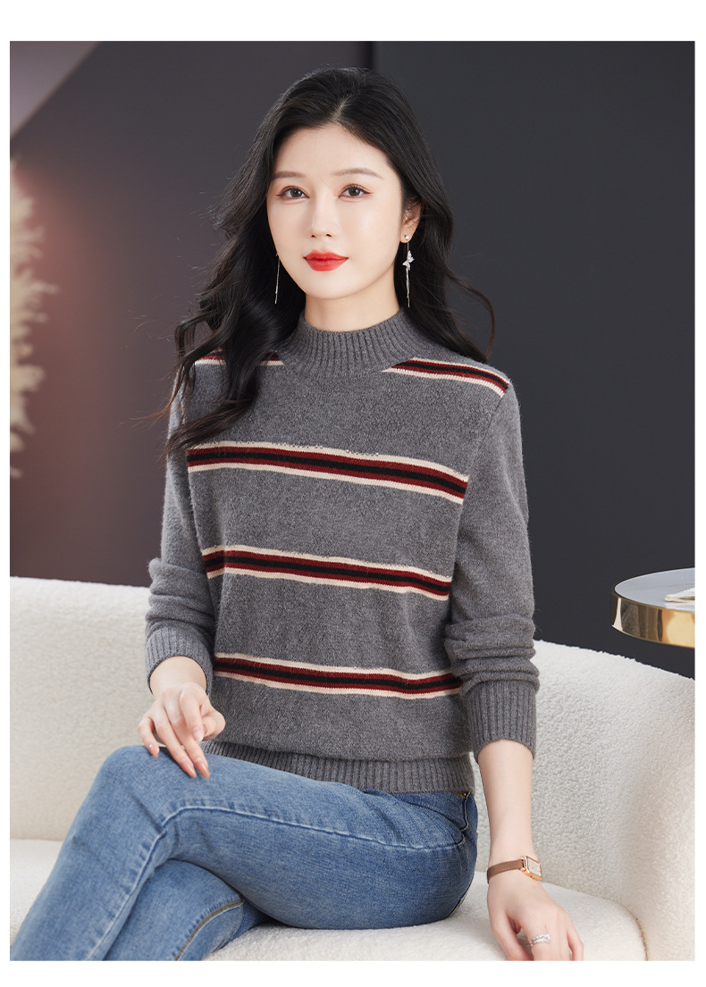 CC-103-79012条纹羊毛针织衫女2024秋冬新款半高领长袖宽松保暖