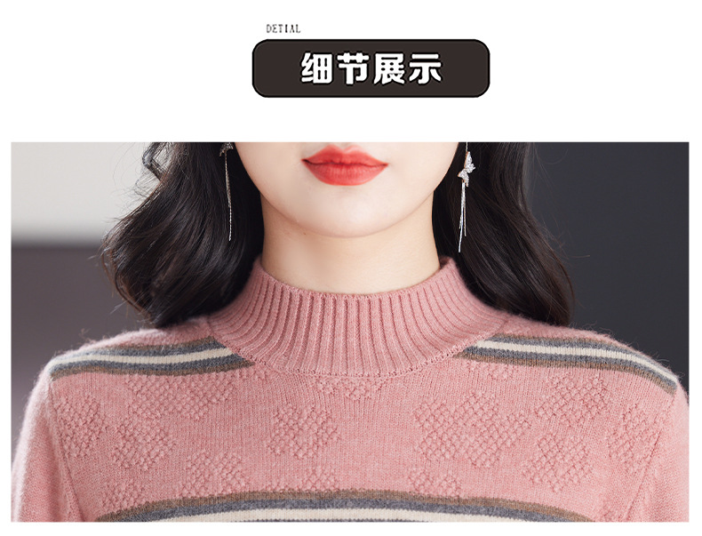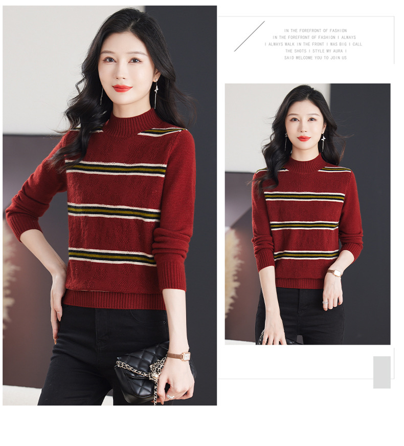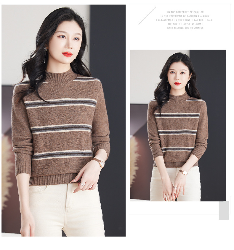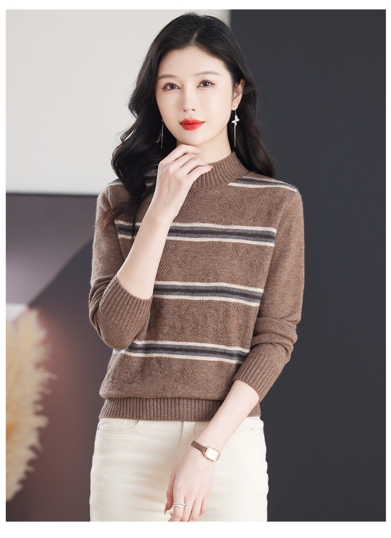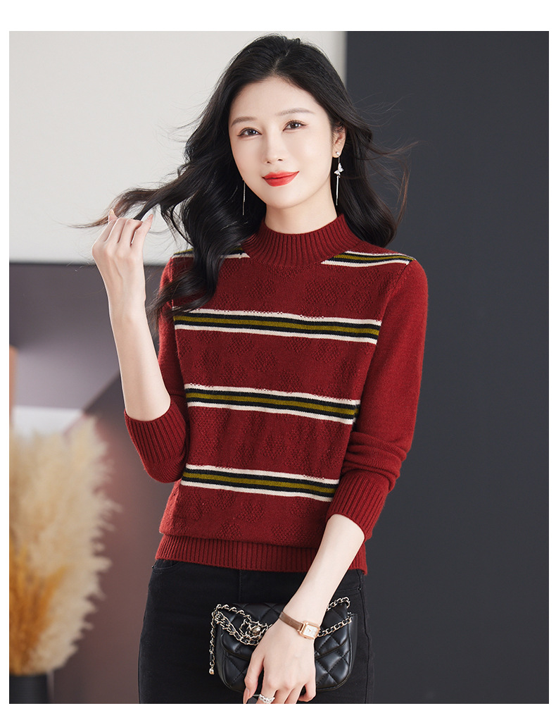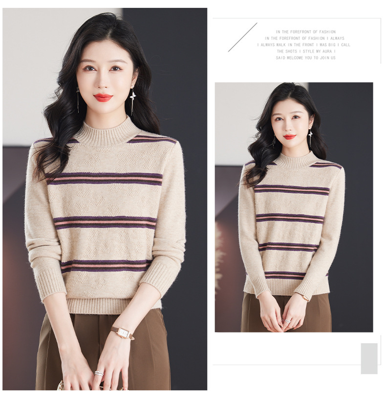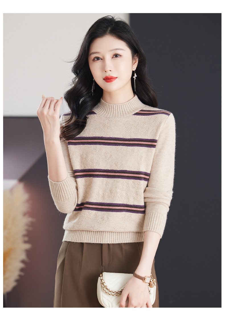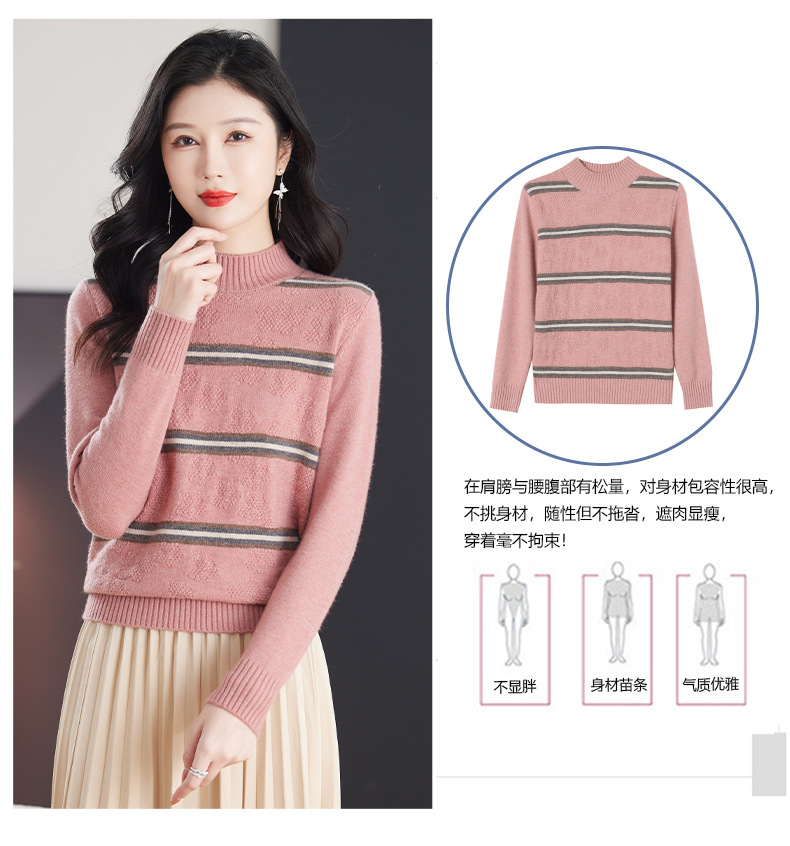 CC-103-79012条纹羊毛针织衫女2024秋冬新款半高领长袖宽松保暖