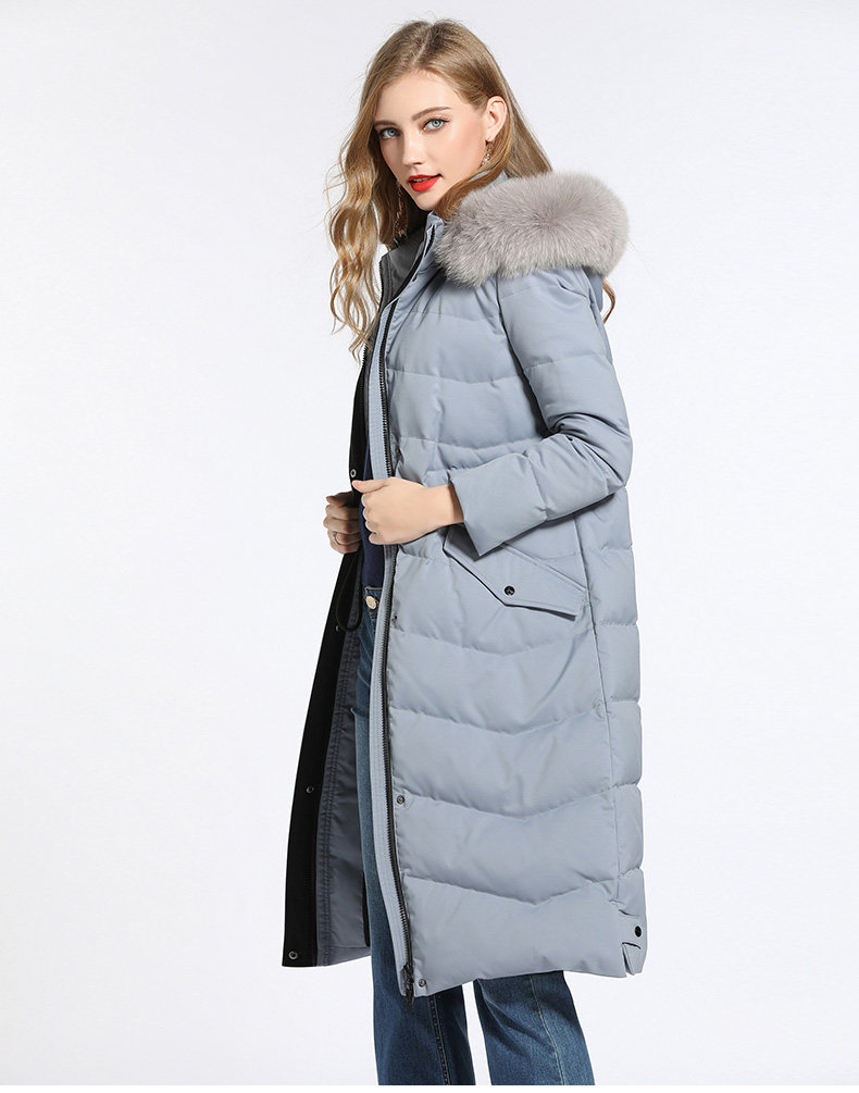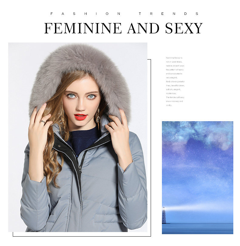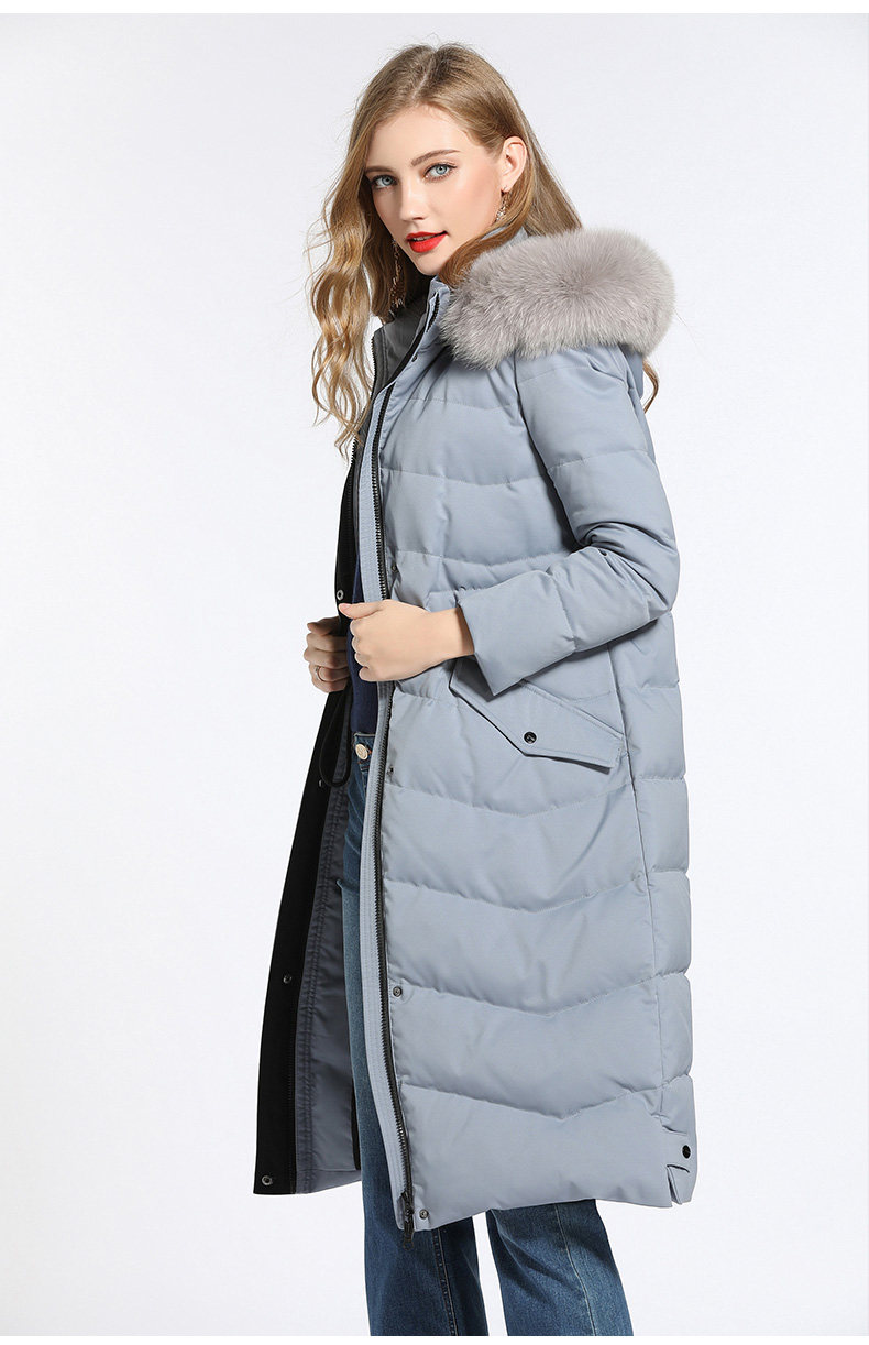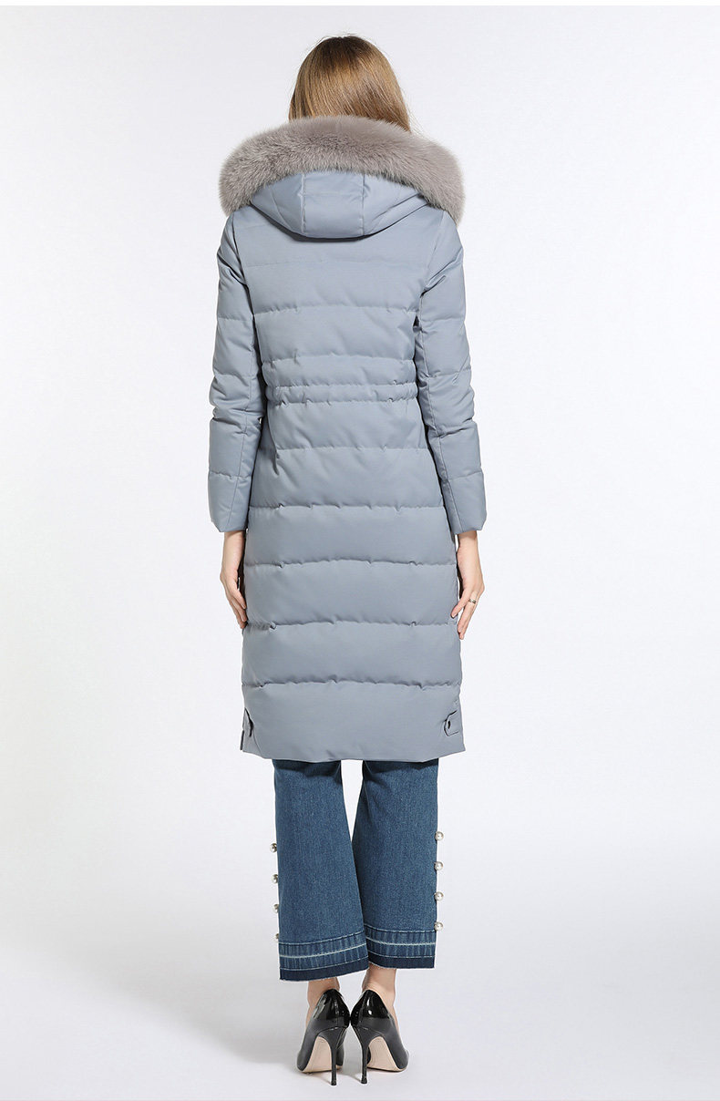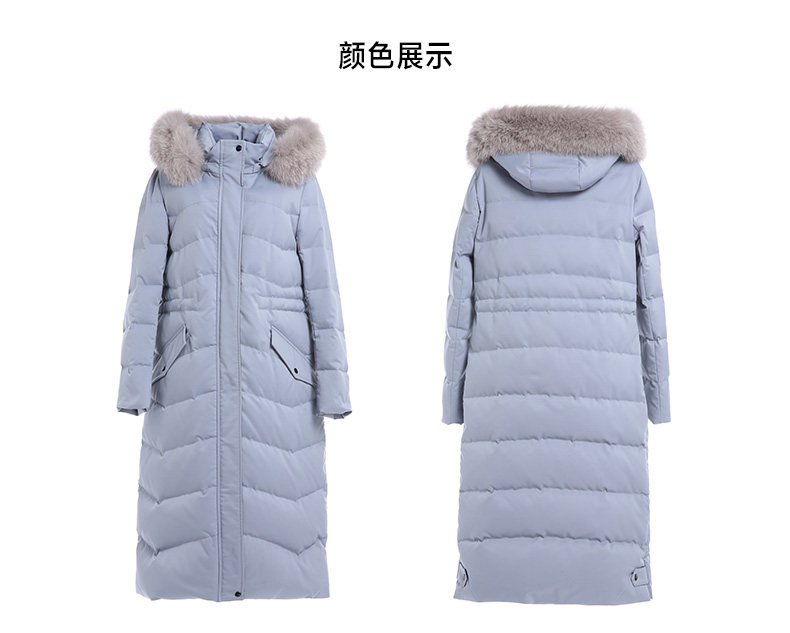 乔万尼羽绒服女清新雾霾蓝修身收腰狐狸毛领过膝长款韩版EB4T051