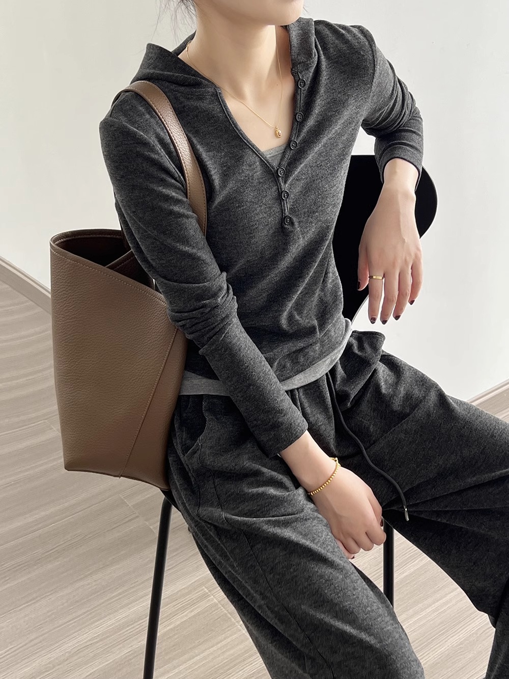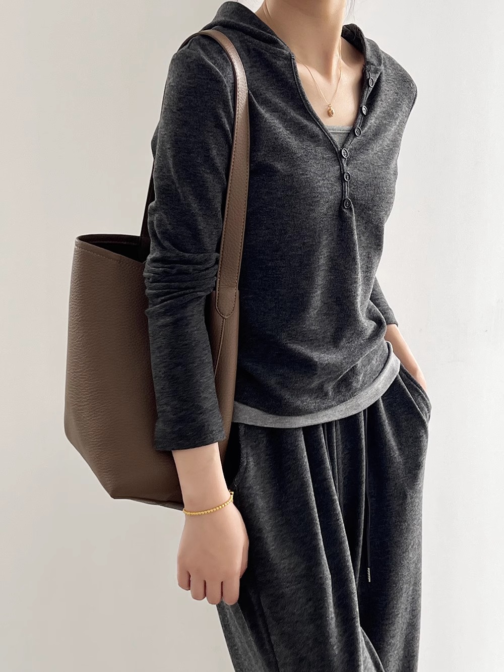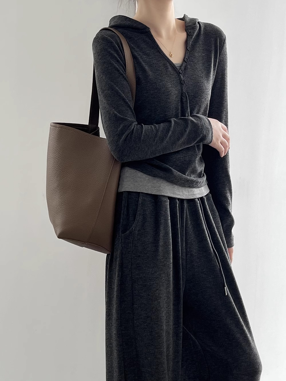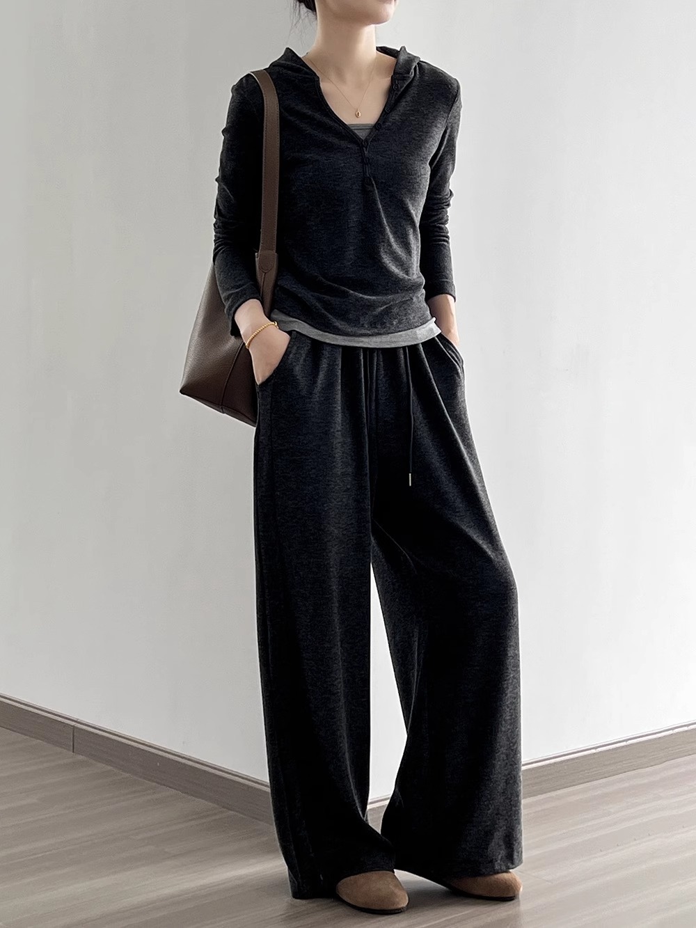 早秋懒人穿搭 | “糯米”连帽三件套 卫衣+吊带+高腰阔腿裤 慵懒高级感套装深灰色