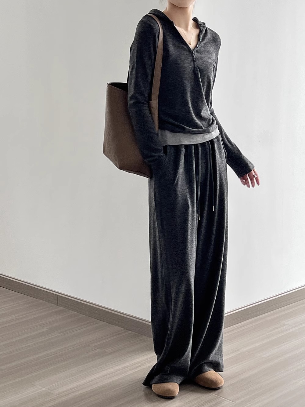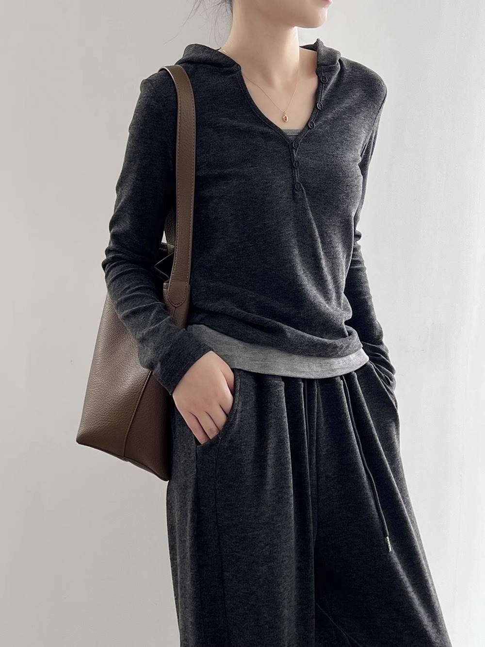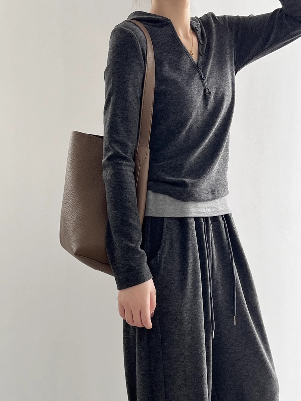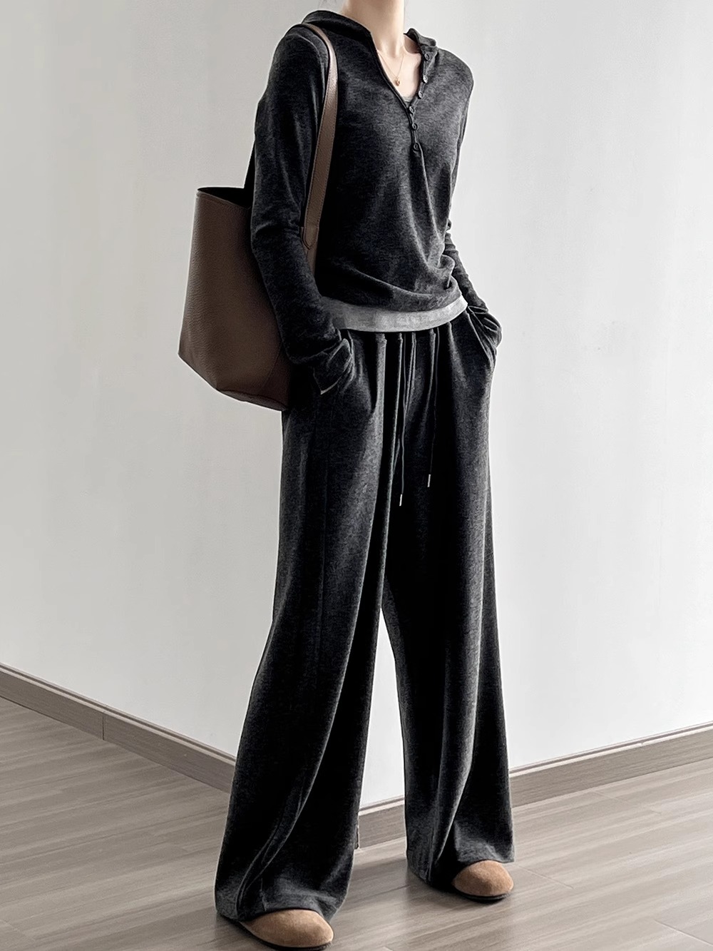 早秋懒人穿搭 | “糯米”连帽三件套 卫衣+吊带+高腰阔腿裤 慵懒高级感套装深灰色