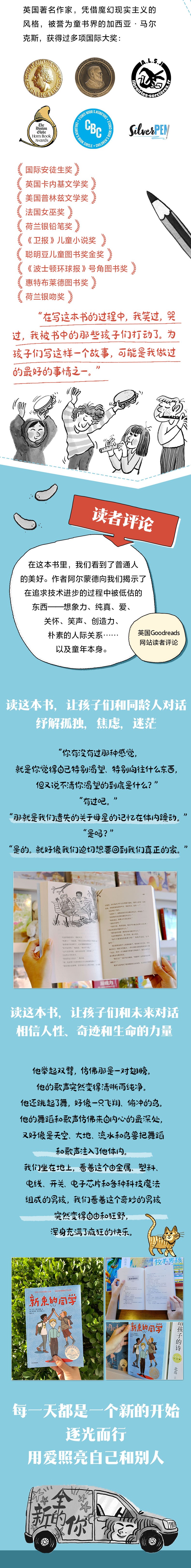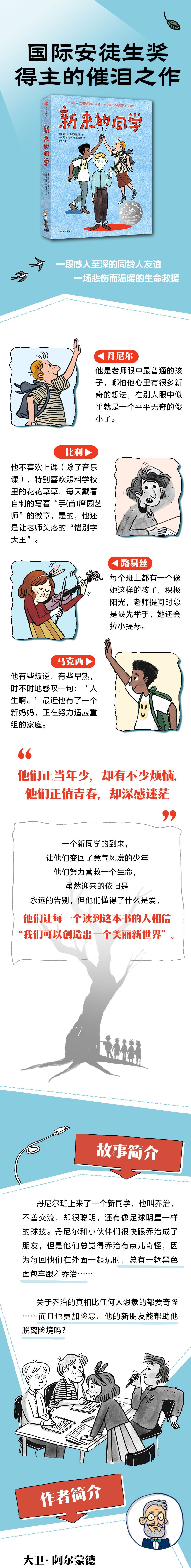★ 作者大卫• 阿尔蒙德系2010年国际安徒生奖得主。先后斩获英国卡内基文学奖、美国普林兹文学奖、荷兰银铅笔奖等多项大奖。阿尔蒙德凭借魔幻现实主义的风格,被誉为童书界的加西亚·马尔克斯,他的作品跨越了文化差异,引进中国后也深受喜爱。《新来的同学》是他的新作,他评论这本书:“在写这本书的过程中,我笑过,哭过,我被书中的那些孩子们打动了。为孩子们写这样一个故事,可能是我做过的最好的事情之一。”