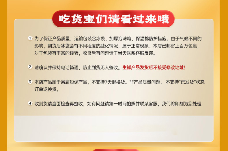 3.冷冻食品请确定好信息下单,下单后不支持7天无理由退换货/更改地址,部分更改地址需收取费用(费用快递收取),请留意。