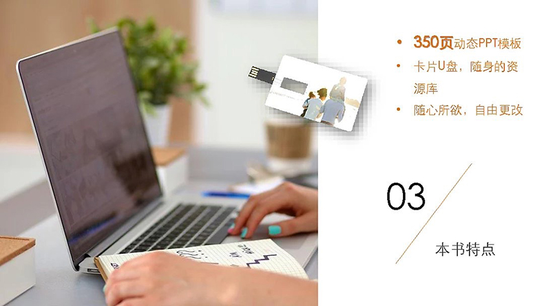 •配套卡片U盘,随身的资源库;提供350页动态PPT模板, 随心所欲,自由更改