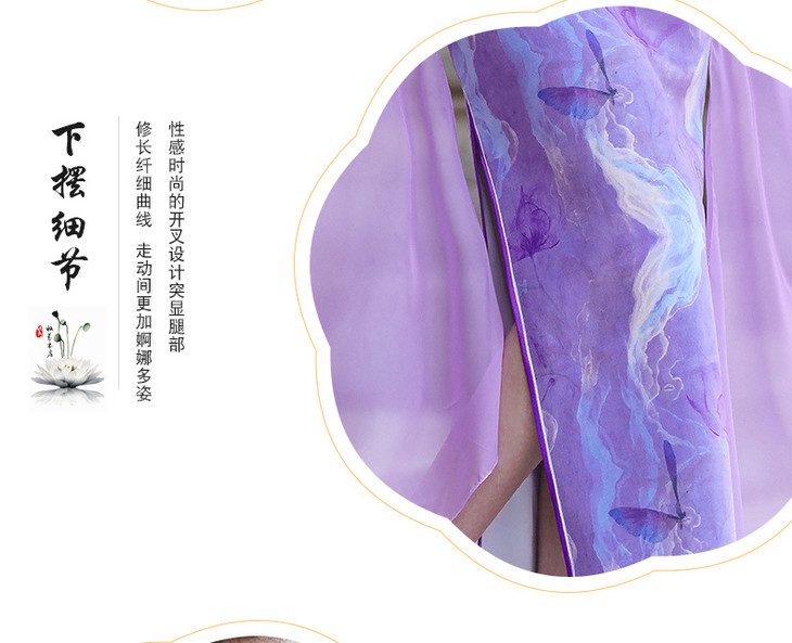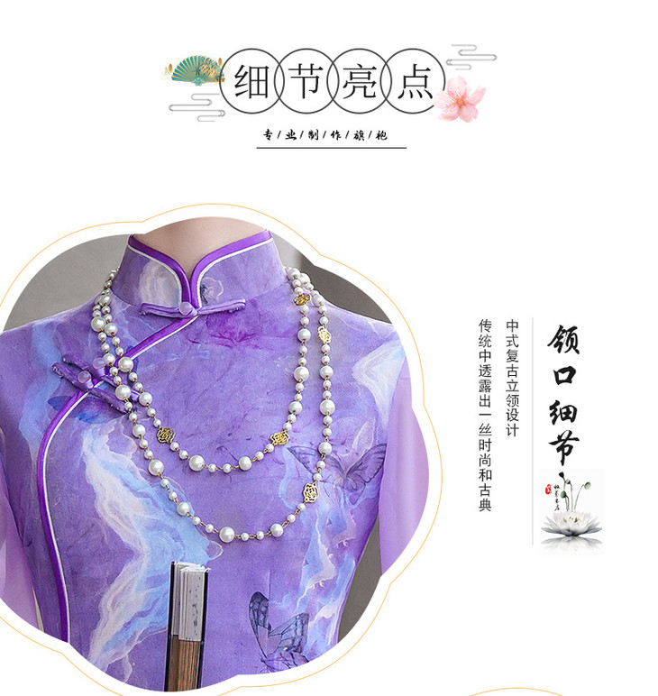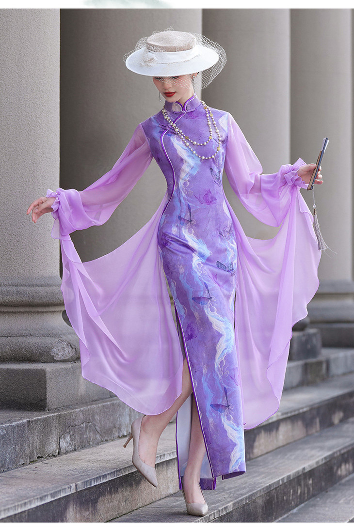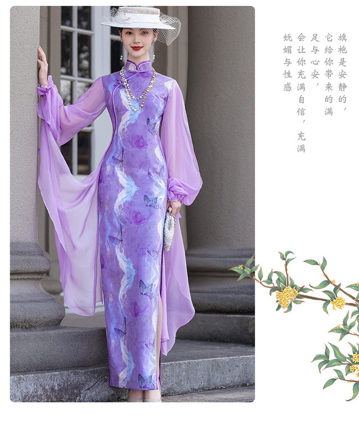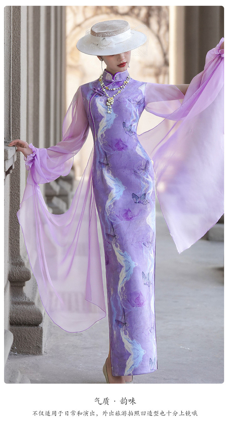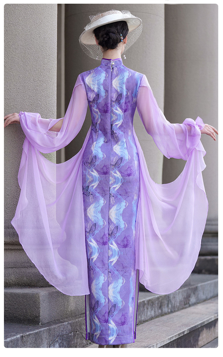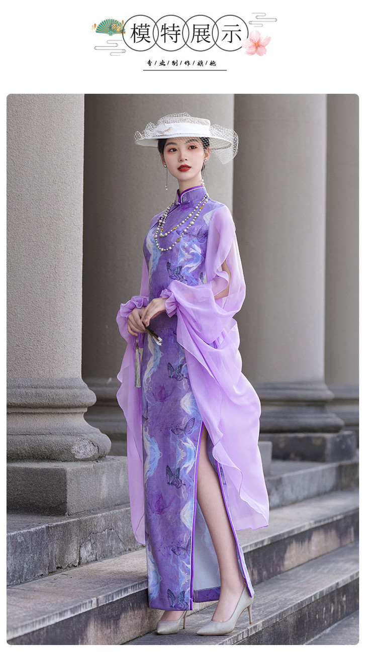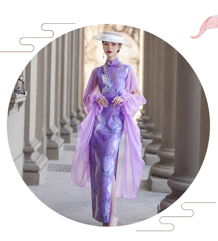 紫色新款中式改良立领法式网纱蝴蝶袖旗袍NL20250422