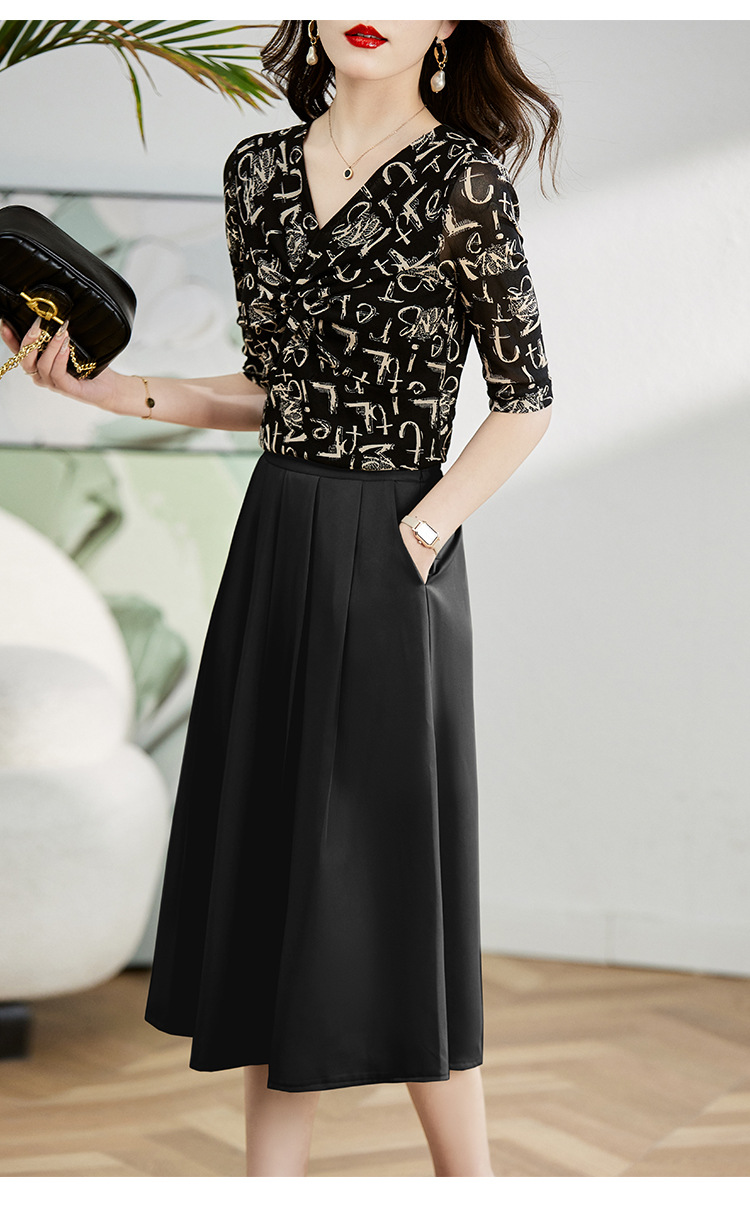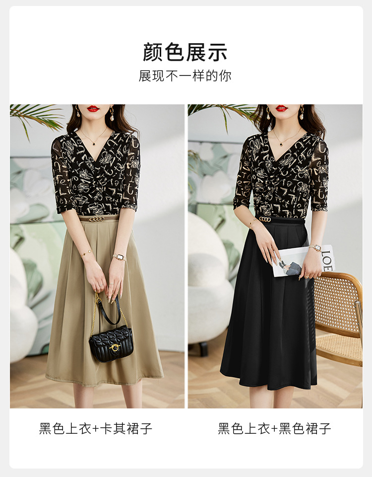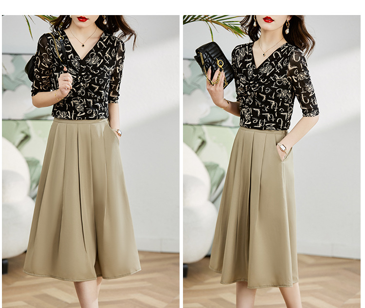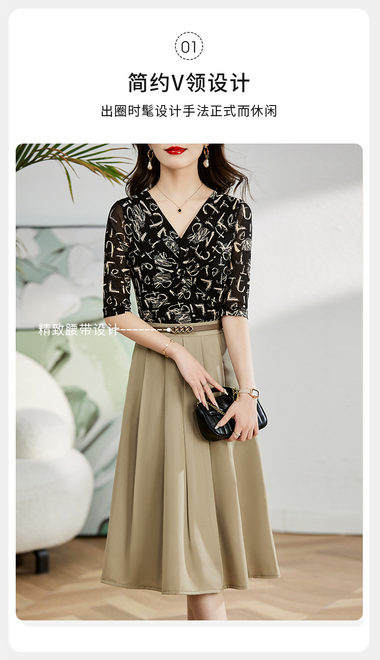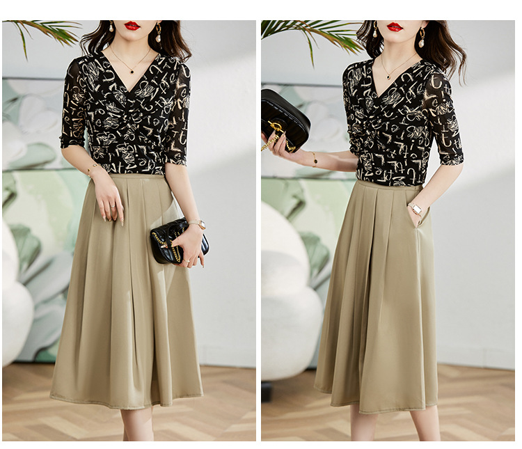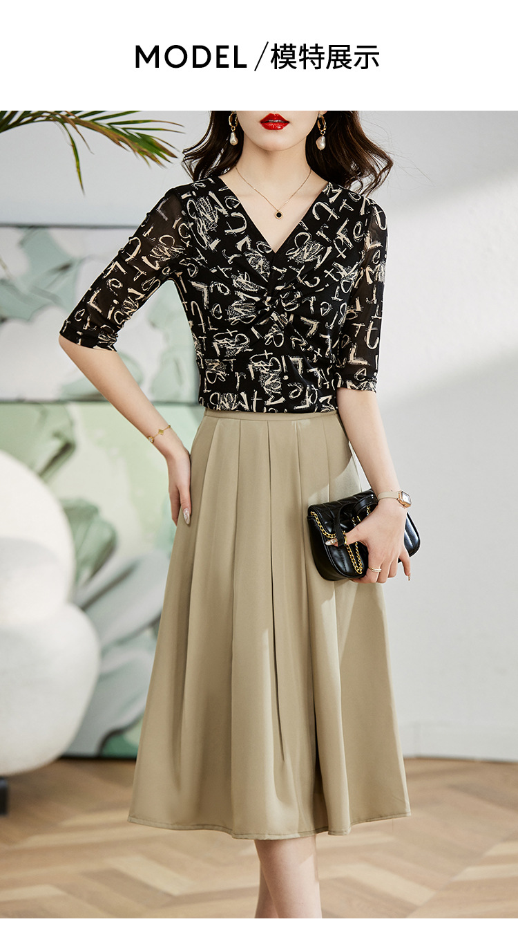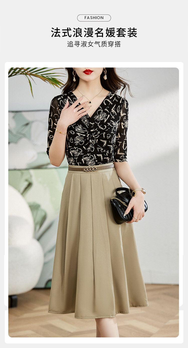 夏季新款,时尚百搭气质感印花V领上衣搭中长款百褶裙两件套HR-WG83189