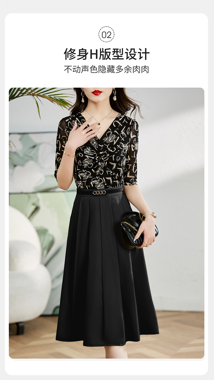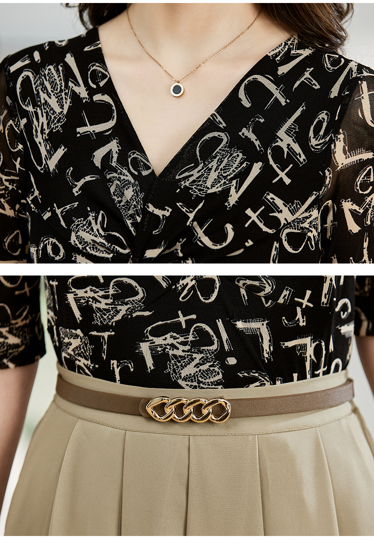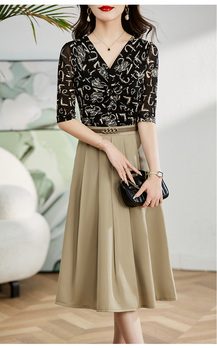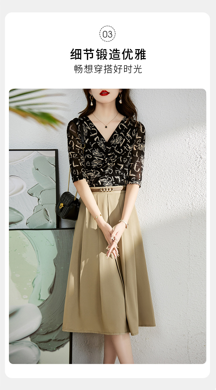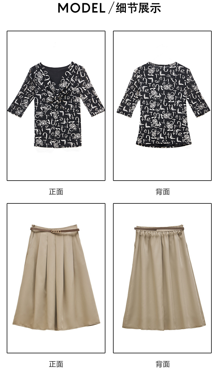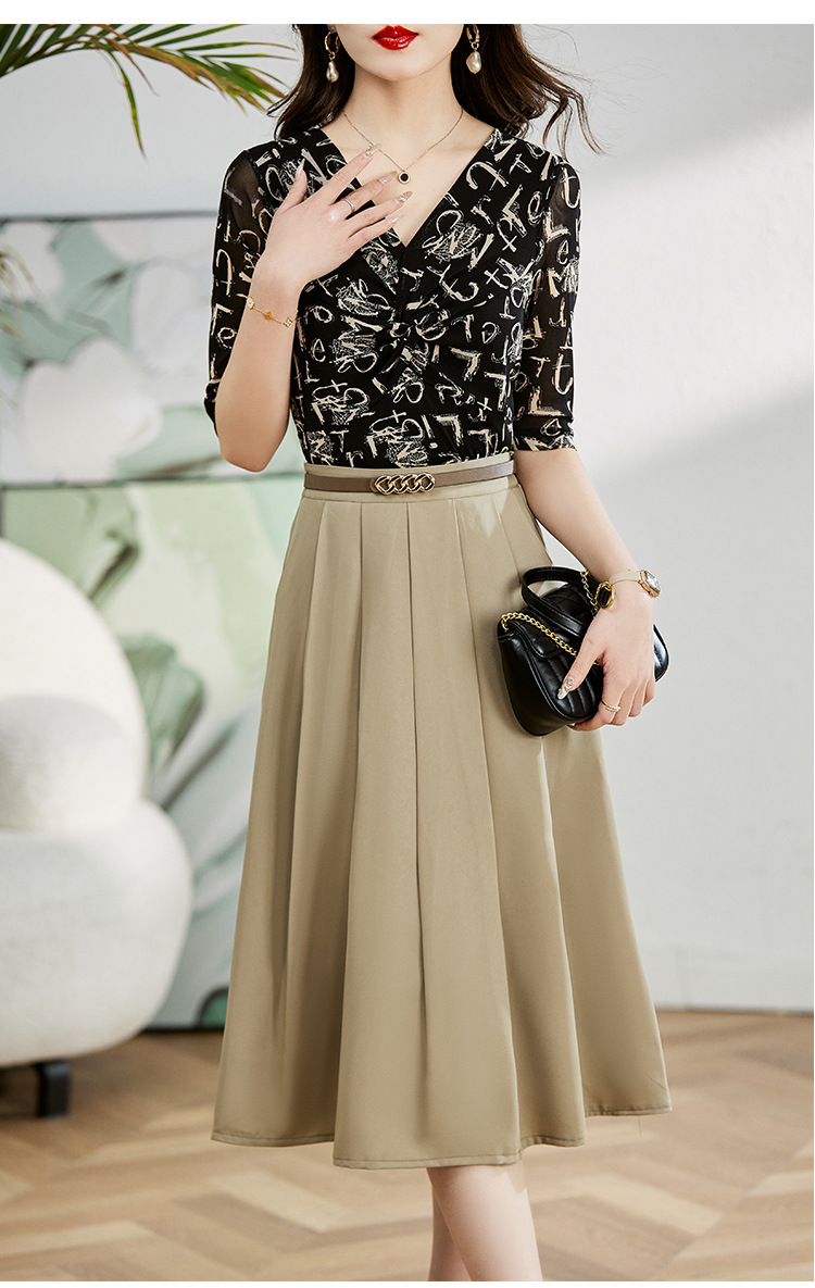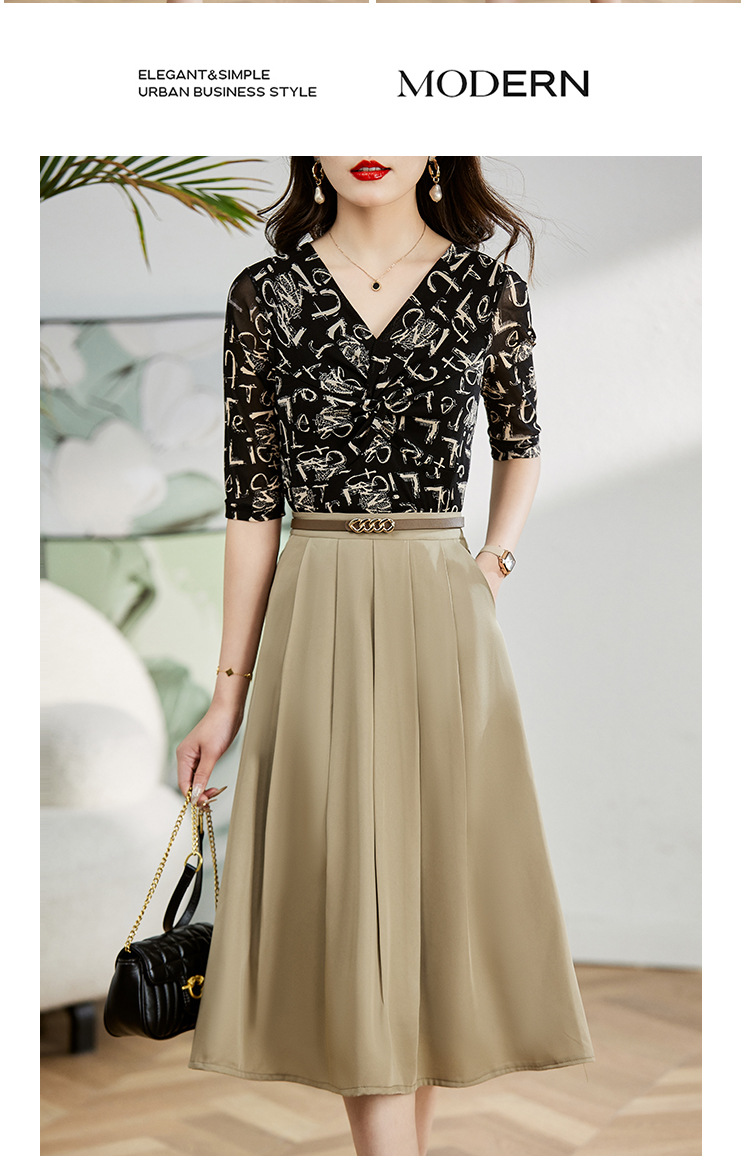 夏季新款,时尚百搭气质感印花V领上衣搭中长款百褶裙两件套HR-WG83189