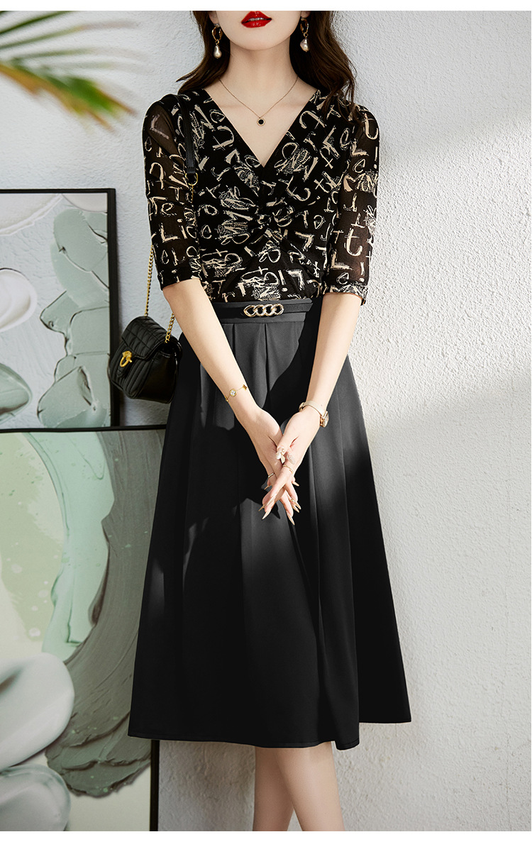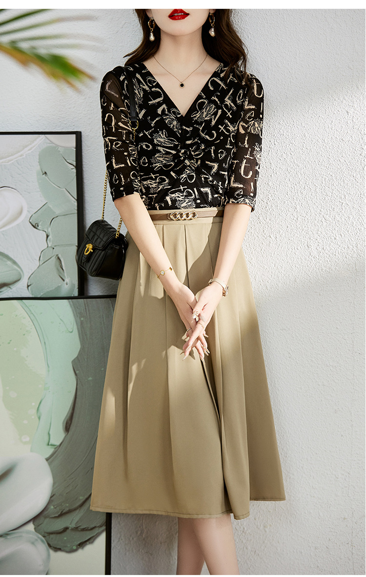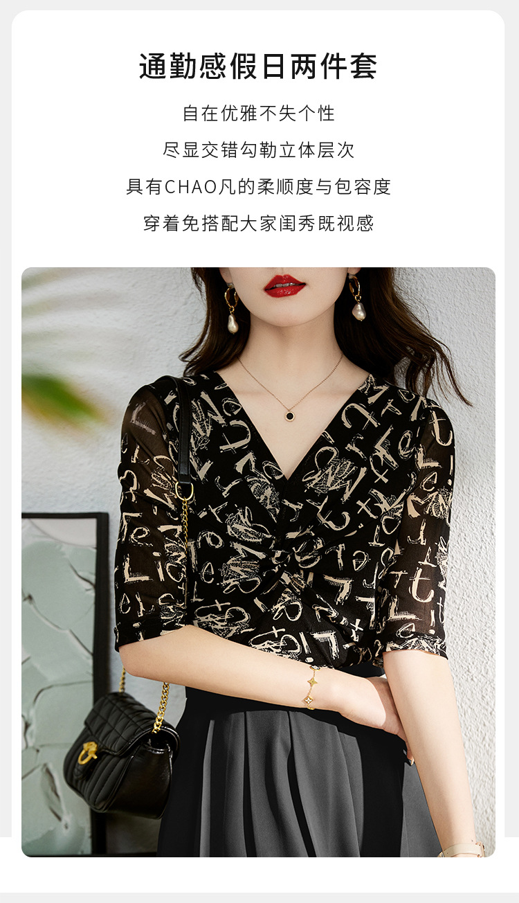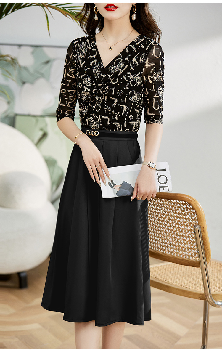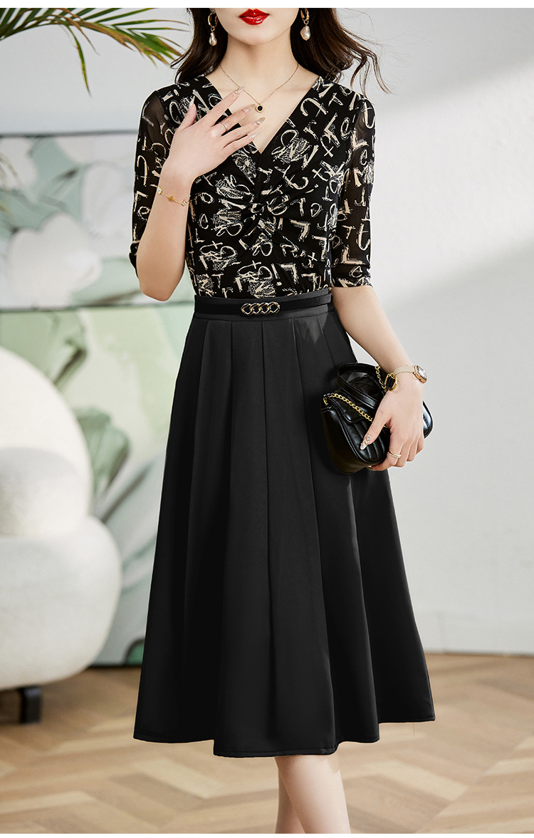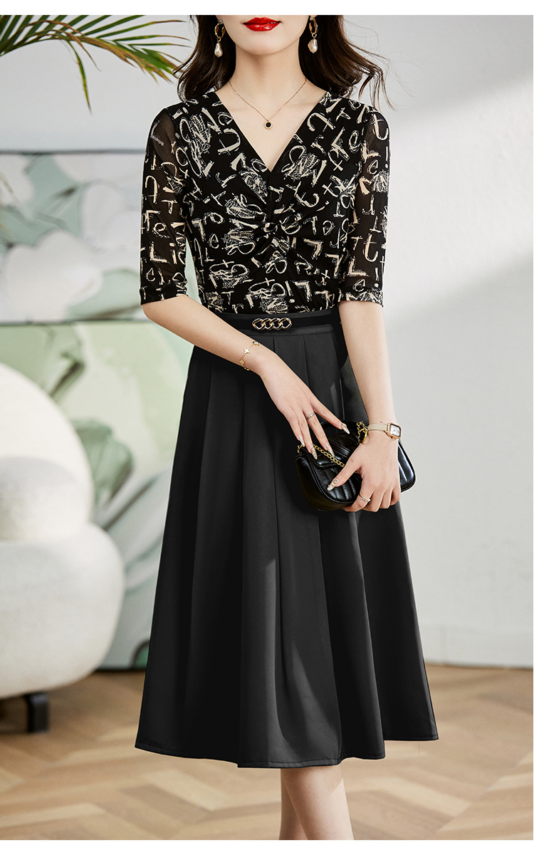 夏季新款,时尚百搭气质感印花V领上衣搭中长款百褶裙两件套HR-WG83189