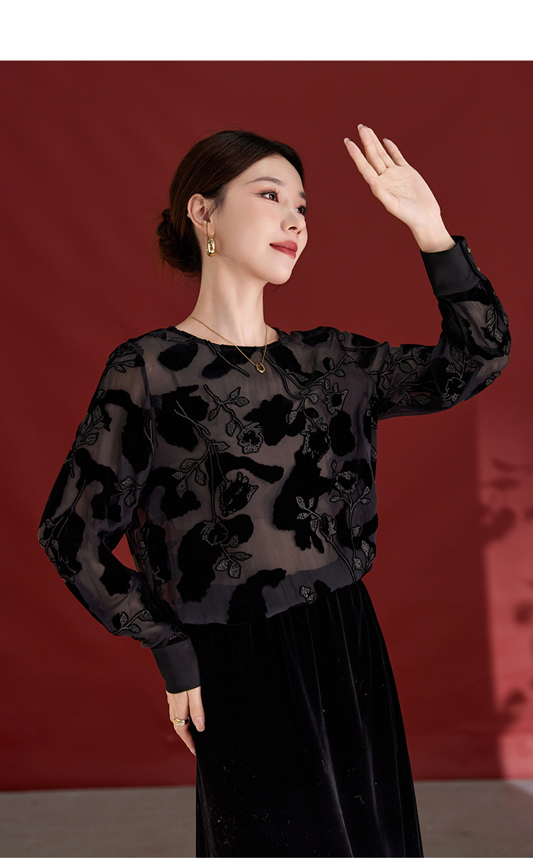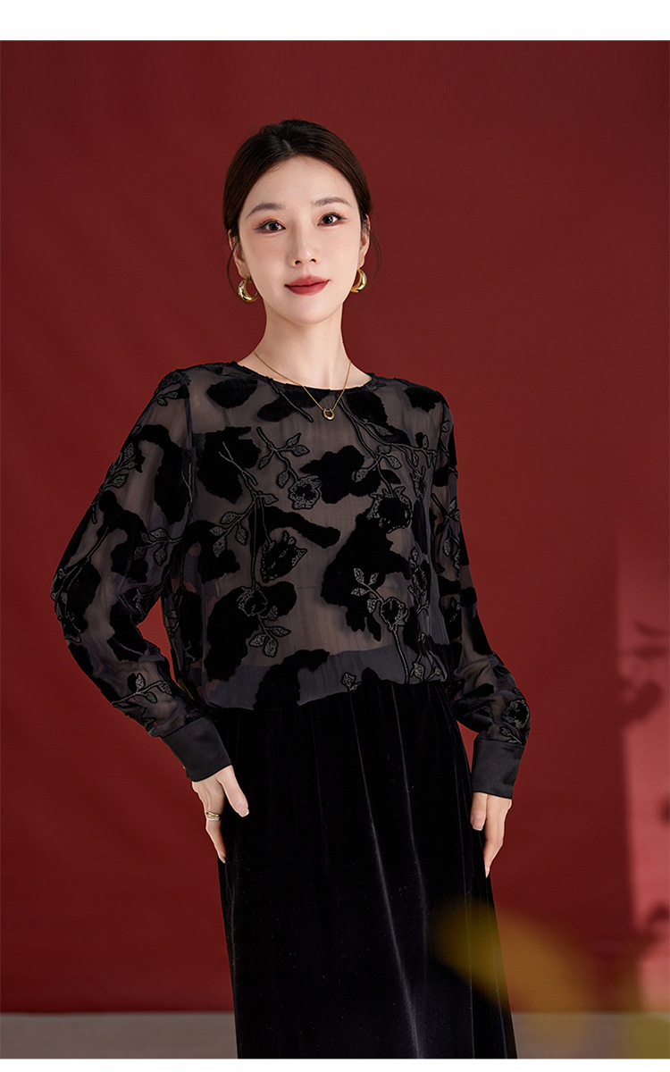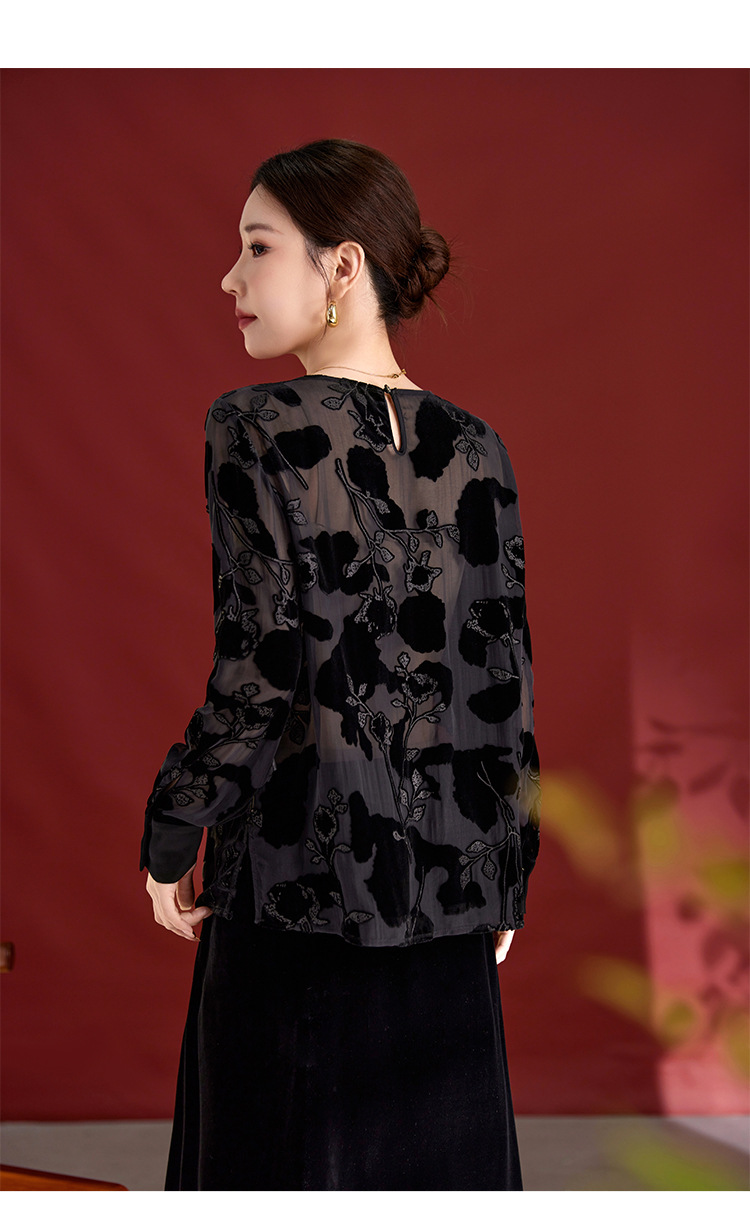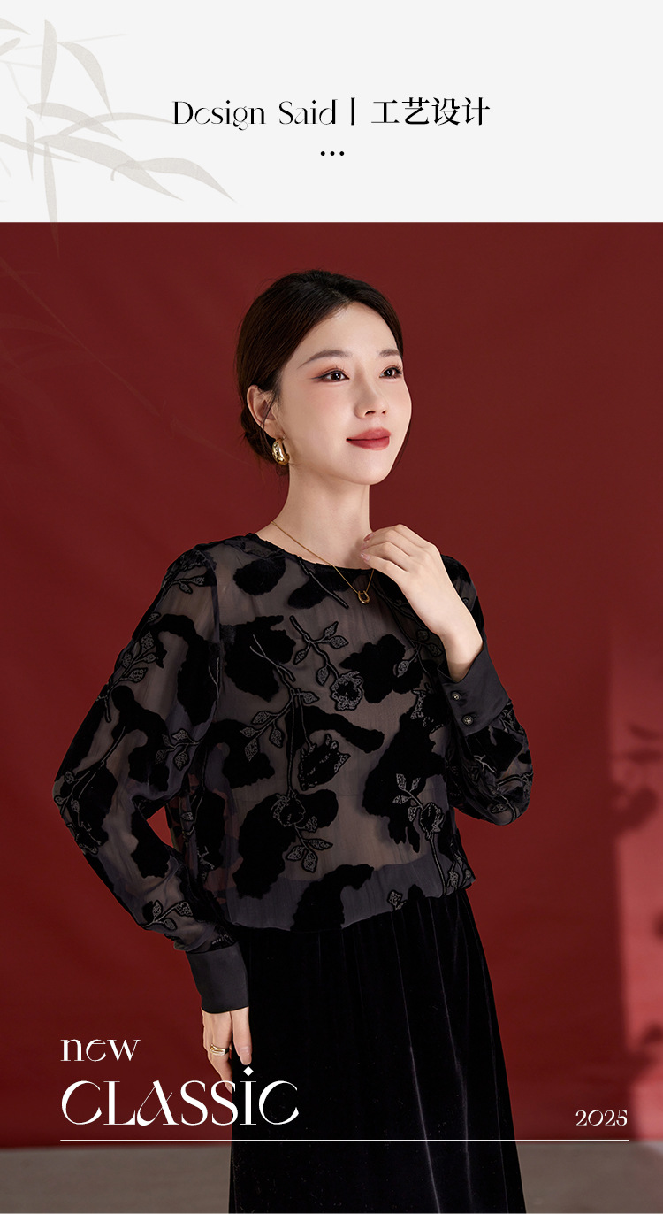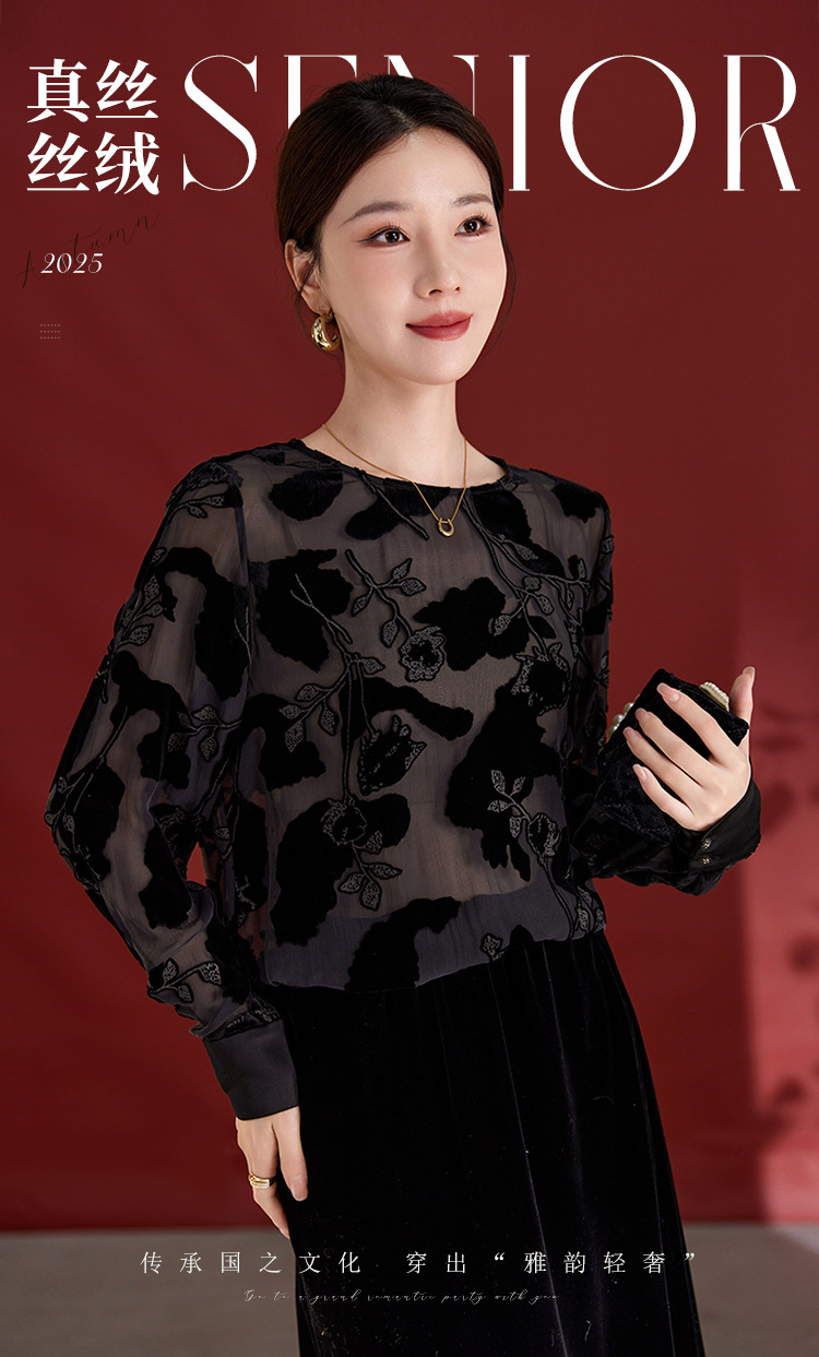 丁摩新款烧花真丝丝绒休闲T恤女时尚轻奢显瘦圆领长袖AL1861