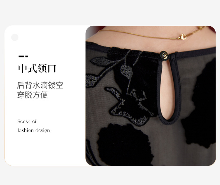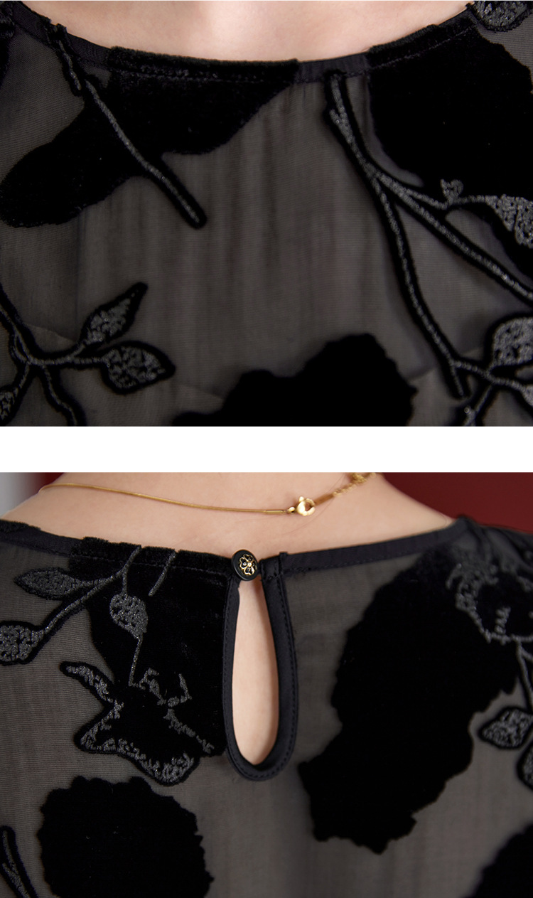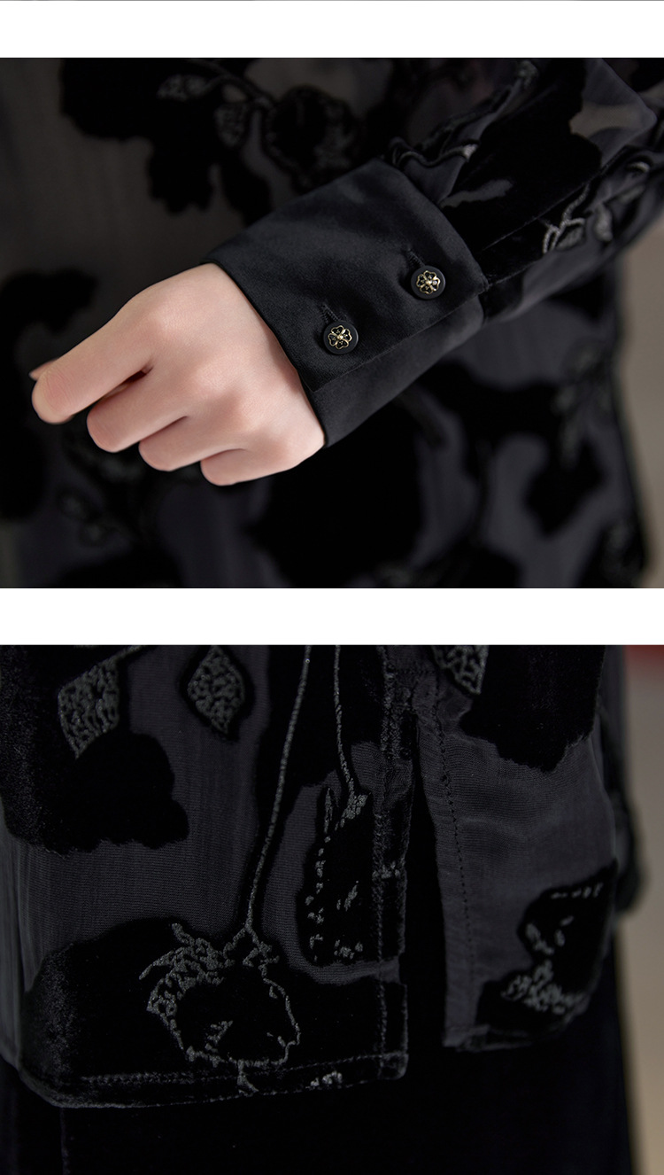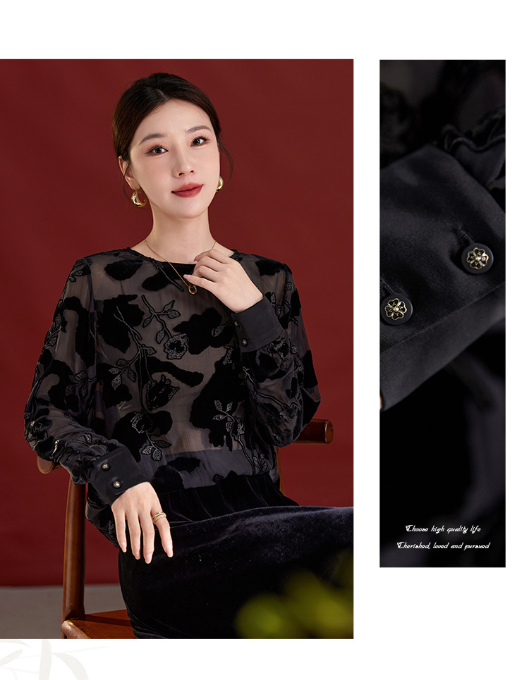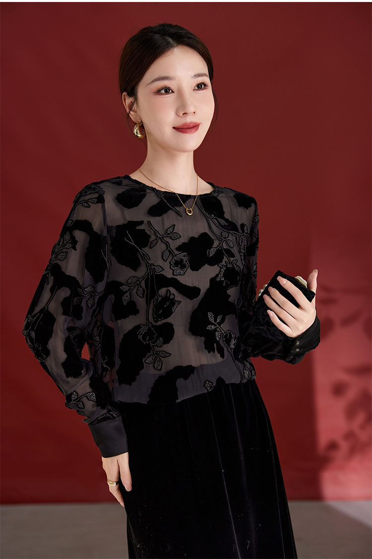 丁摩新款烧花真丝丝绒休闲T恤女时尚轻奢显瘦圆领长袖AL1861