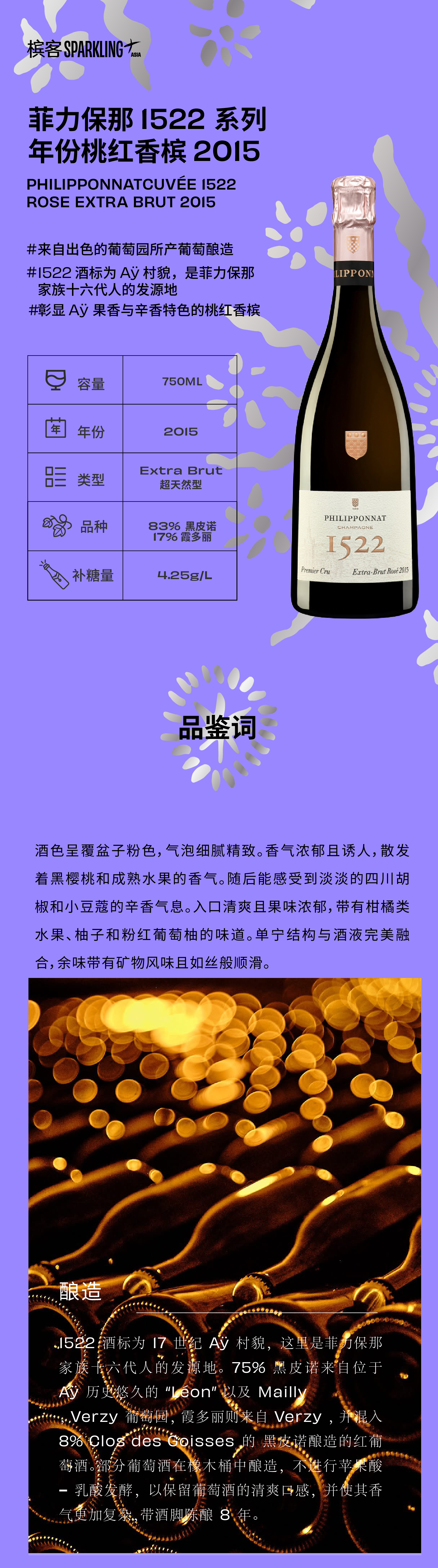Philipponnat Cuvée 1522 Rose Extra Brut 2015 菲力保那1522系列年份桃红香槟 2015