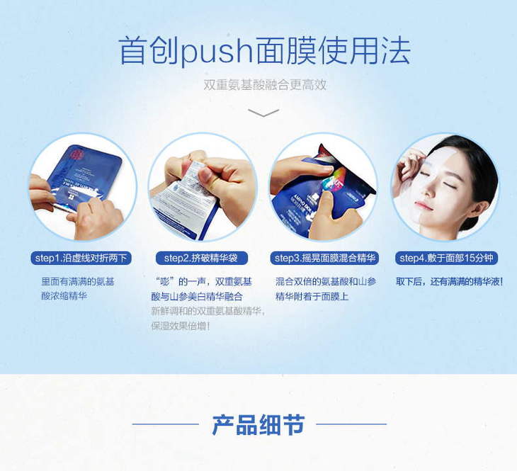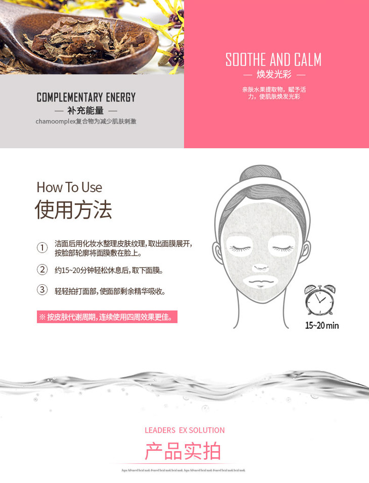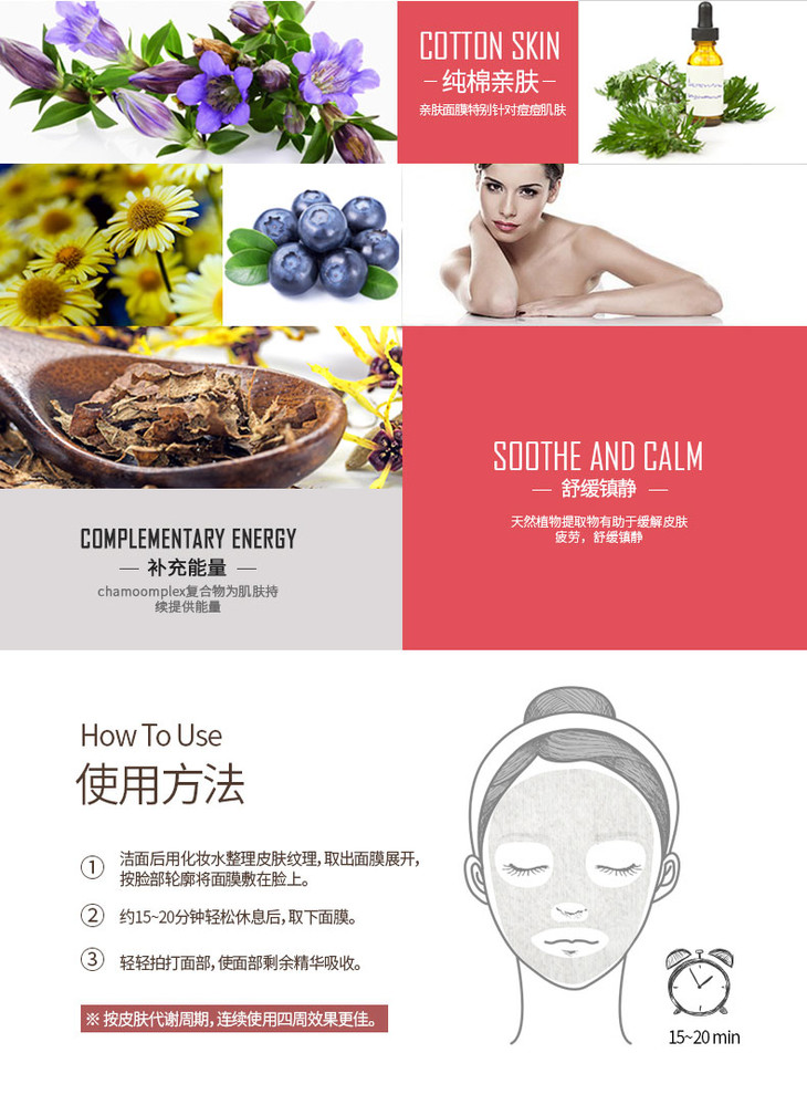 1.开袋即用,初次使用时,连用3天,每天一片,效果更佳,以后可根据肌肤状态,随时随地给肌肤提供即时的养护